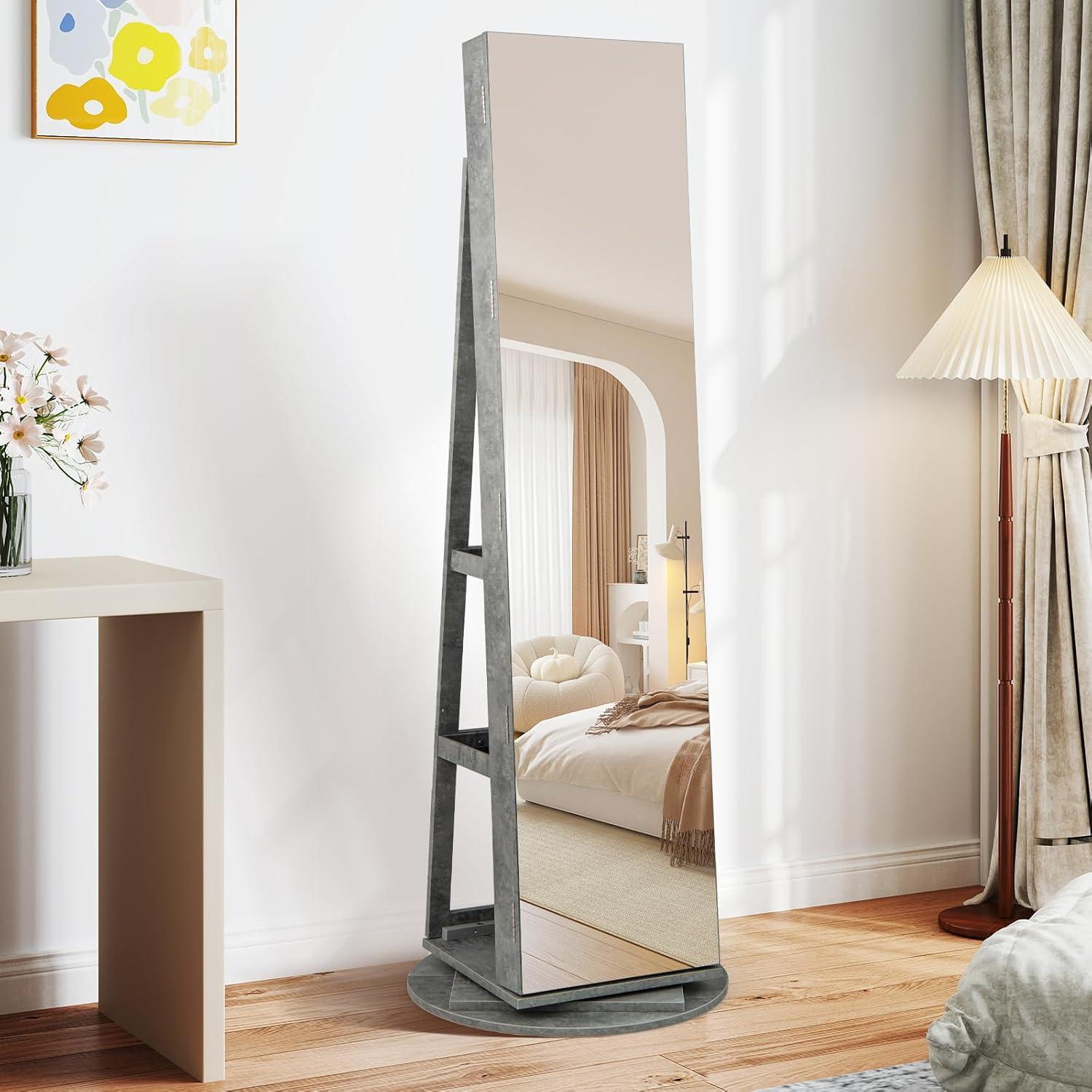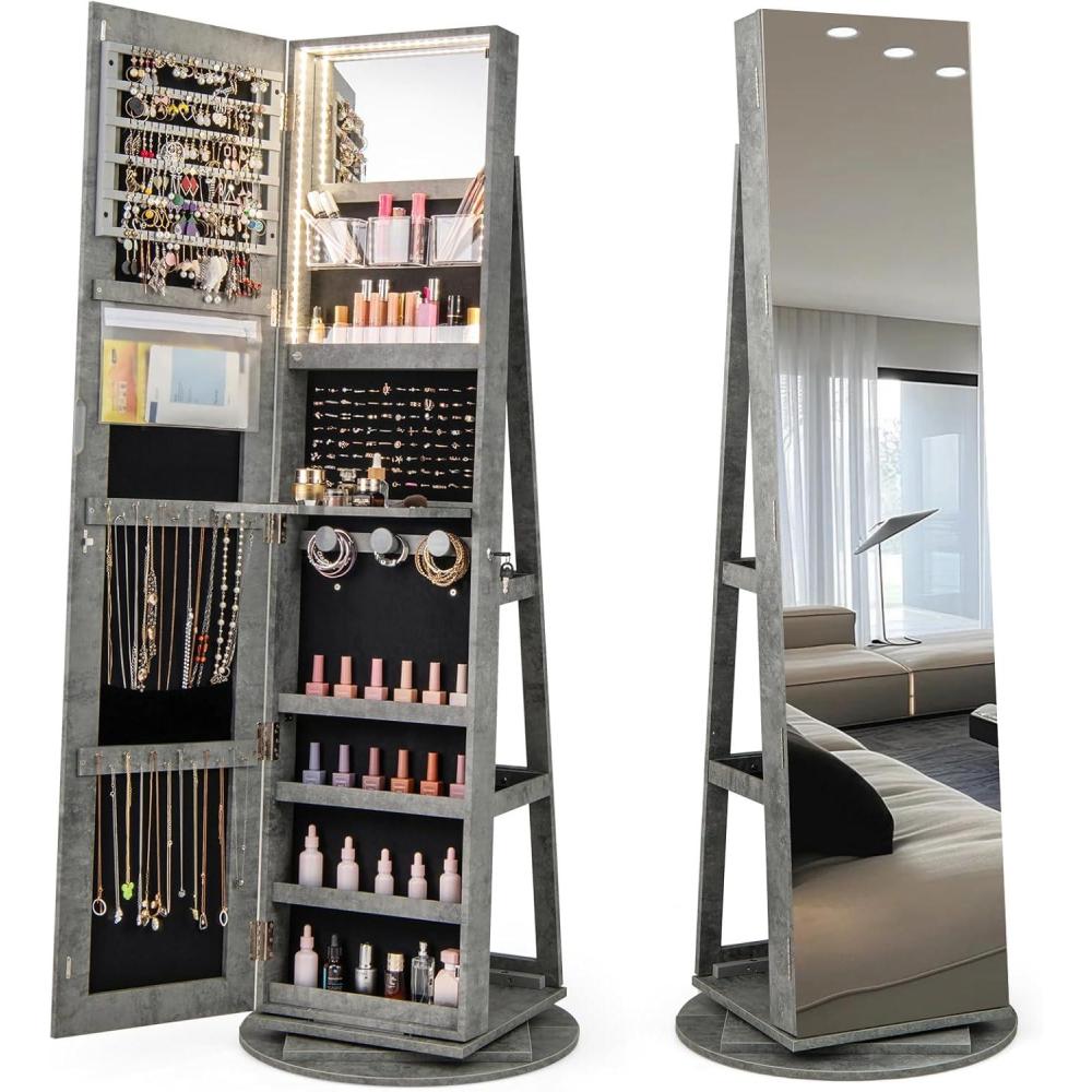 imageCHARMAID 360 Swivel Jewelry Armoire with Full Length Mirror Rear Storage Shelves Lockable Standing Jewelry Cabinet Organizer with Interior Vanity Mirror and 3Color Lights Rustic BrownStone Gray