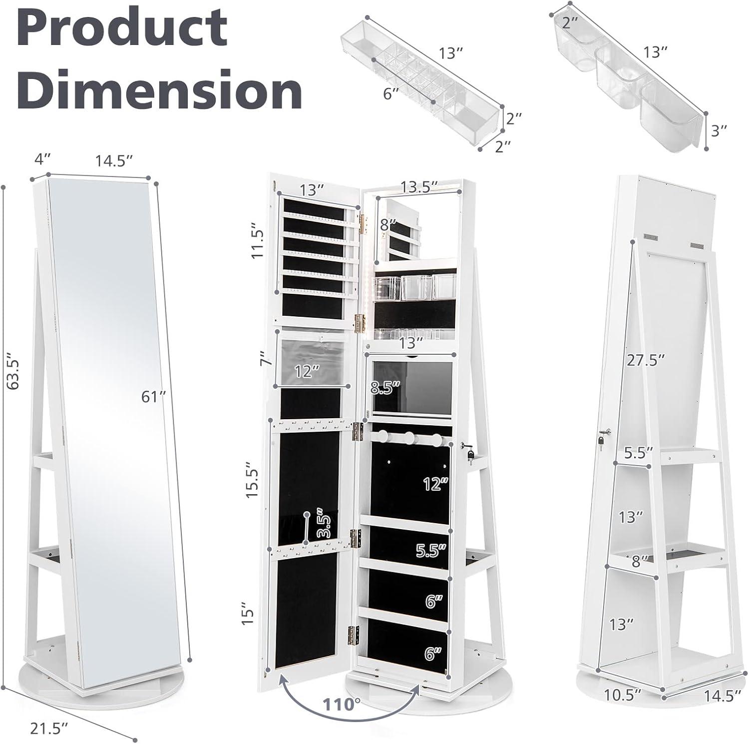 [Tall Full Length Mirror Jewelry Armoire]: Enjoying the dual benefits of jewelry armoire and mirror in one cabinet, this freestanding jewelry cabinet will give you endless fun of dressing up. Extended long mirror (61''H x 14.5''W) offers you a head-to-toe view of your outfit in real image and you can storage all jewelry in order with this jewelry armoire.