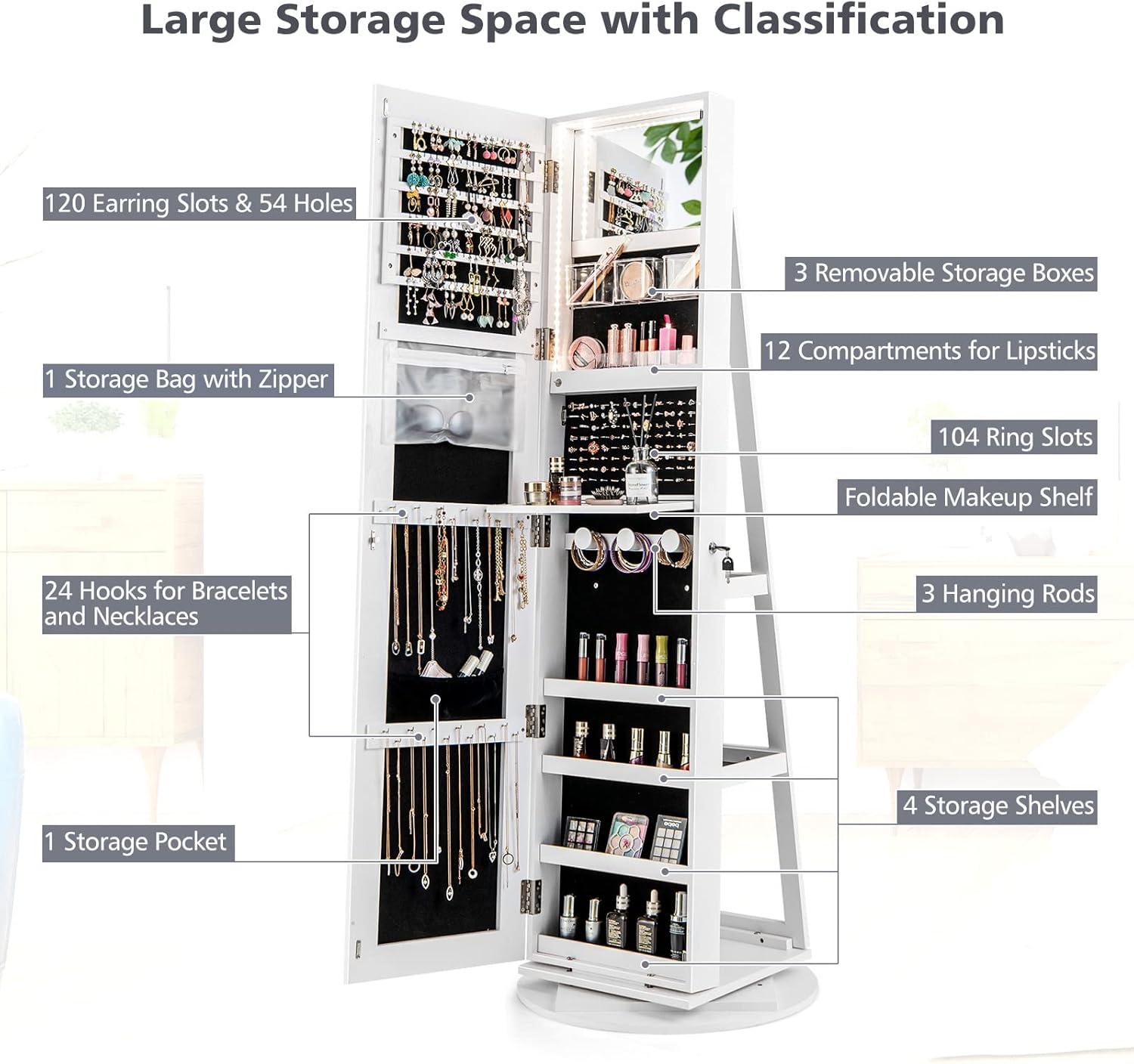 [360° Swivel Base & 3 Back Storage Shelves]: Enjoying with the 360 degree swivel base, the mirrored jewelry organizer is more flexible to meet your different needs. 3 back storage shelve of the jewelry cabinet can store your handbag, books or other items, and they can also make the jewelry organizer more stable.