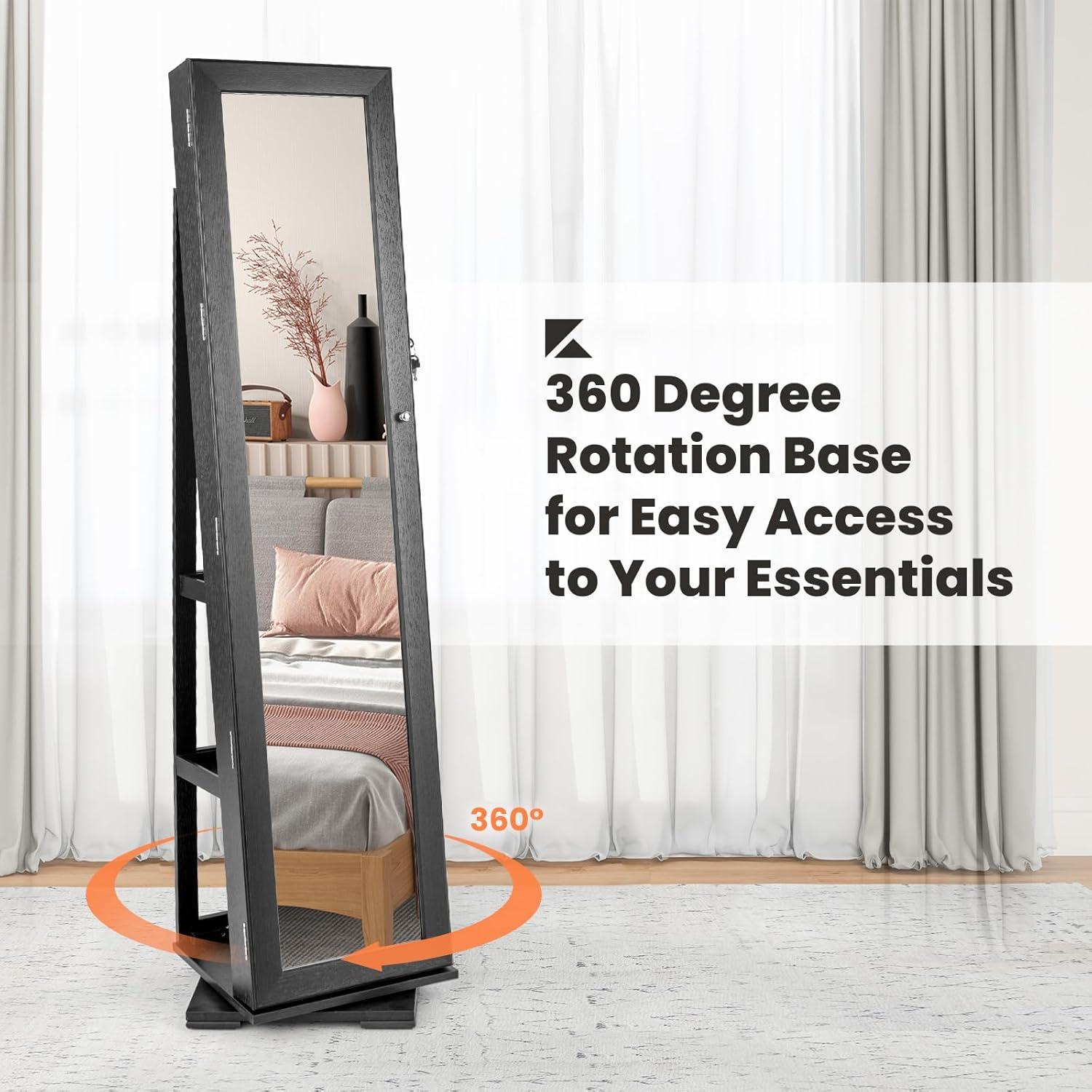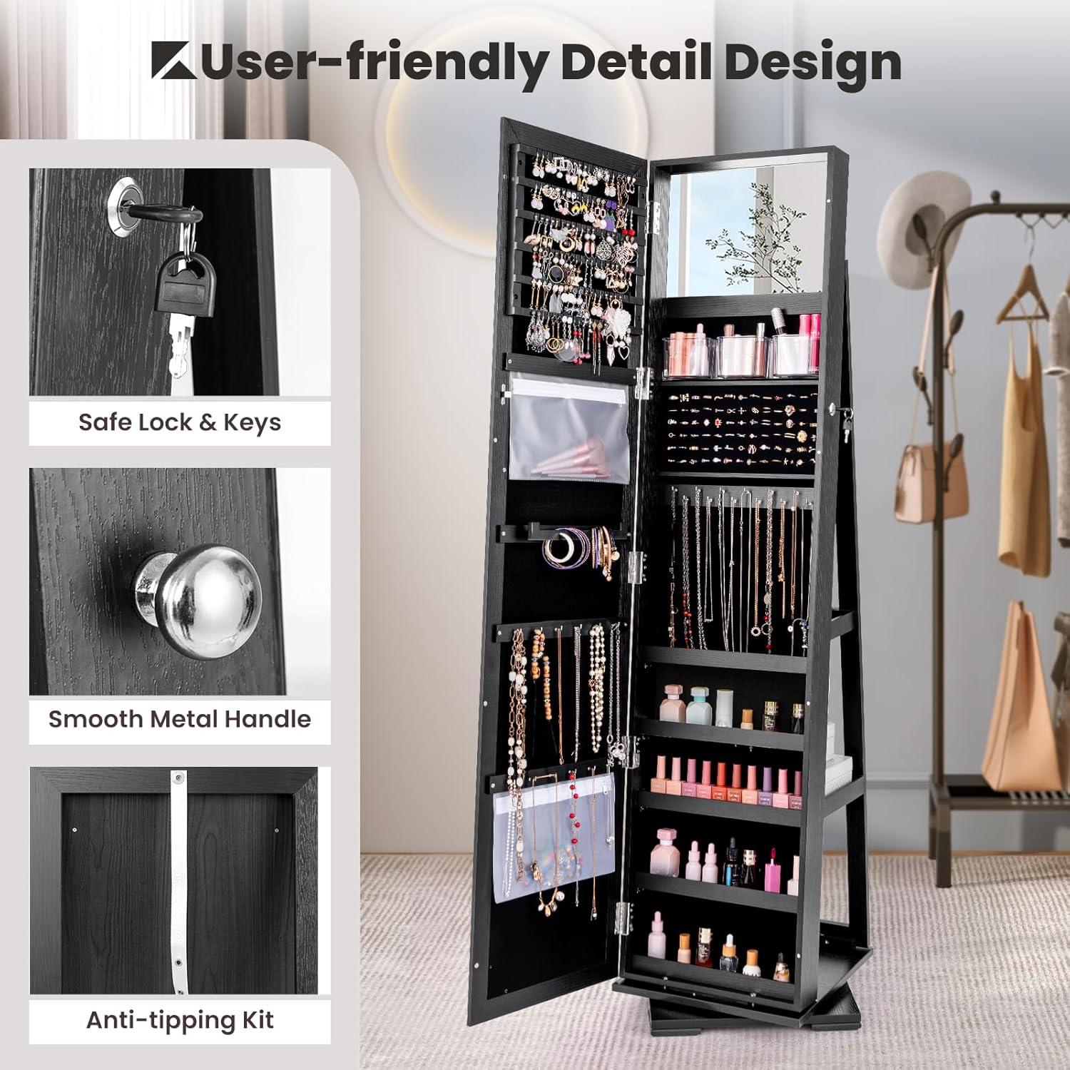 CHARMAID 360° Swivel Jewelry Armoire with Higher Full Length Mirror, Standing Lockable Jewelry Cabinet Organizer, Large Storage Capacity, Inside Makeup Mirror, Back Storage Shelves (Rustic Brown)(Black)