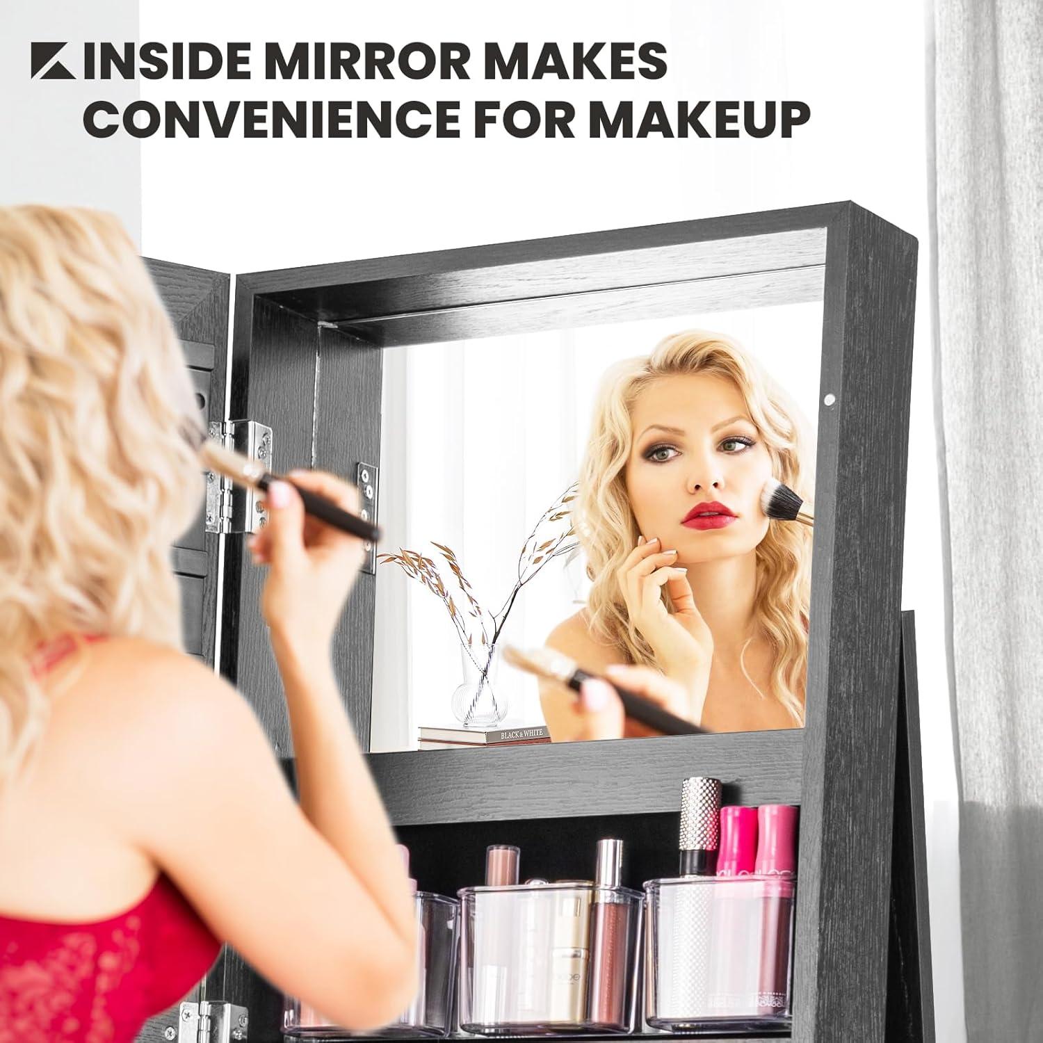 [2-in-1 Mirror Jewelry Armoire]: Enjoying the dual benefits of jewelry armoire and mirror in this cabinet, this freestanding jewelry cabinet will give you a lot of fun of dressing up. Higher full length mirror offers you a head-to-toe view of your outfit in real image and you can storage all jewelry in order with this jewelry armoire.