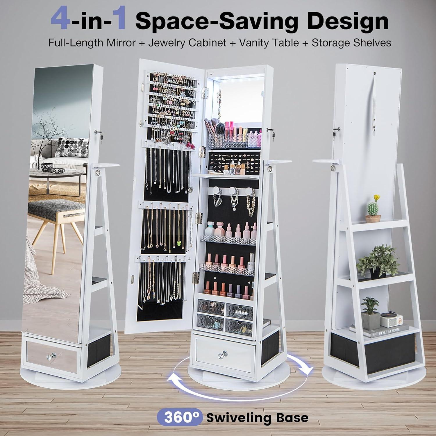 【64.5″ Tall Full-Length Mirror & 360° Swivel Base】: This freestanding jewelry armoire with frameless full length mirror offers a head-to-toe view from any angle. With dual functionality as a mirror and jewelry armoire, it brings endless dressing up possibilities.