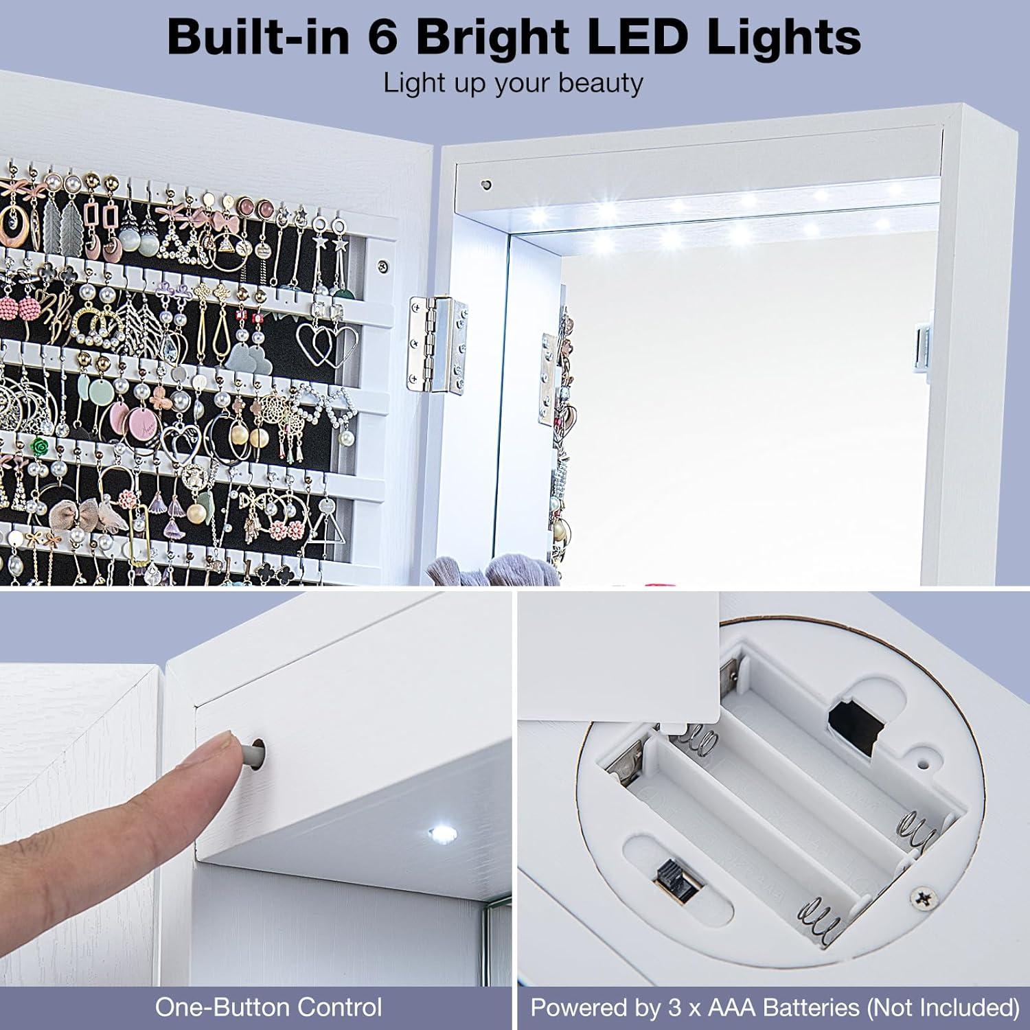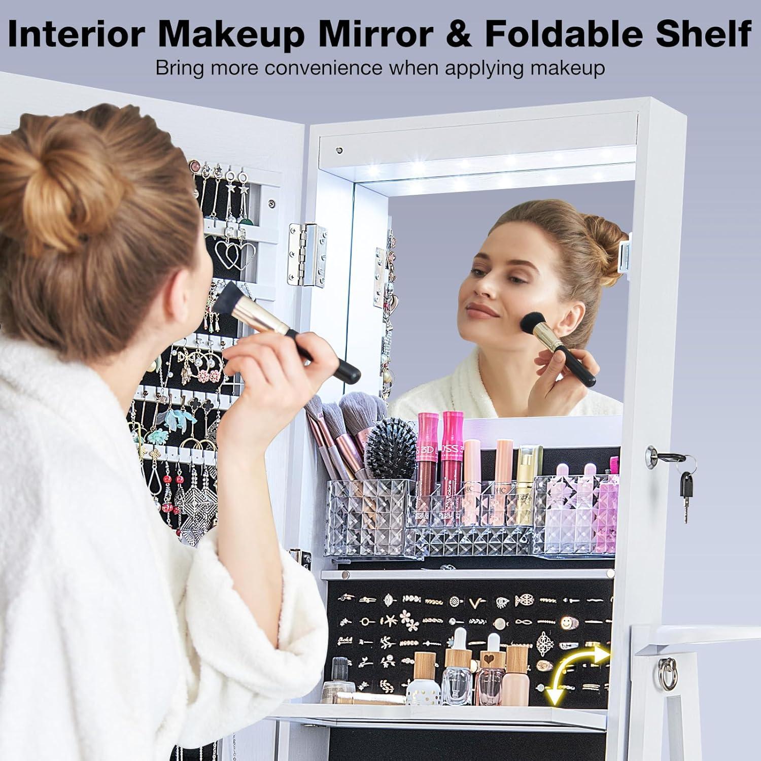 【Enhanced Makeup Experience】: Our jewelry organizer features 6 built-in LED lights, providing ample illumination for your makeup needs. The interior makeup mirror and foldable shelf add convenience to your beauty routine. (Please note that the LED lights require 3 AAA batteries, not included).