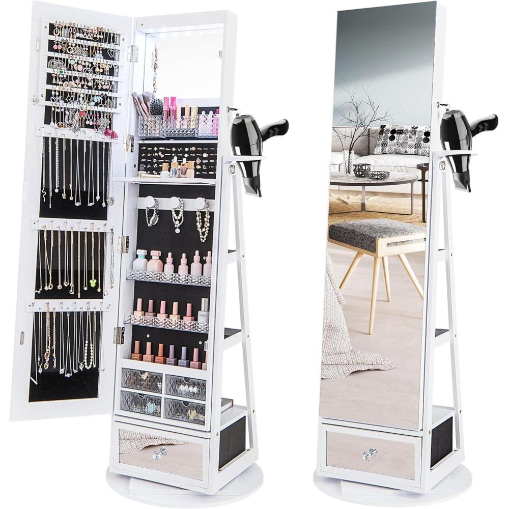 imageCHARMAID 360 Swivel Jewelry Cabinet Armoire 645quot H Full Length Mirror with Jewelry Storage 6 LEDs Lockable Jewelry Organizer Rear Storage Shelves Large Drawer Hairdryer Holder BlackWhite