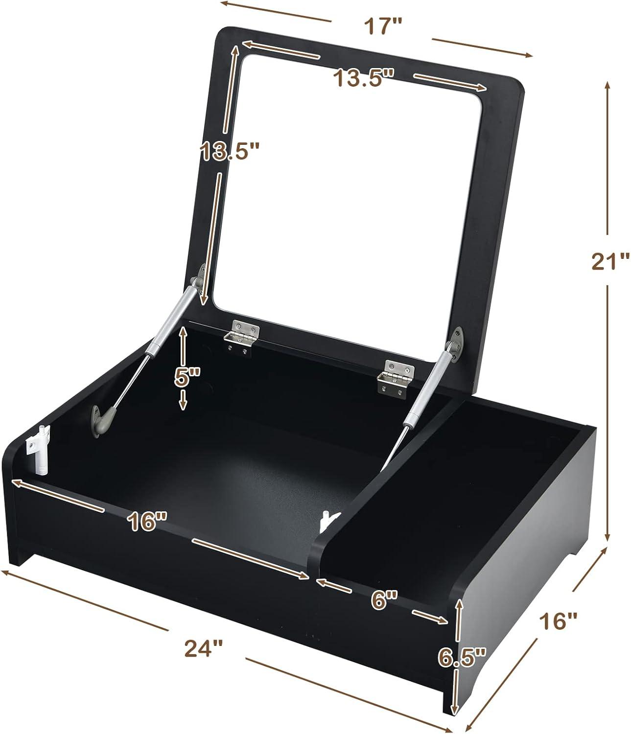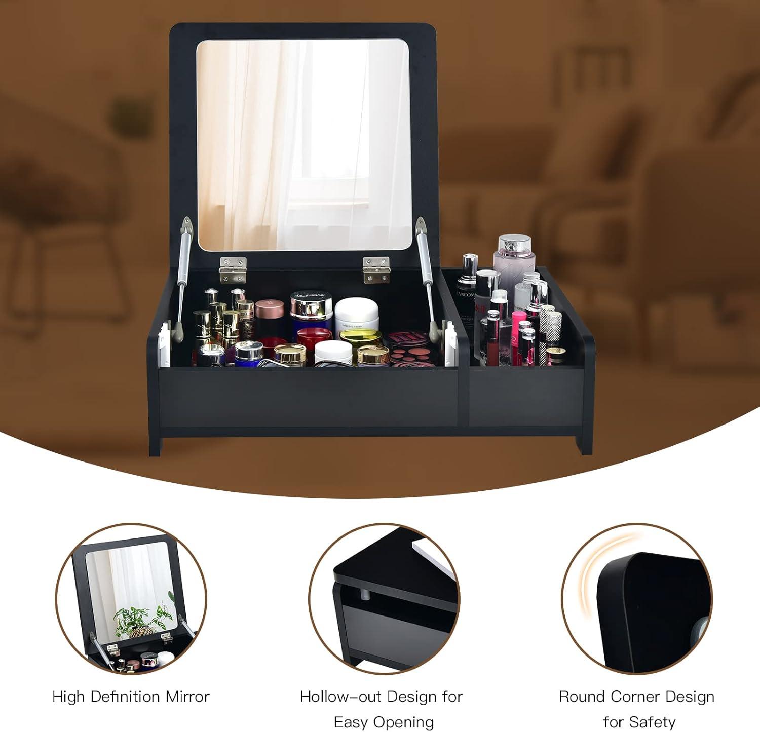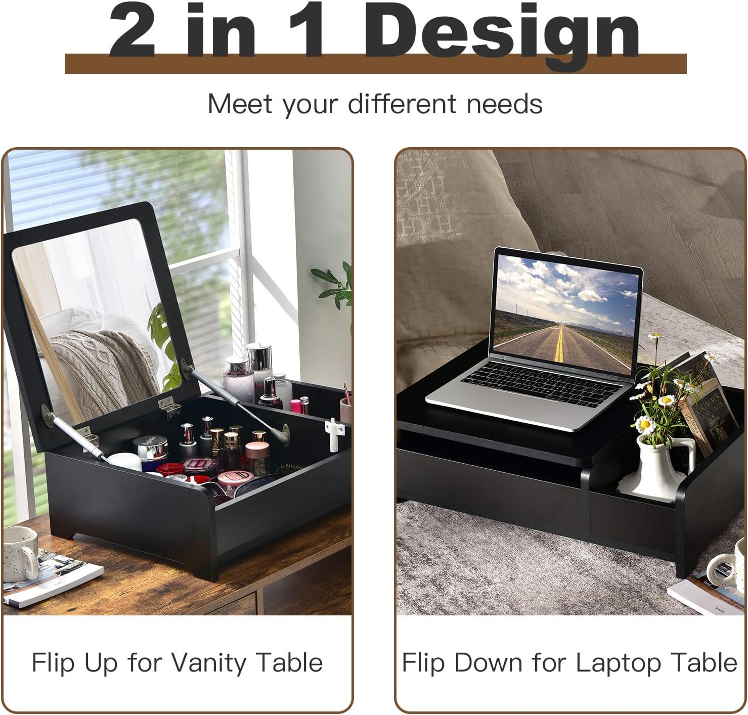 【Flip Top Mirror for Dual Use】: Featuring a flip-top design, the mirror of this countertop vanity table is easy to flip up and down for your daily makeup. And you can put down the mirror to use it as a laptop desk conveniently.