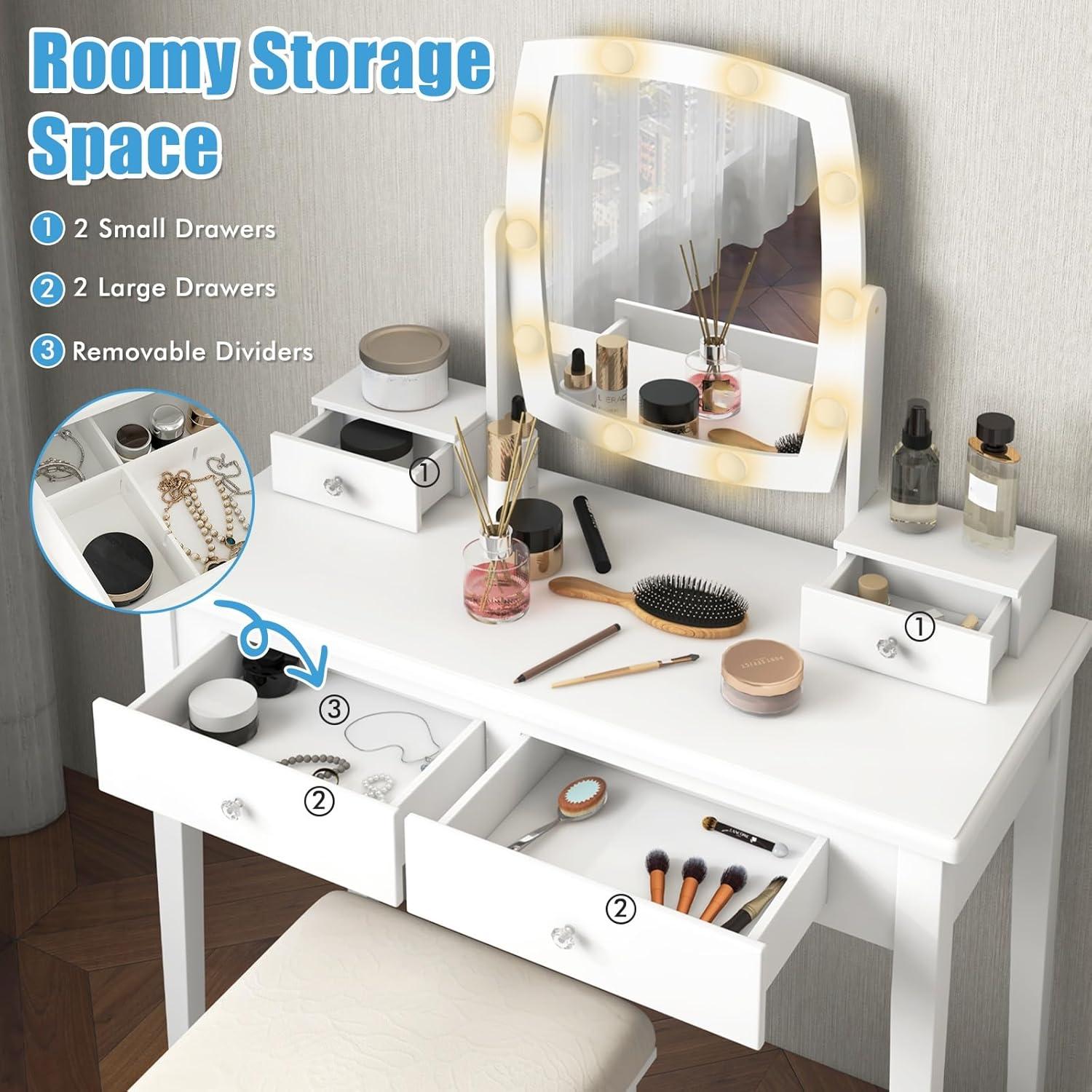 CHARMAID Girls Makeup Vanity Desk with Mirror and Lights, Vanity Table with 10 LED Bulbs, 3 Lighting Modes, Modern Bedroom Dressing Table with 4 Storage Drawers & Vanity Stool (Black)(White)