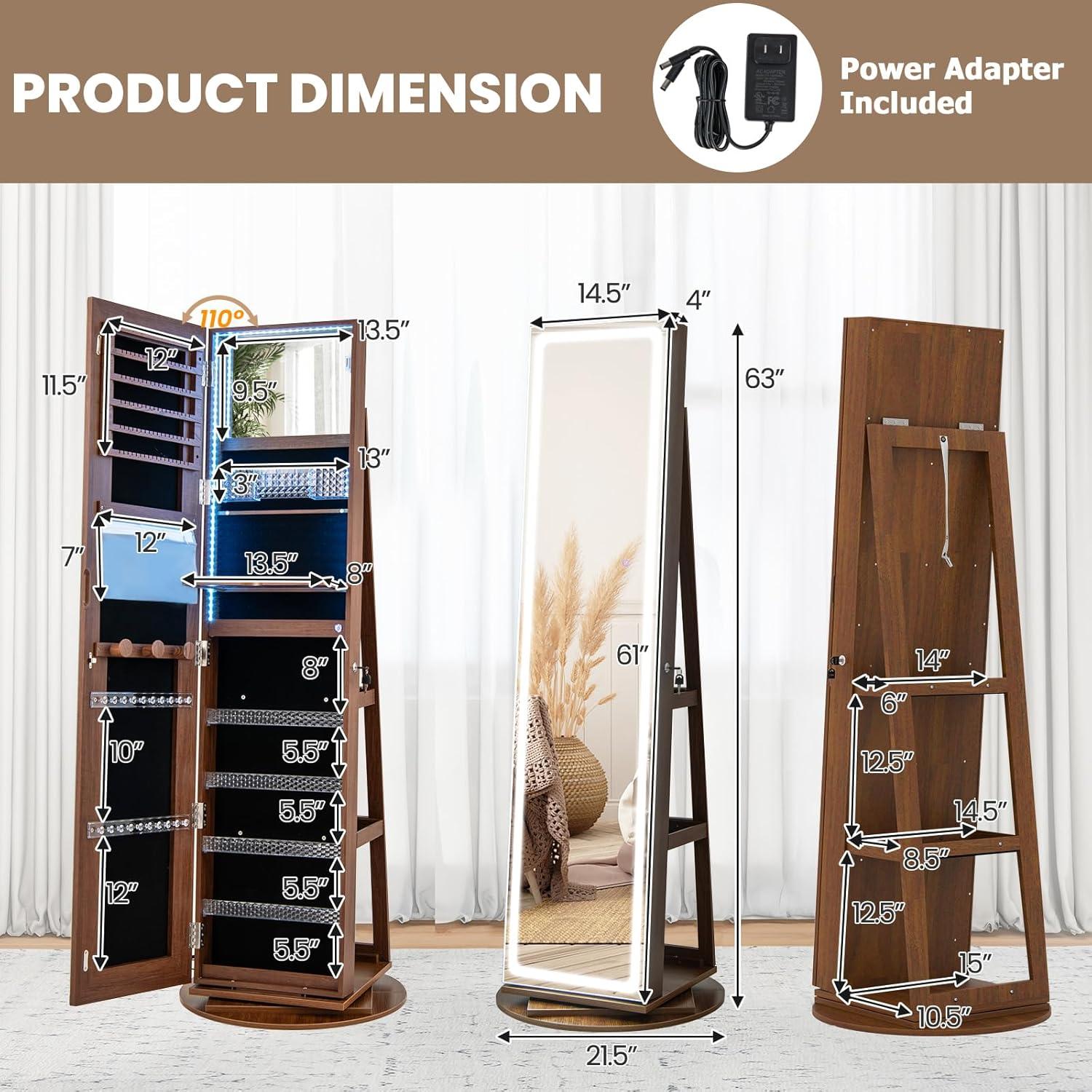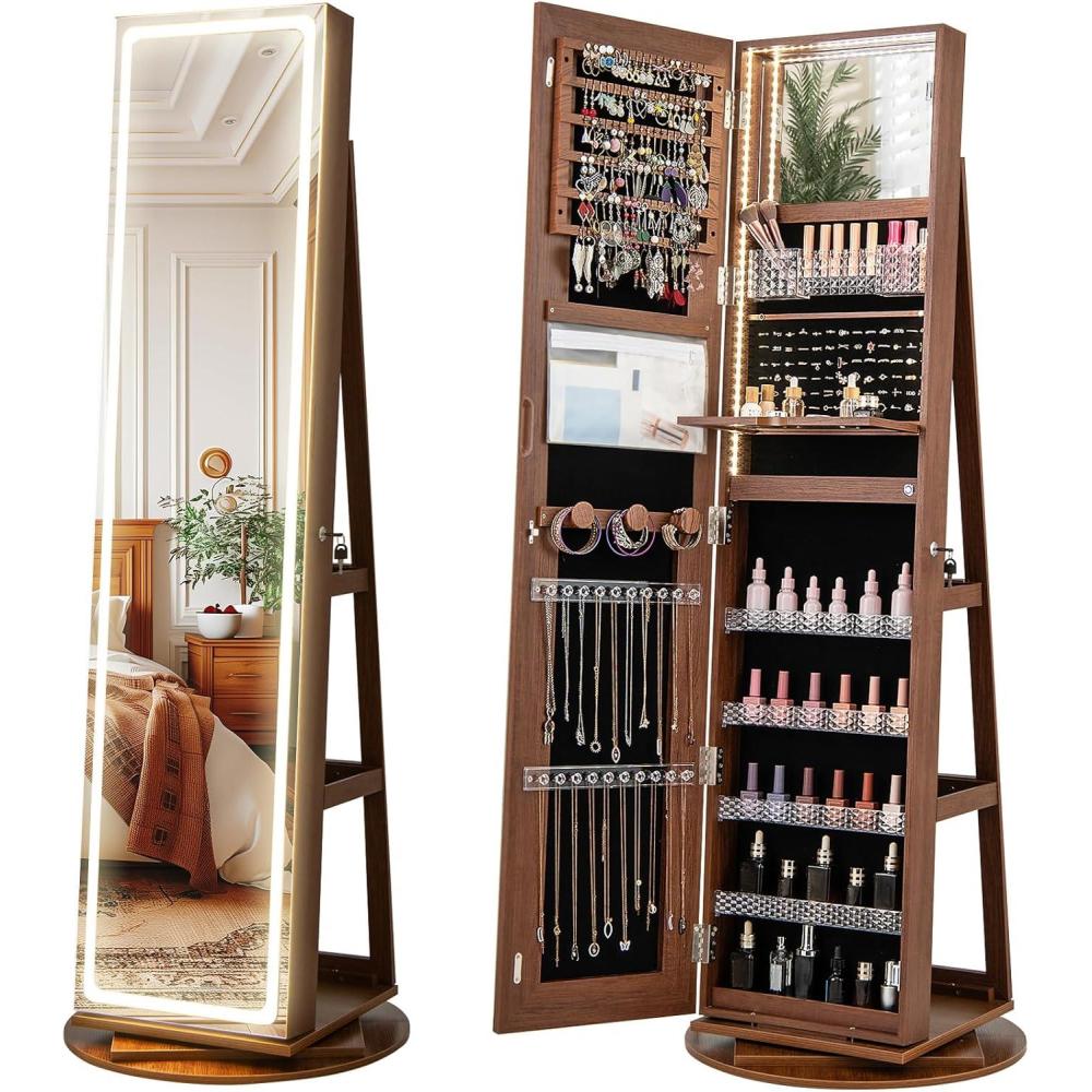 [Full Length Mirror]: This versatile freestanding jewelry cabinet combines the benefits of a mirror and a jewelry armoire in one sleek design. With a spacious mirrored door, you can easily view your entire outfit in a real image. Keep all your jewelry organized and easily accessible with this stylish and functional jewelry armoire.