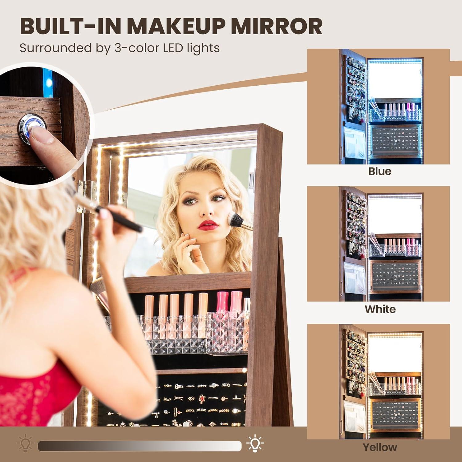 [3-Color LED Lights]: This jewelry armoire features an automatic LED strip that turns on when the door is opened. The LED light can be adjusted to provide natural white, cold blue, or warm yellow lighting, catering to your specific makeup requirements. (Batteries required, 3 AAA, not included).