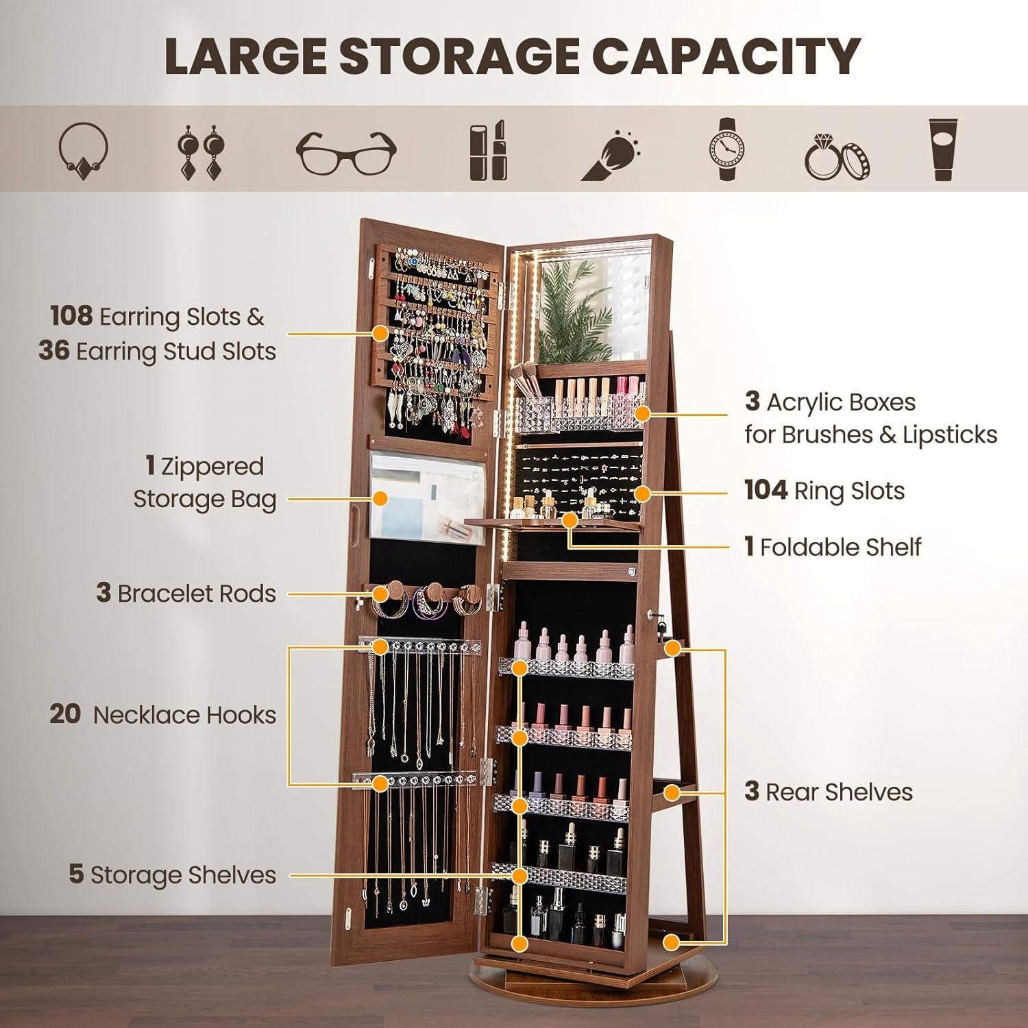 [Ample Jewelry Storage]: The jewelry cabinet offers classified storage for all your jewelry, cosmetics and accessories, which includes 108 earring slots, 36 earring stud holes, 65 ring slots, 30 necklace hooks, 7 storage compartments for brushes and lipsticks, 2 storage bags, 1 bracelet rod, 5 removable and adjustable acrylic storage shelves, 1 fixed storage shelf and 3 storage shelves backside.