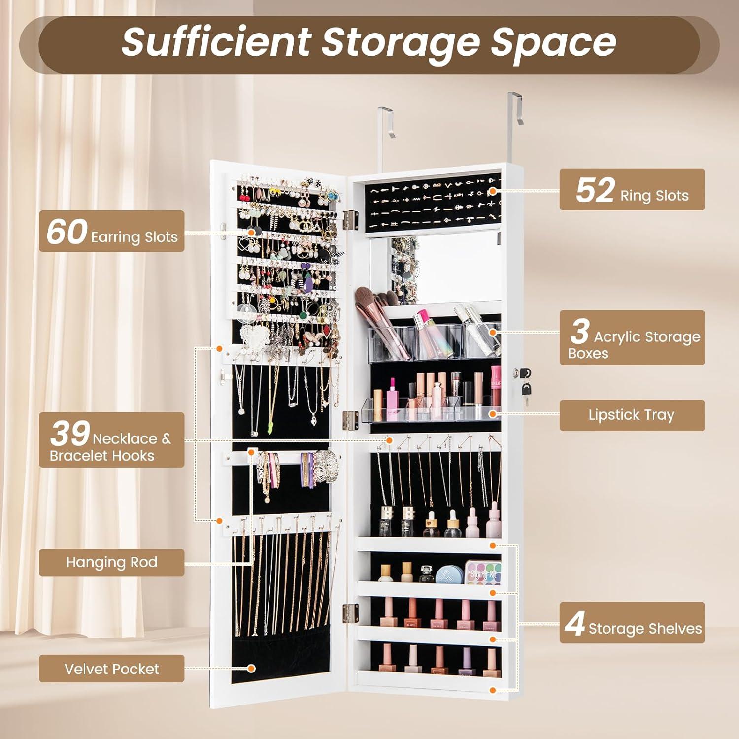 This versatile jewelry armoire combines style and functionality. The full-length mirror provides a clear reflection for checking your outfits, while the interior mirror is perfect for makeup application. The spacious storage organizer is designed to accommodate all your accessories, featuring 60 earring slots, 52 ring slots, 39 necklace and bracelet hooks, 4 storage shelves, 3 acrylic storage boxes, 1 hanging rod, 1 velvet pocket, and 1 lipstick tray. For added convenience, it includes a cut-out handle, magnetic catch, and lockable doors for secure and easy access. The armoire can be mounted on the wall with expansion screws or hung over a door using adjustable hangers, making it a space-saving solution for any room.
