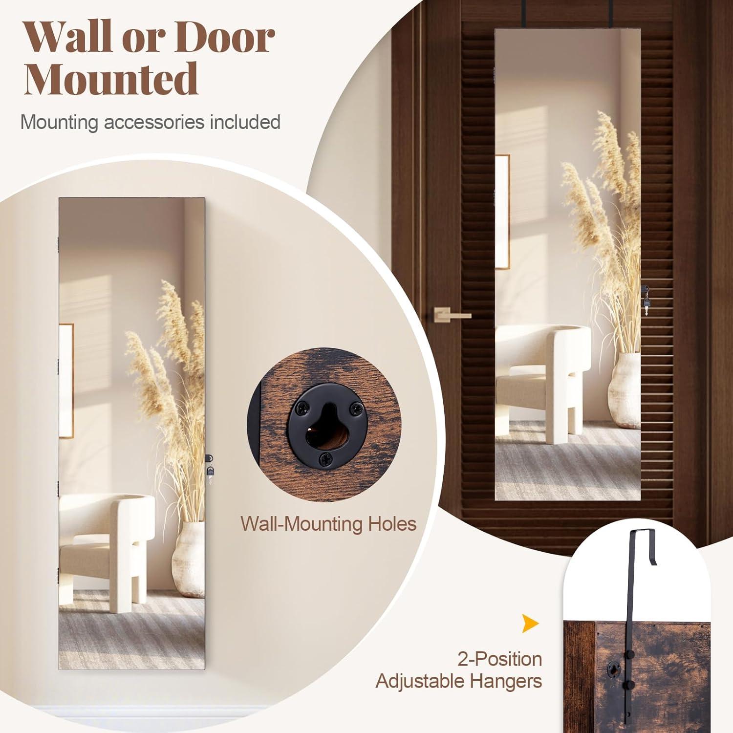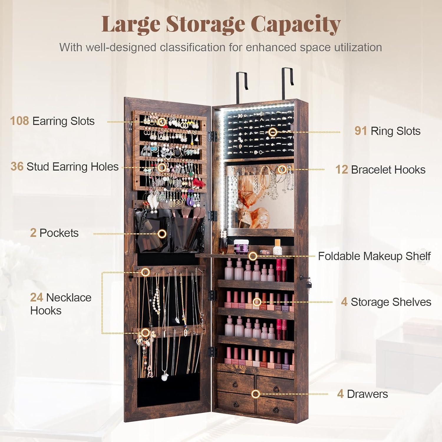 CHARMAID LED Strip Jewelry Armoire with 47.2" H Full Length Mirror, Wall/Door Mounted Jewelry Organizer with Built-in Mirror, Flip-over Cosmetic Tray, 4 Drawers, Large Storage Jewelry Cabinet (Black)(Rustic Brown)