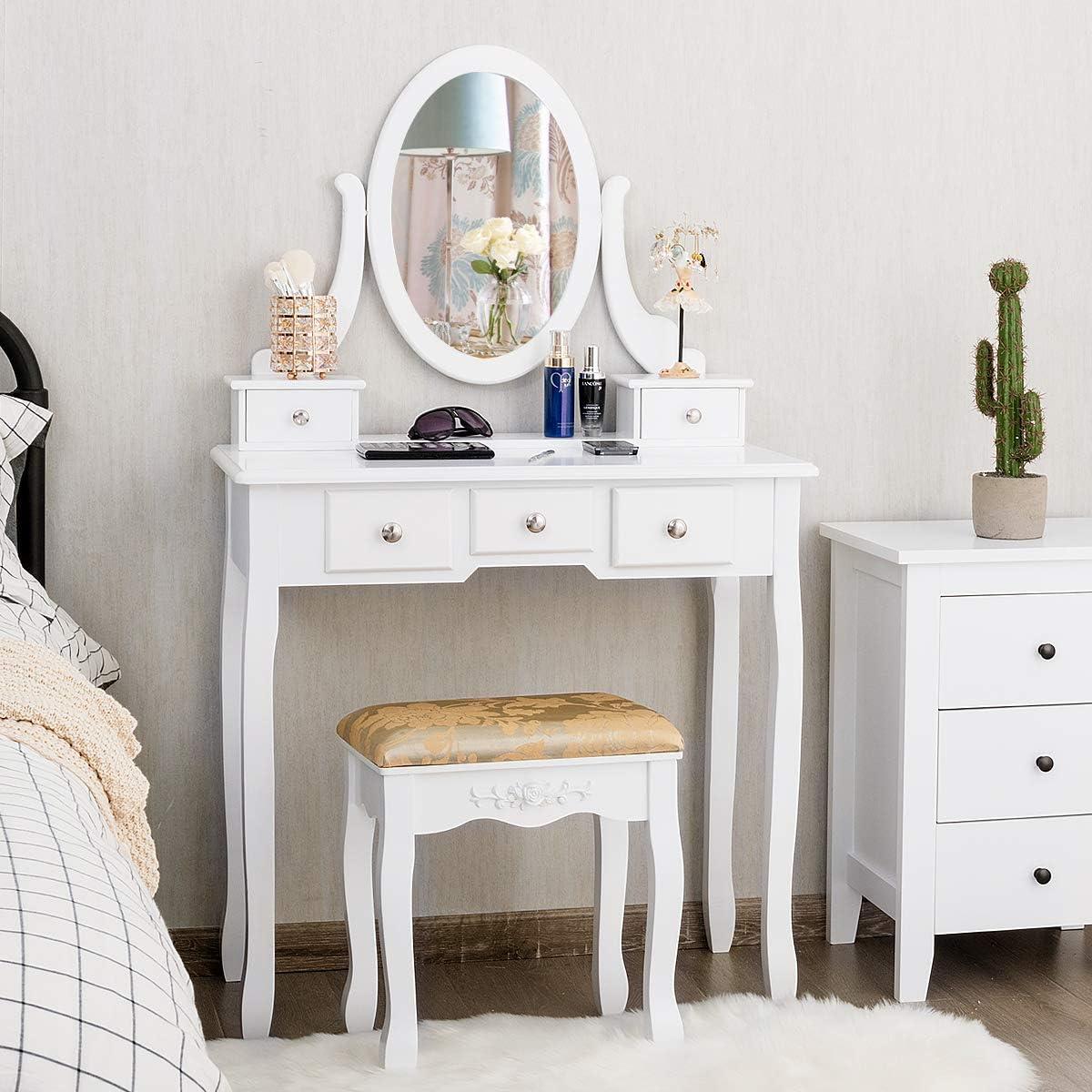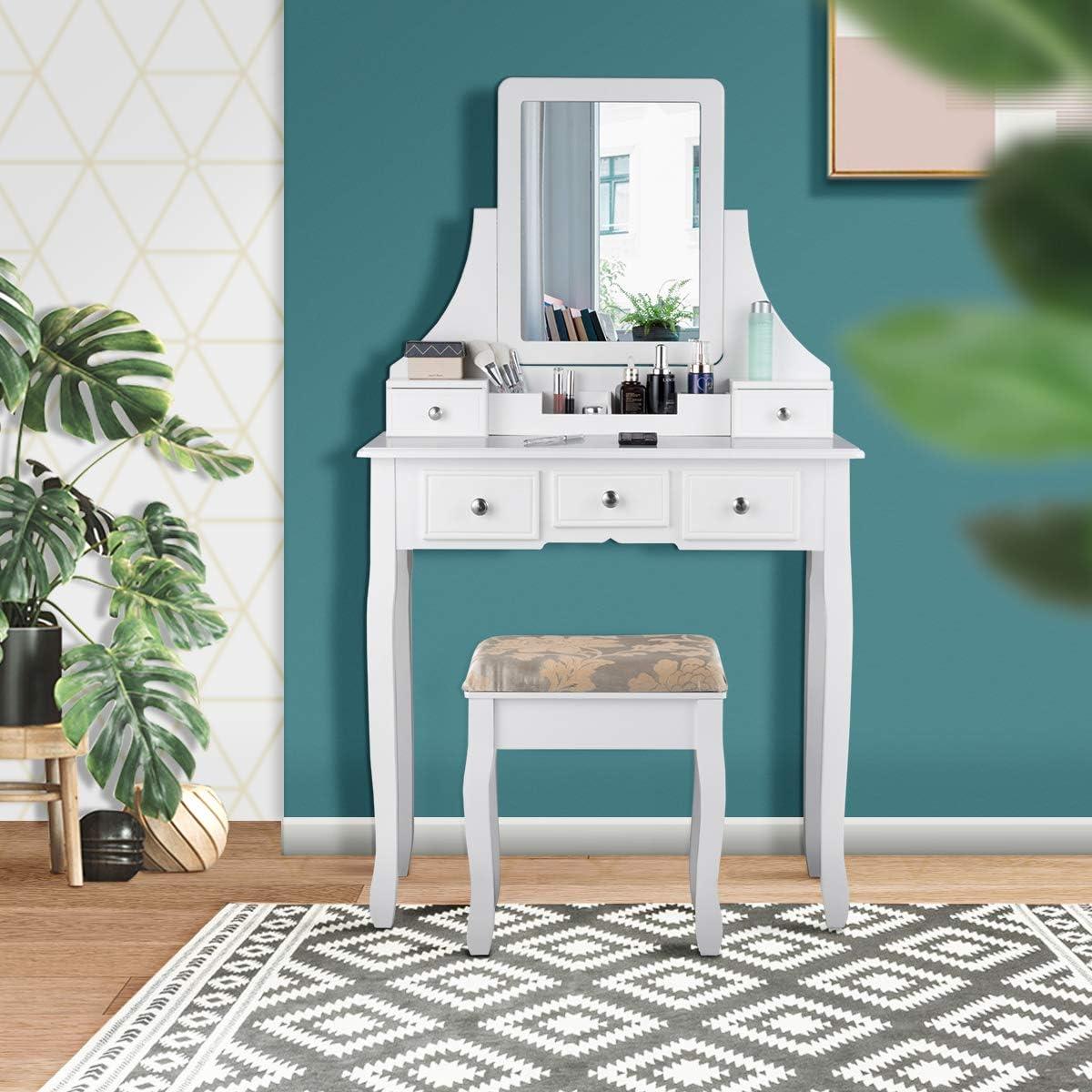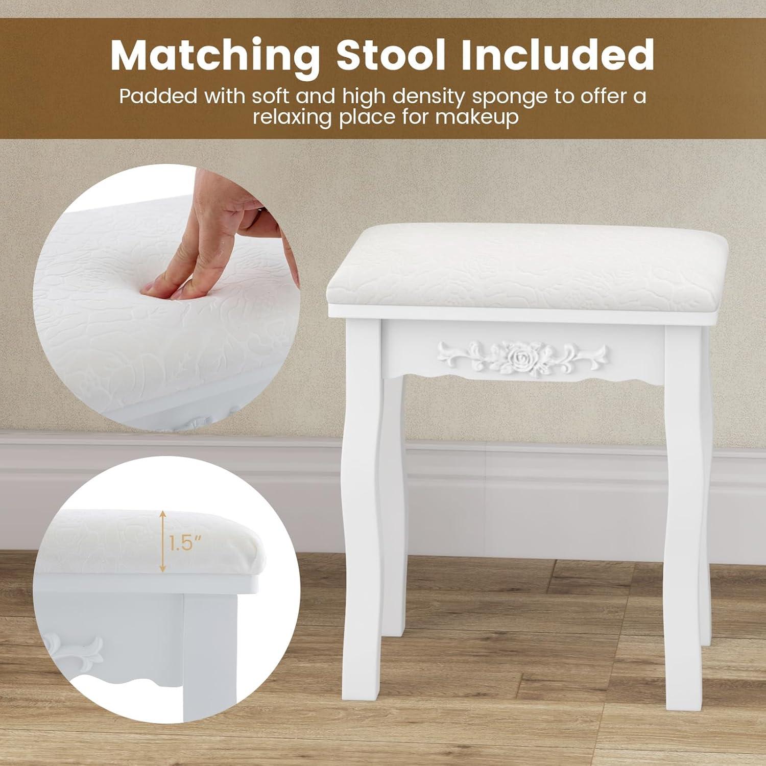 [Durable and Sturdy Construction]: This makeup vanity with stool is crafted from P2 MDF with a painted finish, making it both long-lasting and easy to clean. The table features solid pine wood legs with non-slip foot pads, while the stool is supported by solid rubber wood legs for excellent stability. An anti-tipping device ensures added safety for everyday use.
