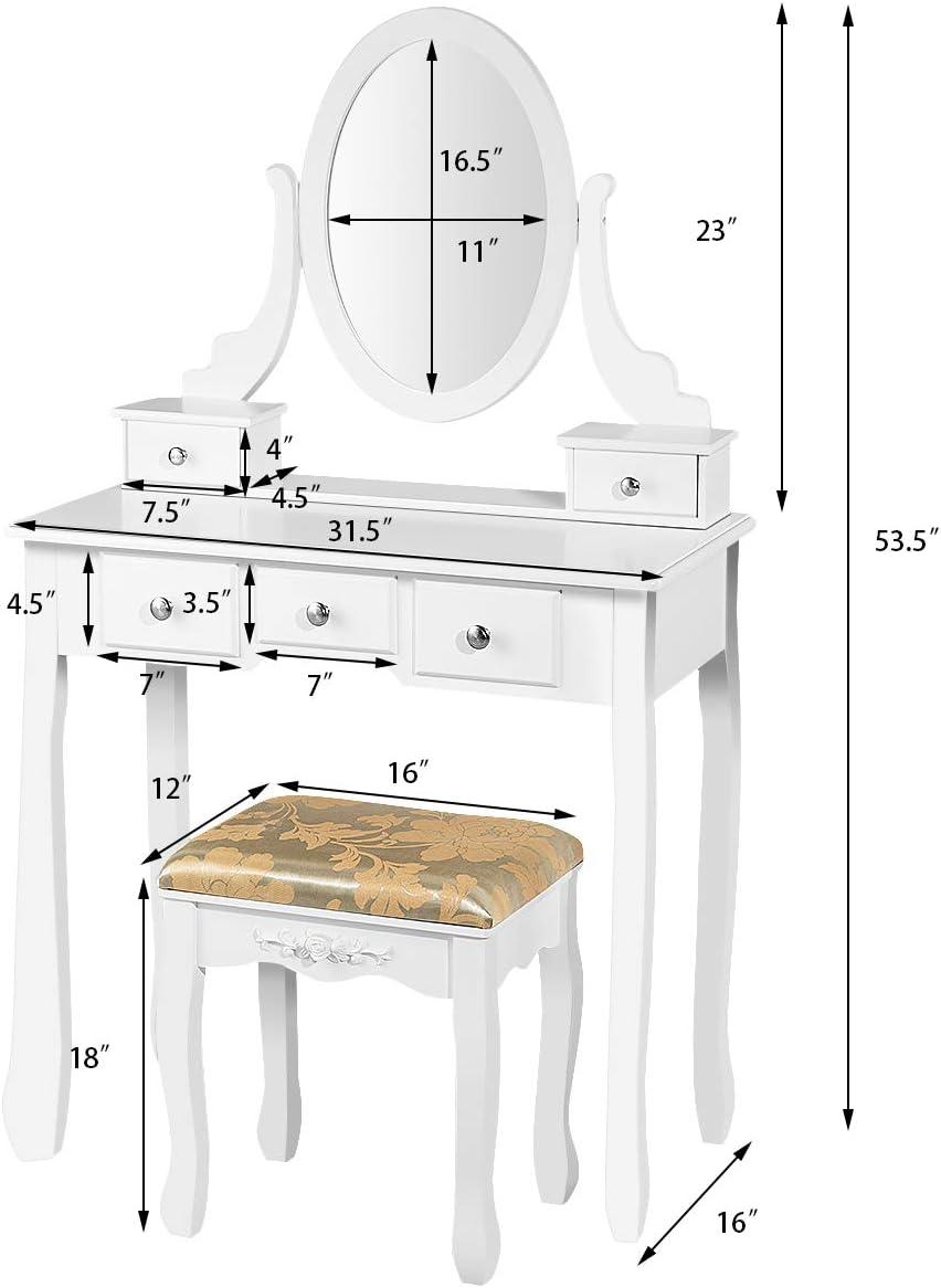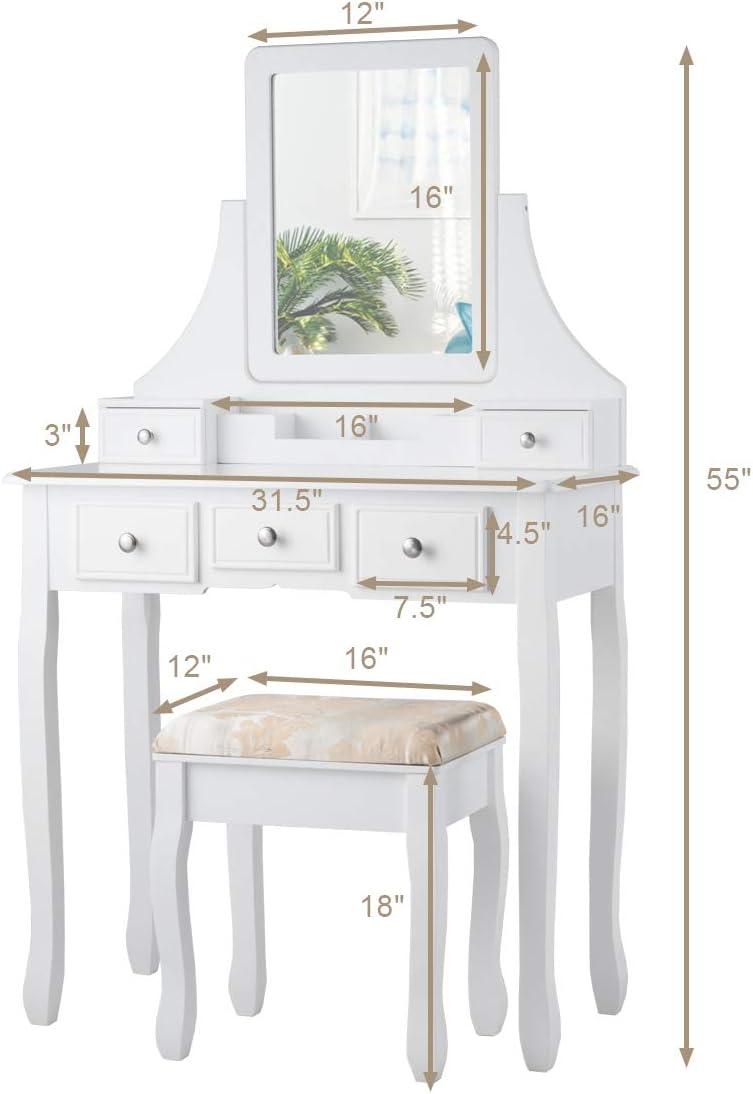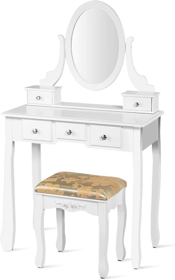 [Durable and Sturdy Construction]: This makeup vanity with stool is crafted from P2 MDF with a painted finish, making it both long-lasting and easy to clean. The table features solid pine wood legs with non-slip foot pads, while the stool is supported by solid rubber wood legs for excellent stability. An anti-tipping device ensures added safety for everyday use.