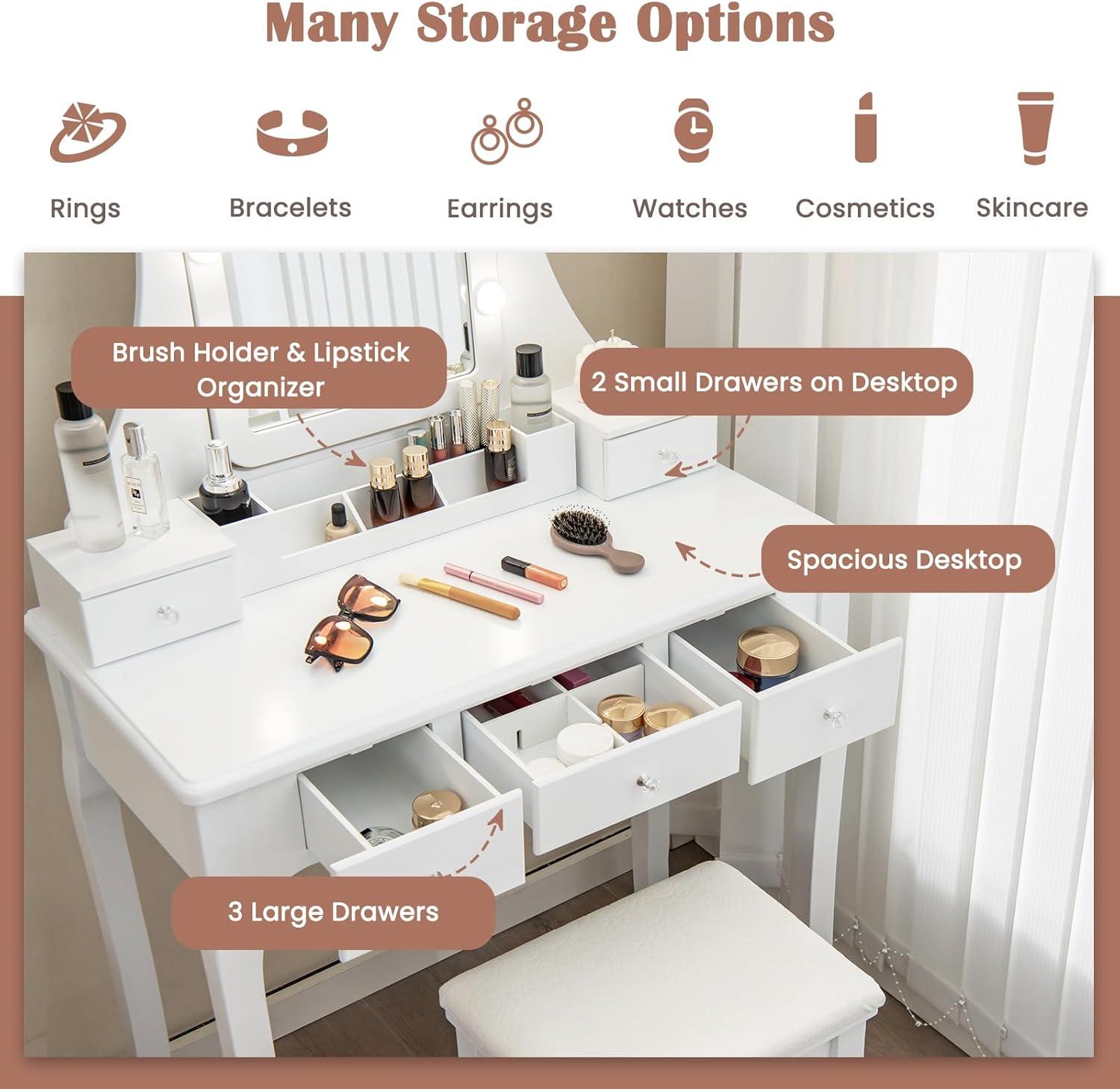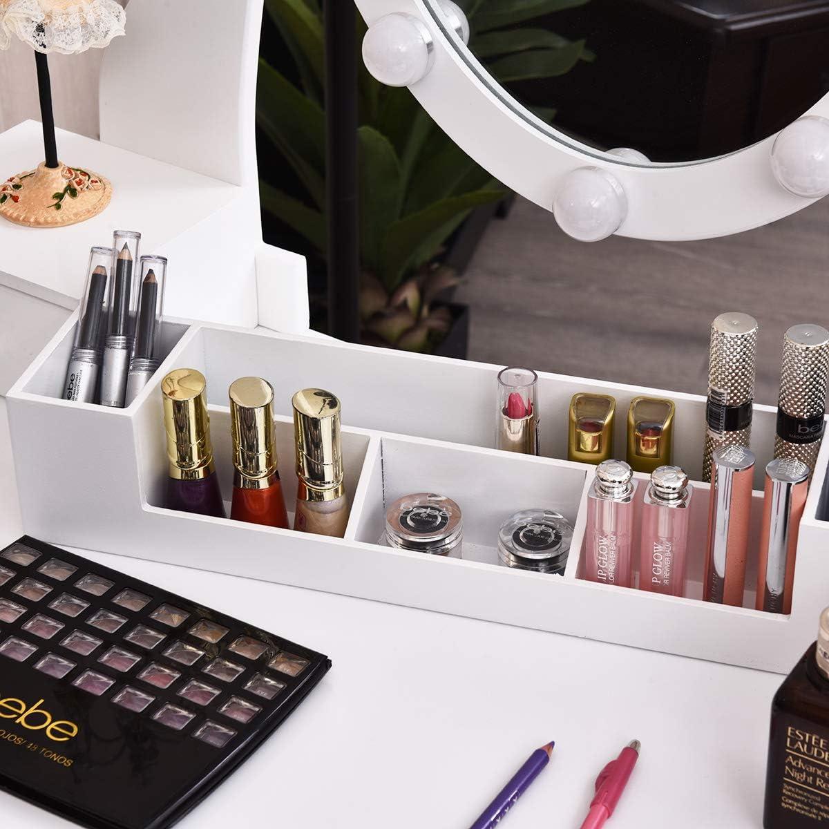 [5 Storage Drawers & Makeup Organizer]: The spacious desktop and five drawers offer ample storage for cosmetics. The removable organizer with six compartments and two DIY dividers in the middle drawer helps you keep items neatly arranged and maximize space.