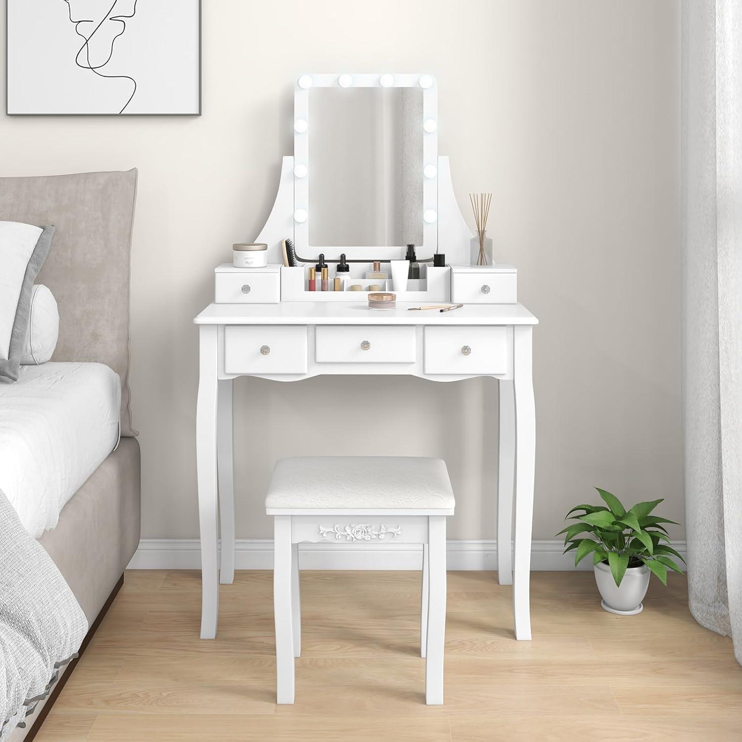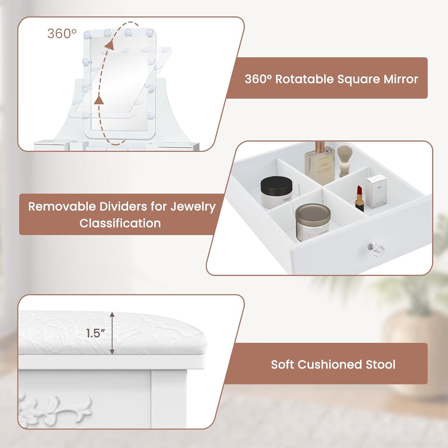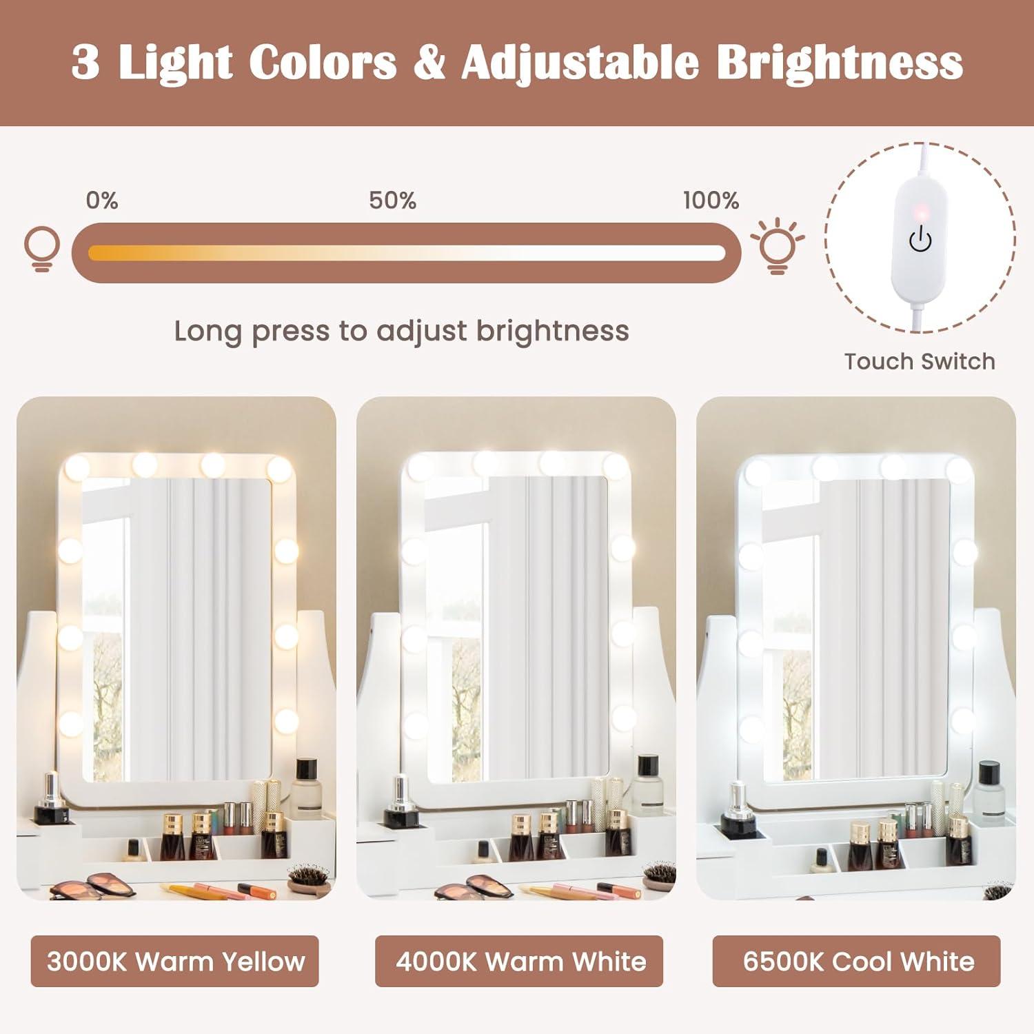 [3-Color LED Lights with Adjustable Brightness]: This makeup table features 10 LED lights with adjustable brightness and three light settings: warm yellow, warm white, and cool white. The memory function recalls your last light setting when you turn it on.