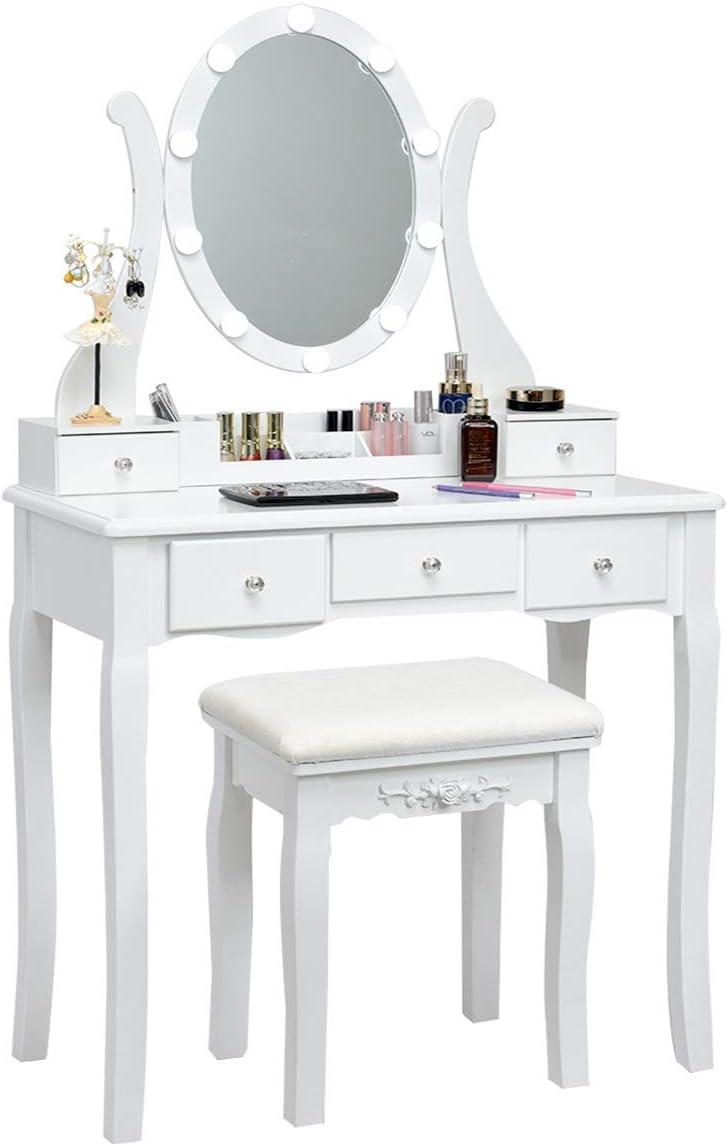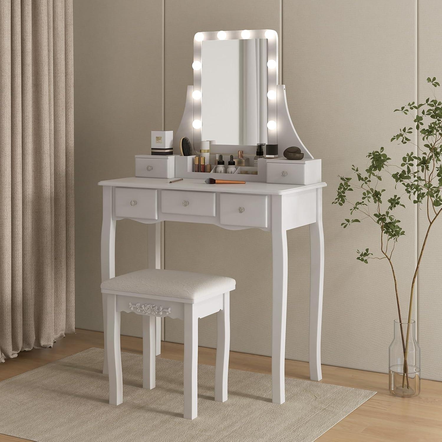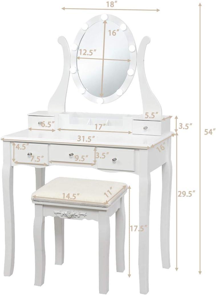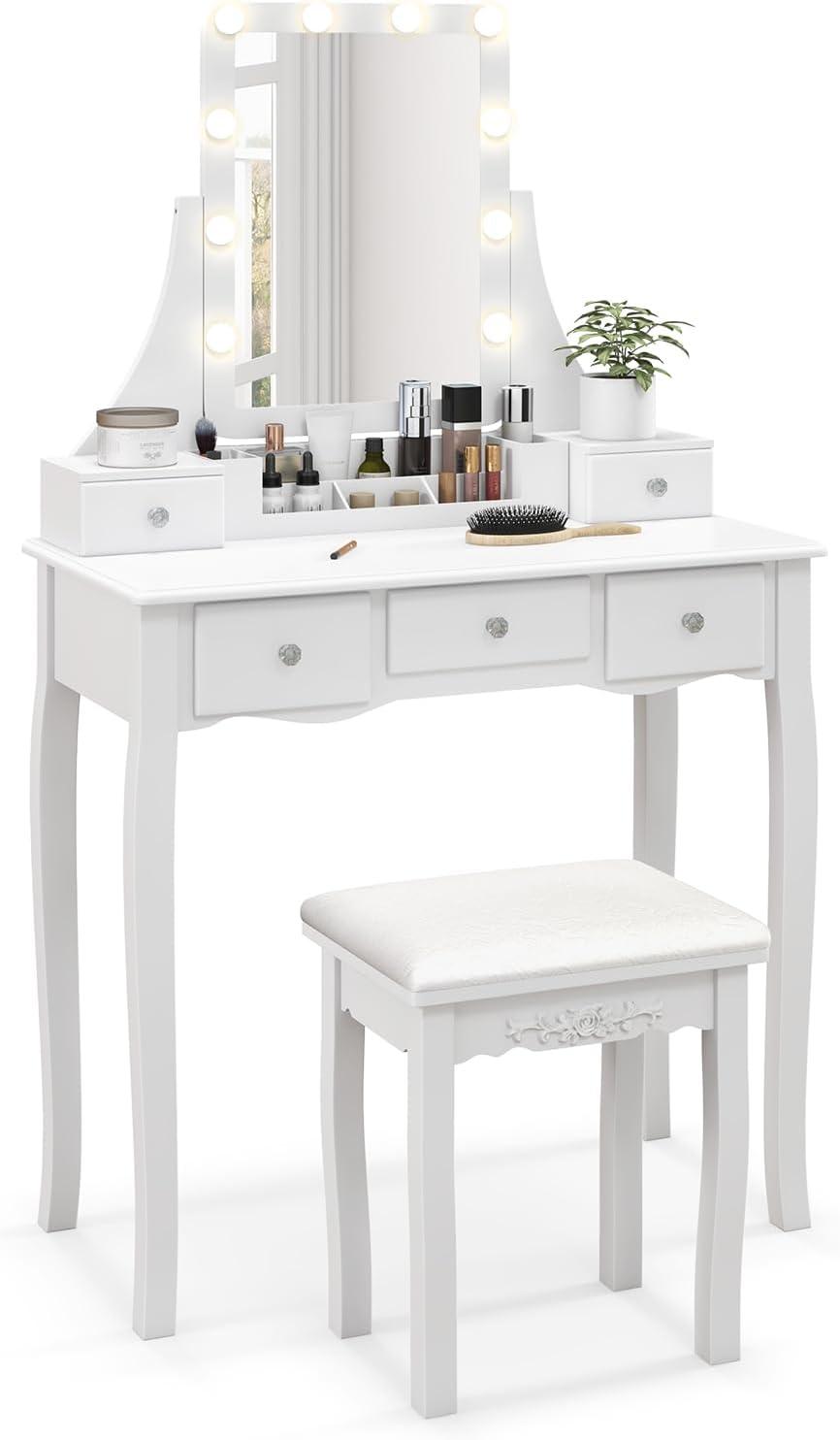 [3-Color LED Lights with Adjustable Brightness]: This makeup table features 10 LED lights with adjustable brightness and three light settings: warm yellow, warm white, and cool white. The memory function recalls your last light setting when you turn it on.