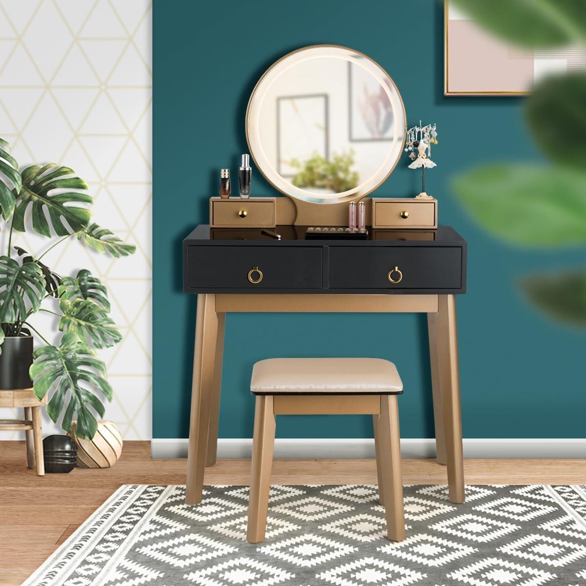 CHARMAID Vanity Desk with Mirror and Lights, White Makeup Vanity Desk with 4 Drawers, 3 Color Lighting Modes, Adjustable Brightness, Modern Dressing Table with Vanity Stool for Girls Small Bedroom(Black + Natural)