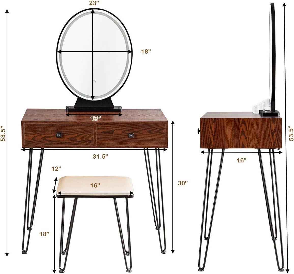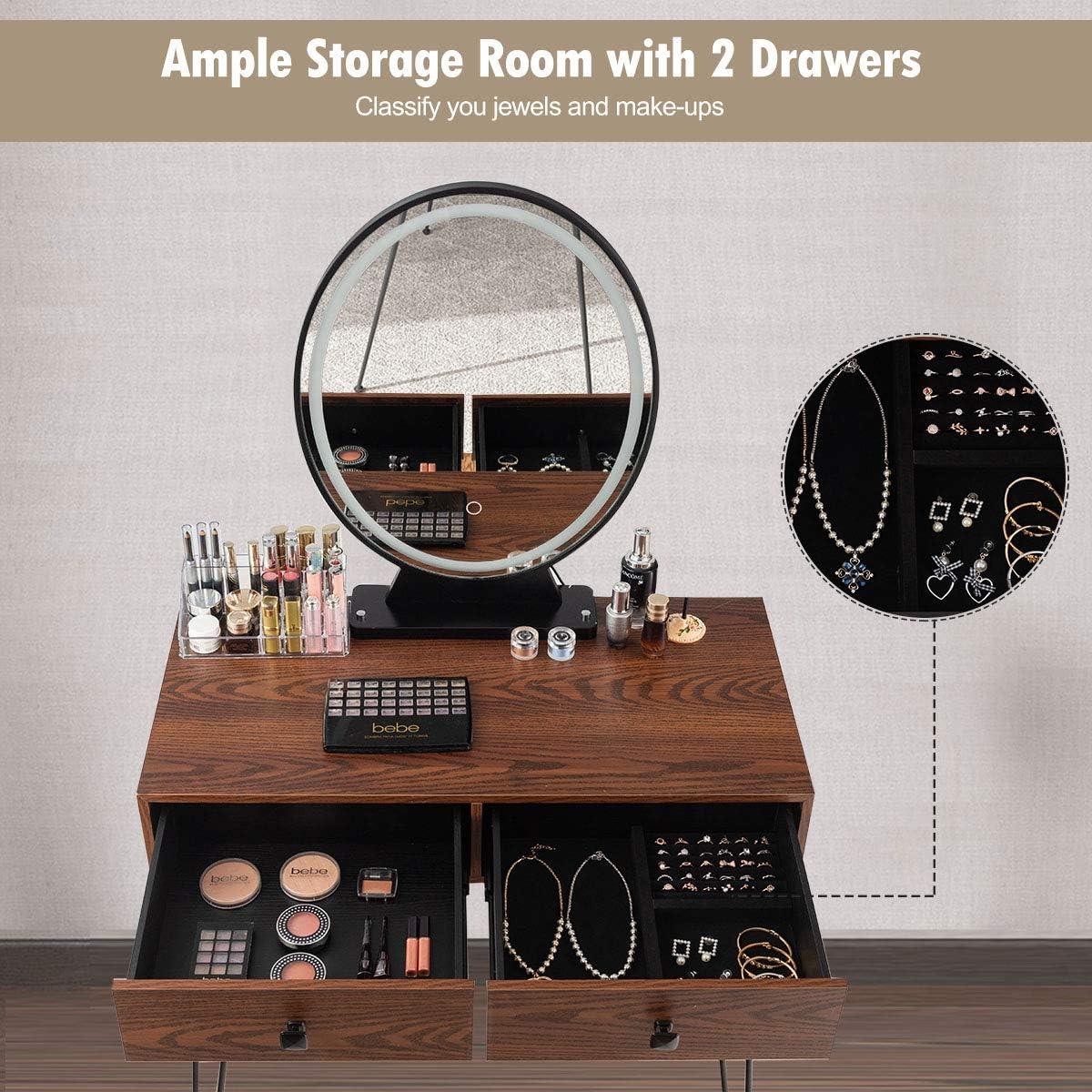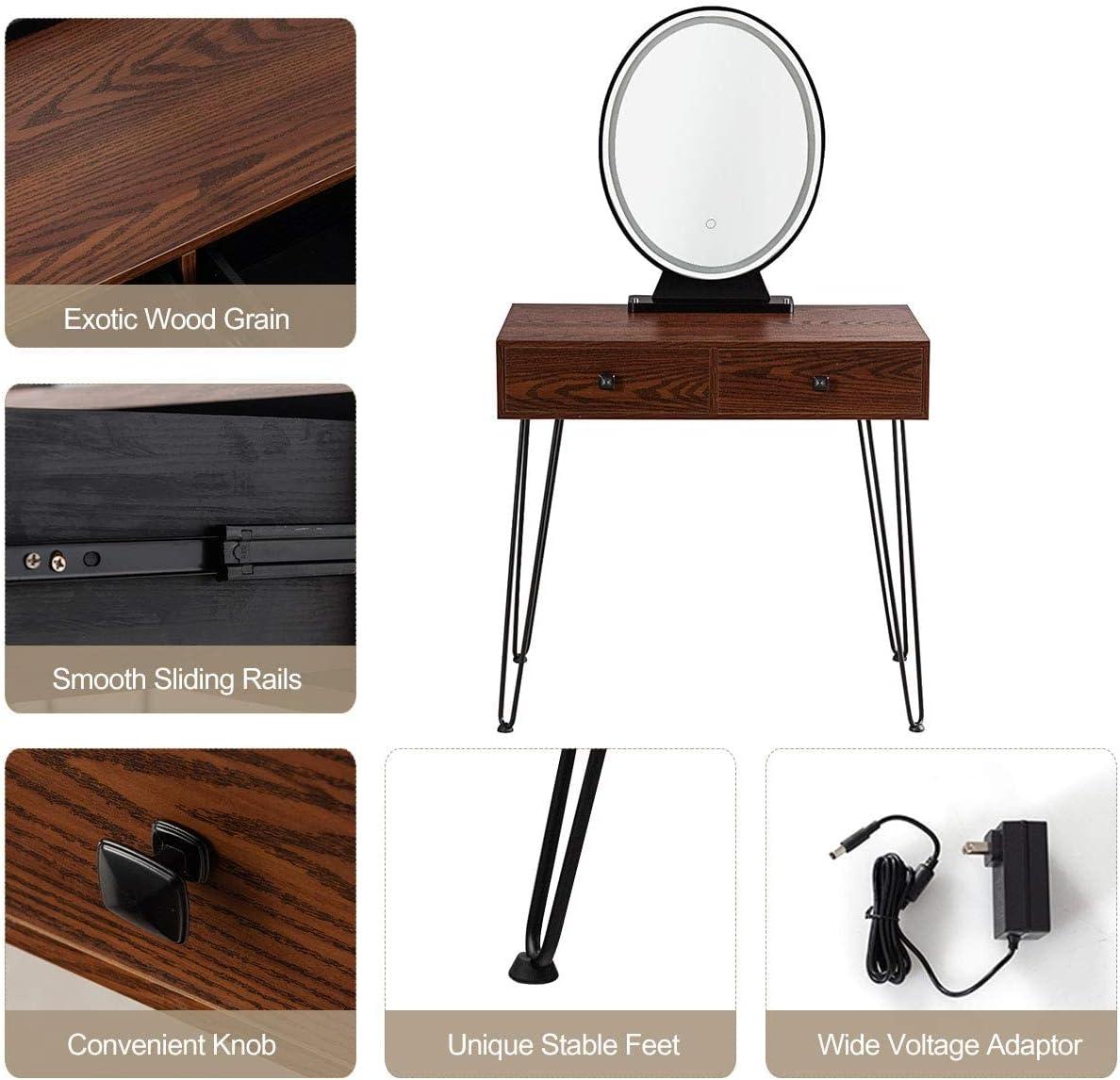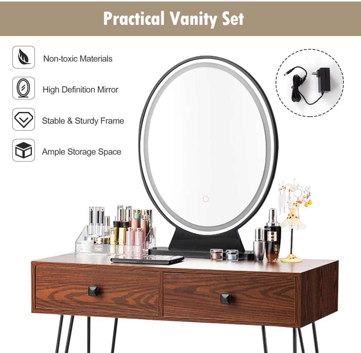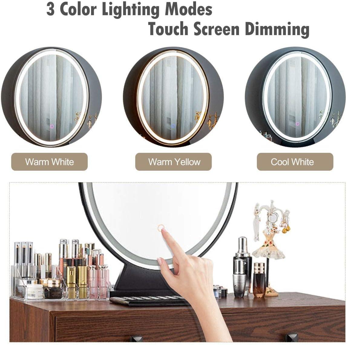 [Adjustable Lighting Options]: This vanity desk is equipped with an oval mirror featuring three adjustable lighting modes—cool white, warm white, and warm yellow—controlled via a smart touch interface. With a simple tap, you can easily switch between color temperatures, while a long press allows you to adjust the brightness for the perfect lighting, ensuring flawless makeup application every time.
