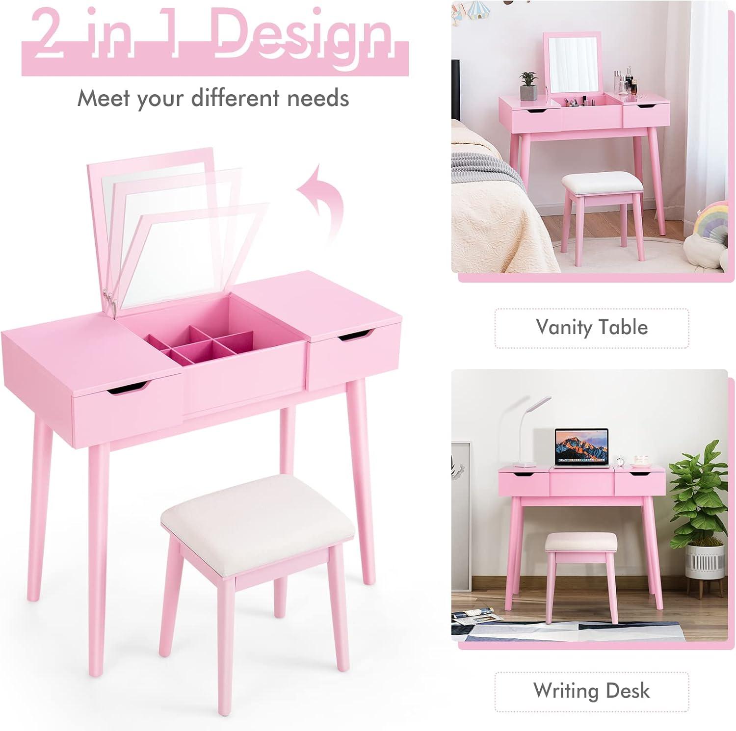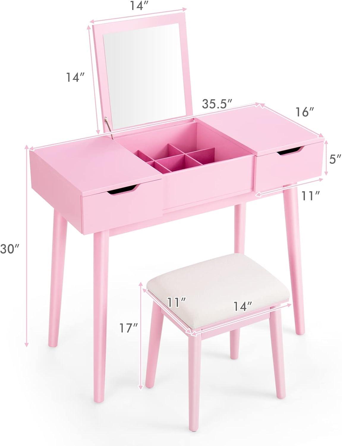 CHARMAID Vanity Set with Flip Top Mirror, 2 Drawers and 9 Storage Compartments, Removable Dividers, Cushioned Stool, Writing Desk Makeup Dressing Table for Kids Girls Women, Easy Assembly (White)(Pink)