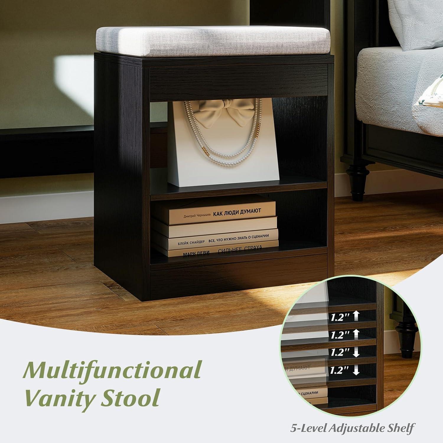 Multifunctional Vanity Stool: This dressing table set includes a matching stool with under-seat storage space, featuring a 5-level adjustable shelf to tailor your storage needs. Whether storing additional beauty products or hair tools, this stool keeps your essentials organized.
