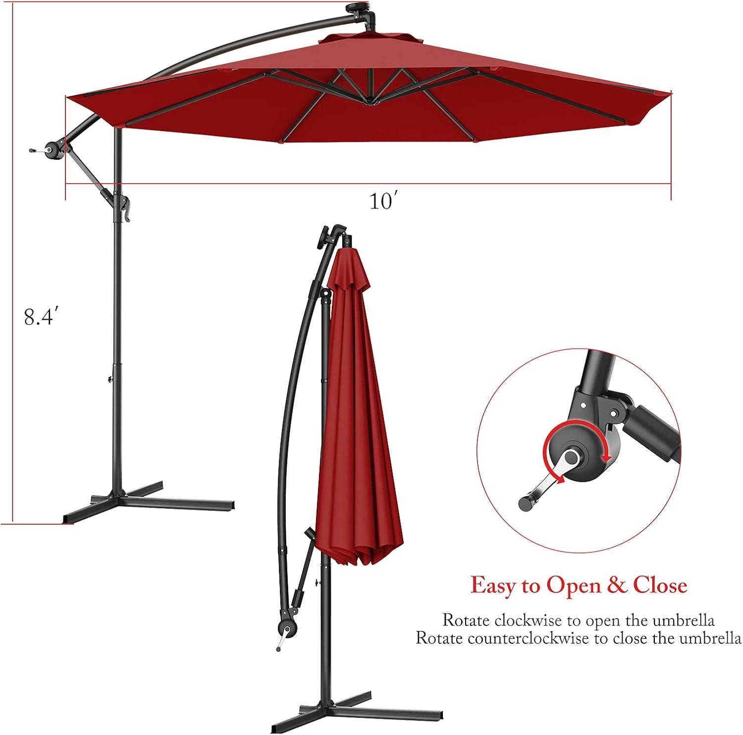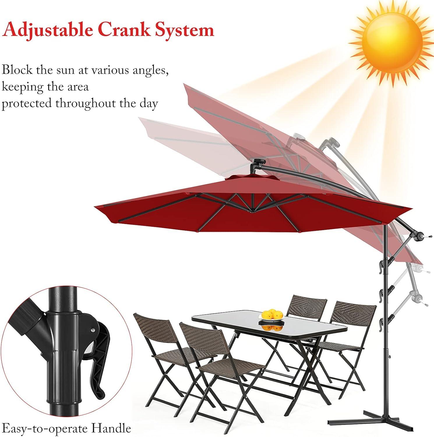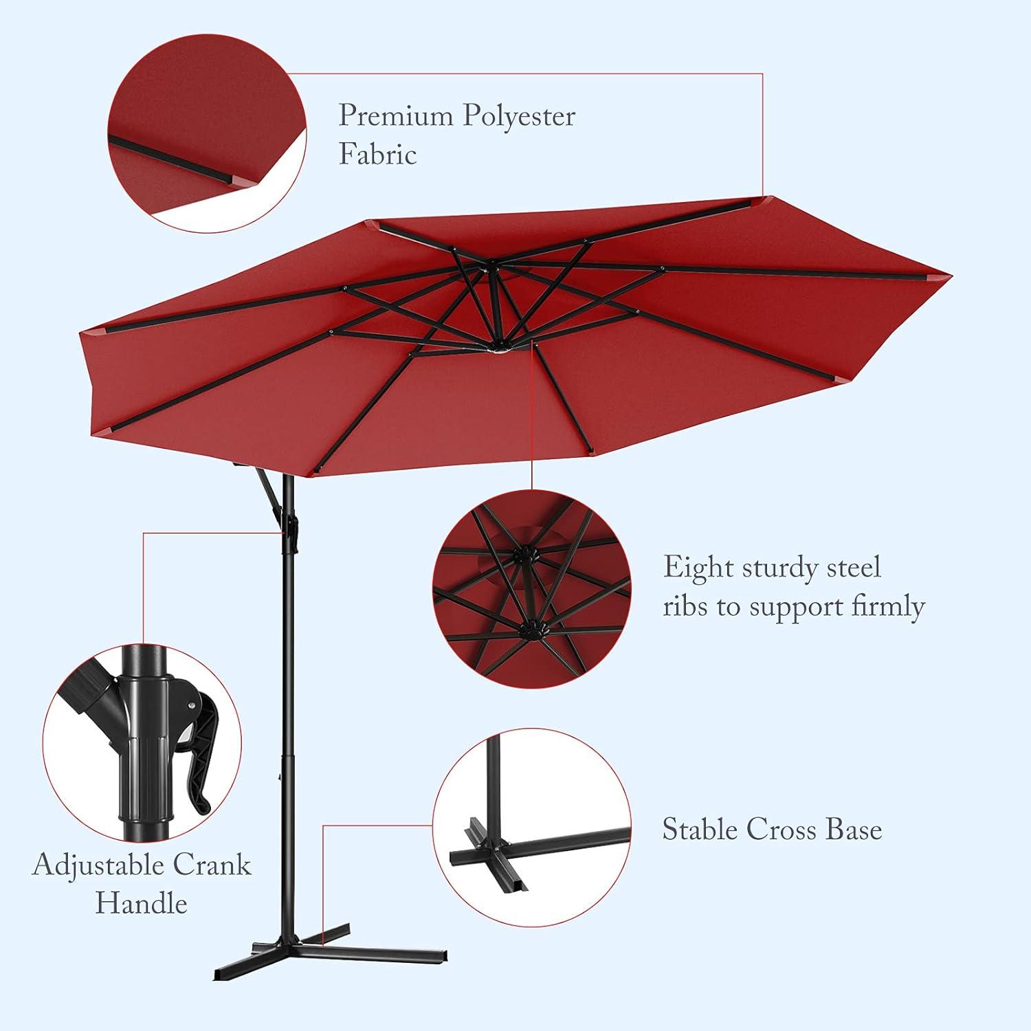 【10ft Offset Patio Umbrella: Large Shade】: Our cantilever patio umbrella is 10 feet diameter large, shading more area for you. Such size is suitable for 6 to 8 chairs, perfect for hanging over patio furniture set. Besides, a crank lift allows you to adjust the angle of umbrellas.