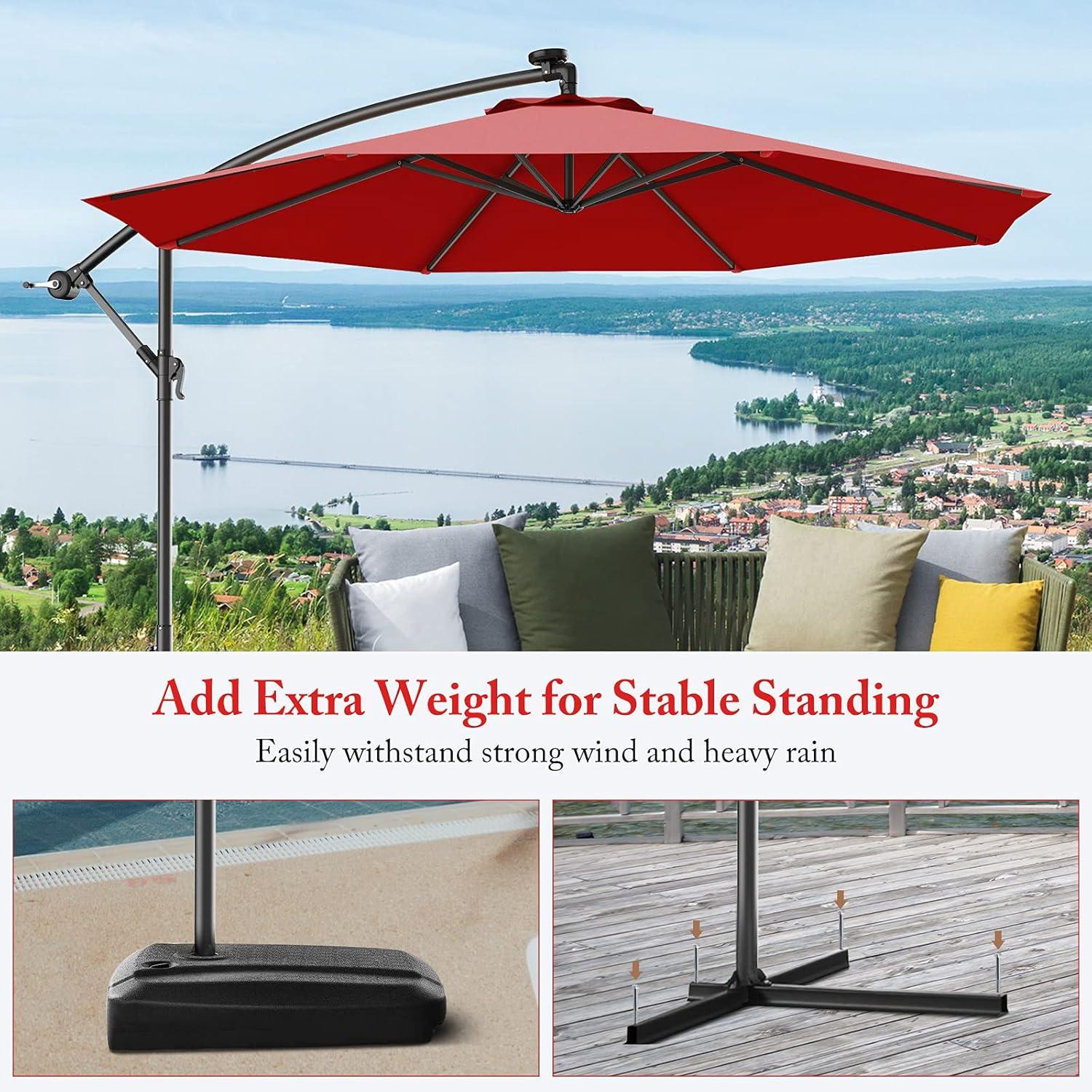 【Simple Structure; with Cross Base; Another Umbrella Base Needed】: If you need another umbrella base to make offset umbrella more stable, you can search B07F7W82VY to match! The whole structure is simple. A few steps to open and close. A little space to store our offset patio umbrellas. Our hanging outdoor umbrella is with its own cross base.