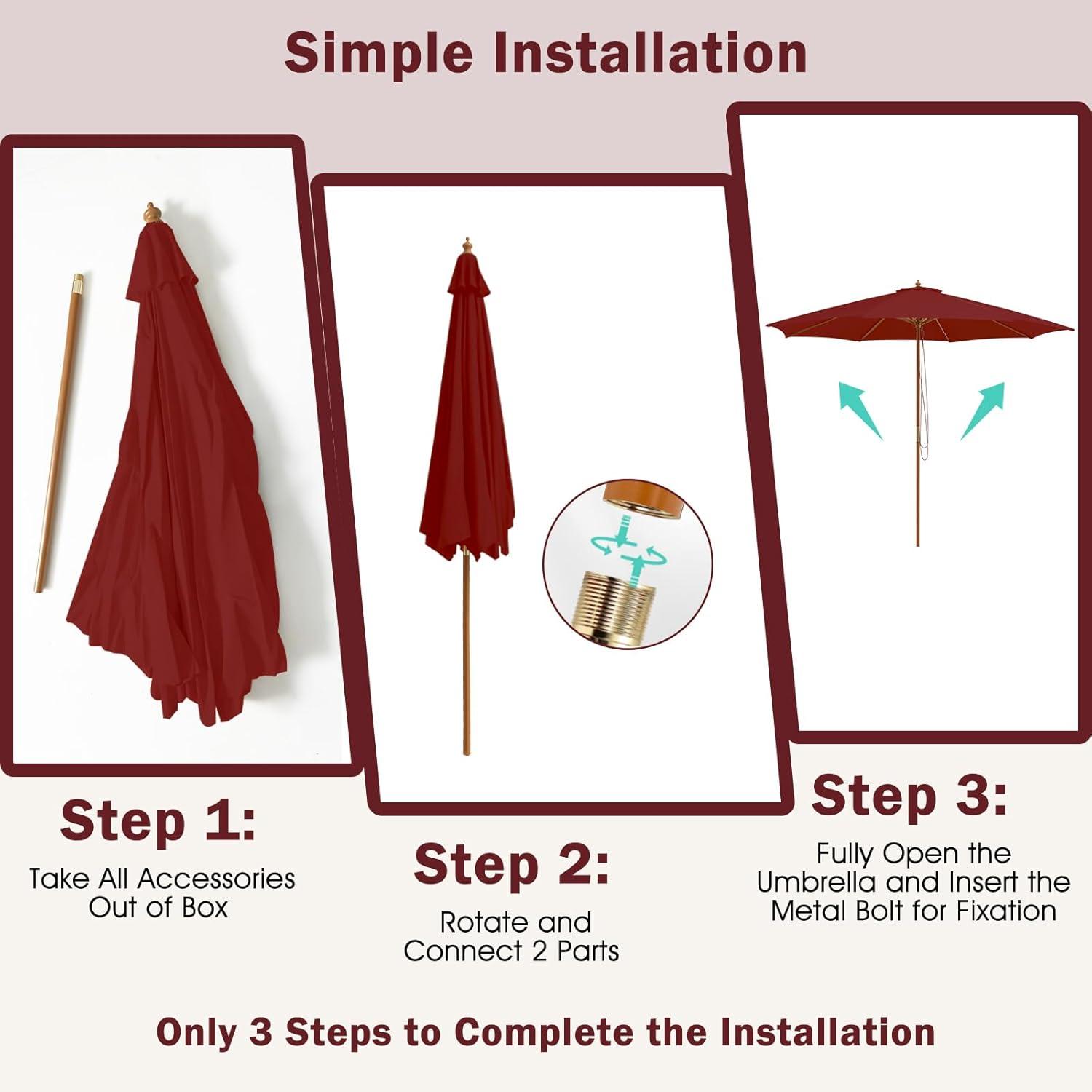After a simple installation, this outdoor sunshade umbrella is ready to use. Lift the canopy is quite easy. You just need to pull the rope and fix the position with an included metal bolt. The rib pockets are designed to attach the canopy to the ribs firmly. As for the canopy, we specially selected the premium 180g polyester fabric as its material to endow the advantages of being sun-protective and drizzle-resistance. And the top vent allows for adequate airflow. What’s more, the ribs are made of solid bamboo wood and the 1.5 inches pole is crafted of wooden material as well. Both of them make this outdoor table market umbrella stable and durable.