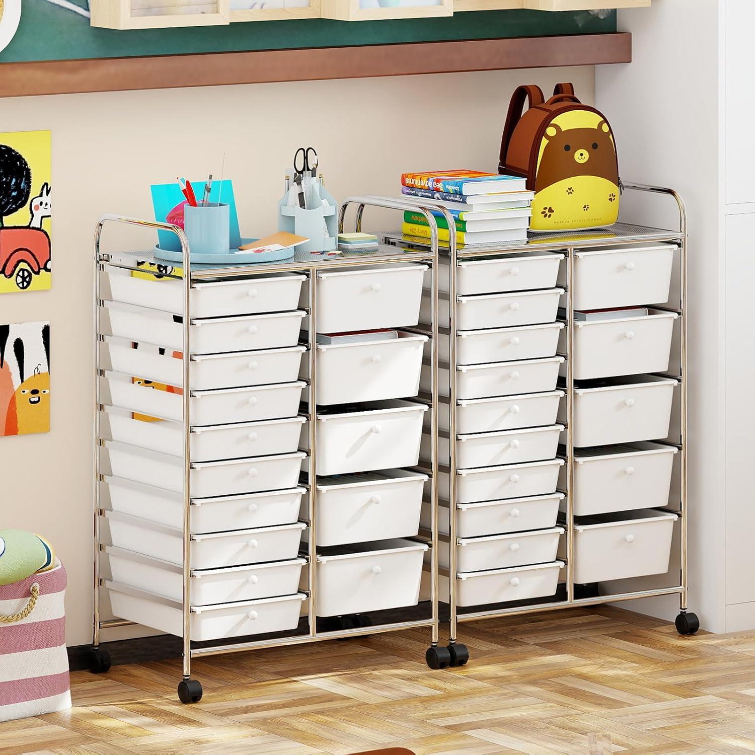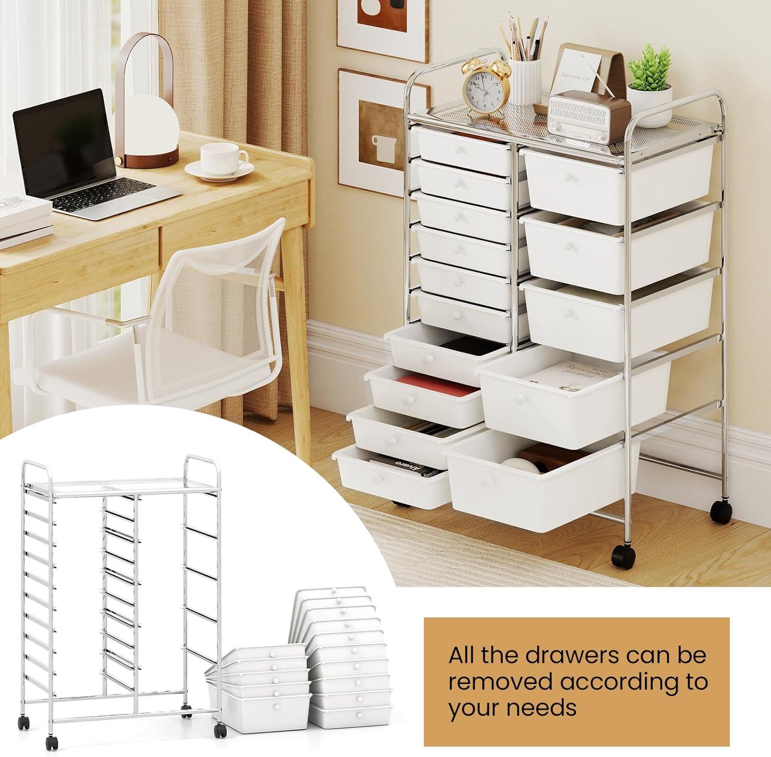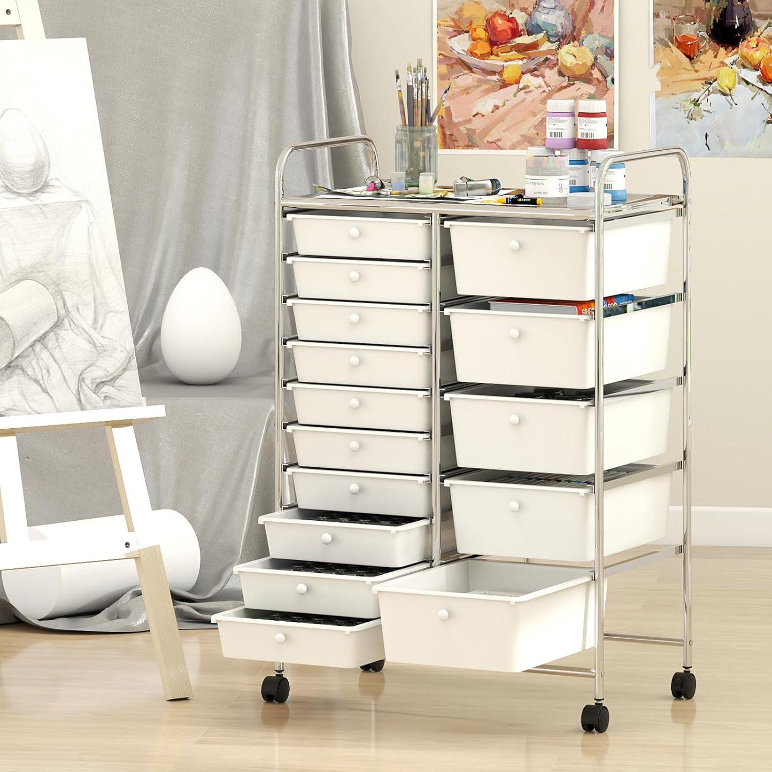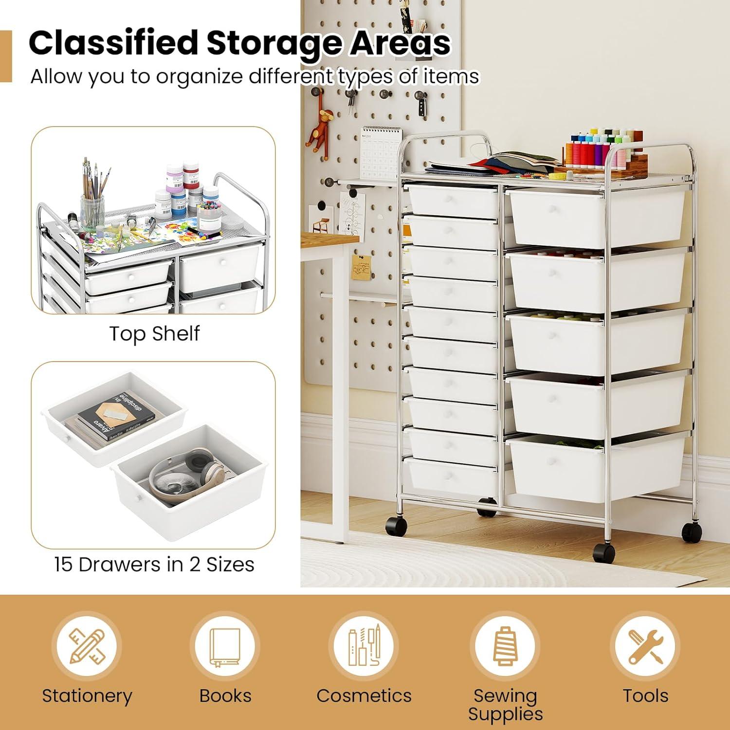 Giantex 15-Drawer Organizer Cart Office School Storage Cart Rolling Drawer Cart for Tools, Scrapbook, Paper (Multicolor)(Ivory)
