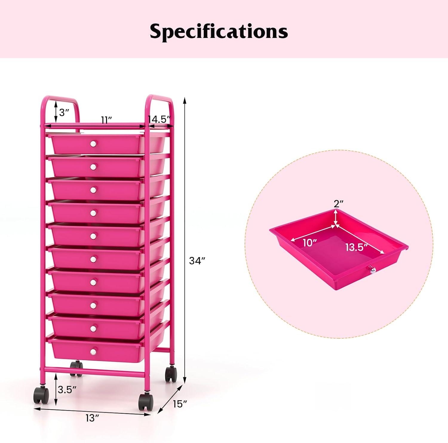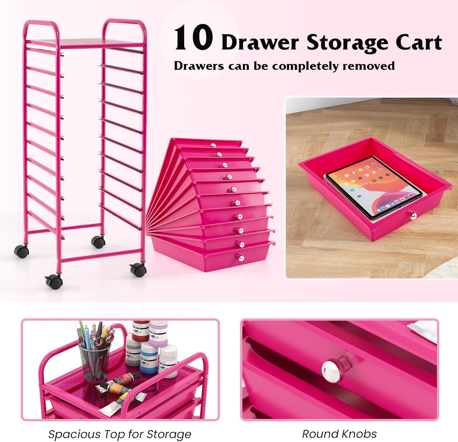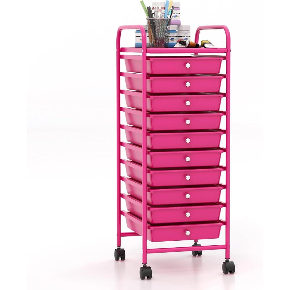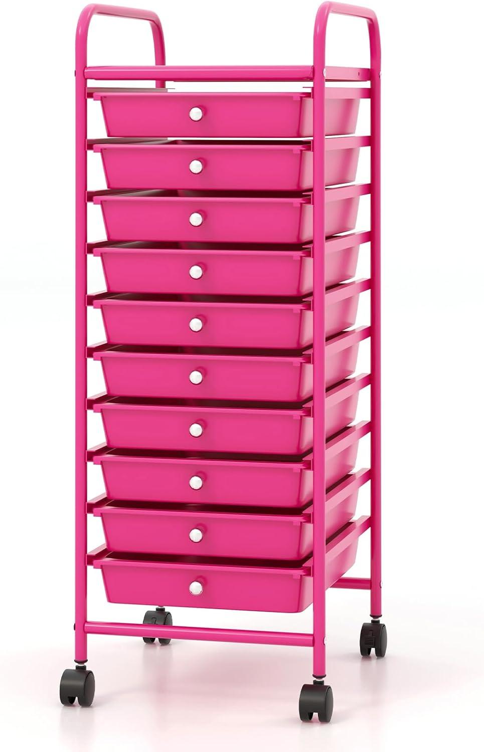 Giantex 15 Drawer Rolling Cart with Drawers, Storage Organizer Cart for Classroom Office School Teacher, Mobile Drawer Cart for Tools, Crafts, Small Printer, Paper, Pastel(Hot Pink)