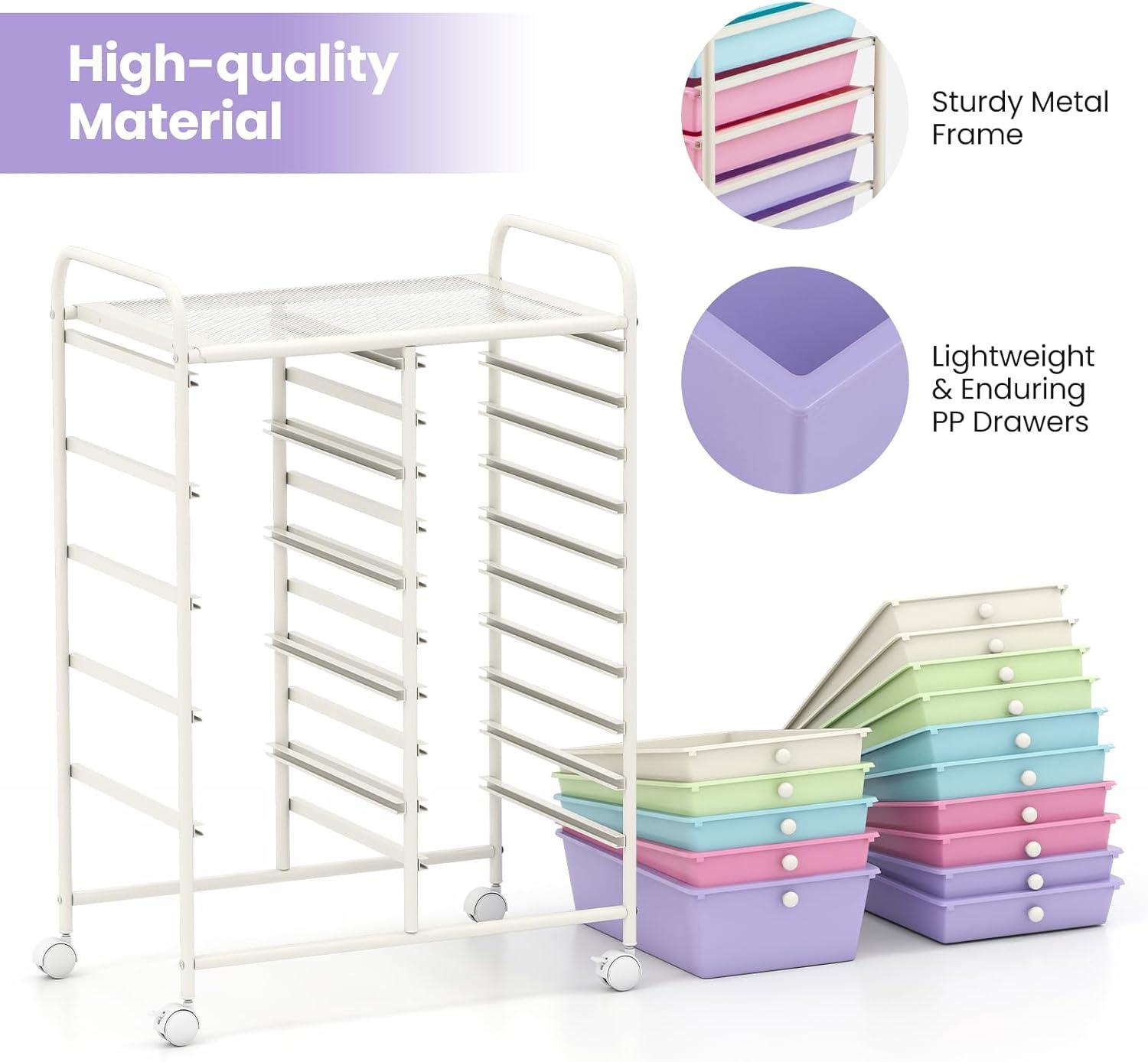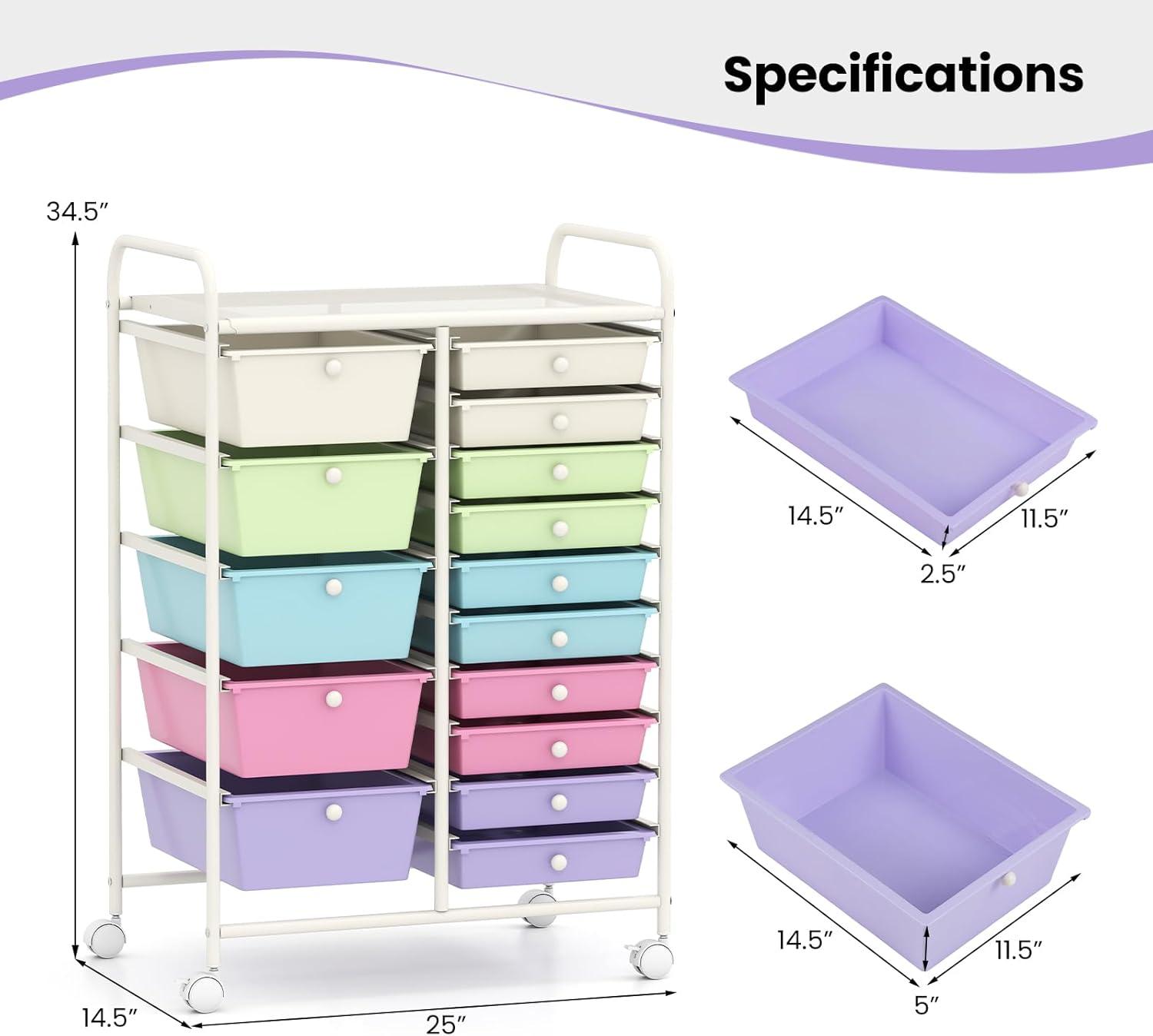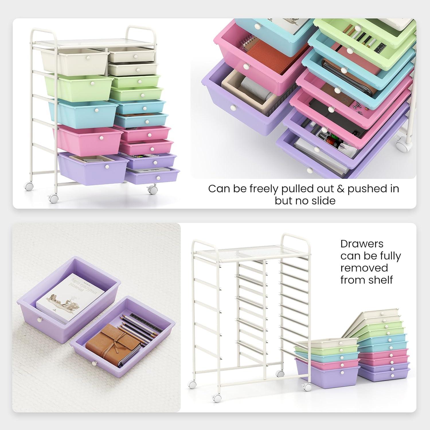 Giantex 15 Drawer Rolling Cart with Drawers, Storage Organizer Cart for Classroom Office School Teacher, Mobile Drawer Cart for Tools, Crafts, Small Printer, Paper, Pastel(Multicolor)