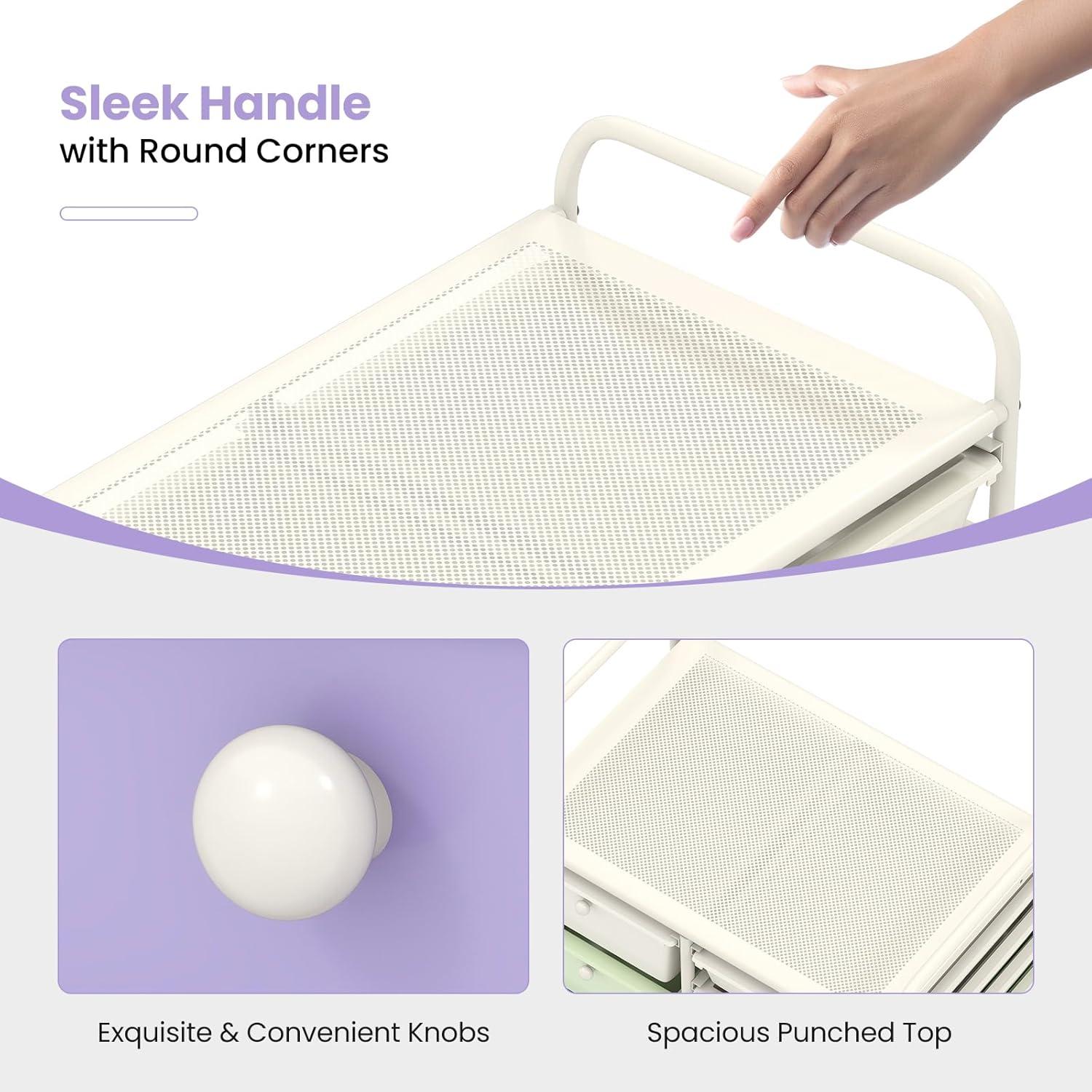 [User-Friendly Design]: The top of this rolling storage cart is spacious enough to offer additional storage space. Besides, two side handles are easily hold for you to move the cart. Chrome knob makes it easy for pulling out drawers. With elaborate instruction, the assembly work of cart frame and knobs will take you short time.