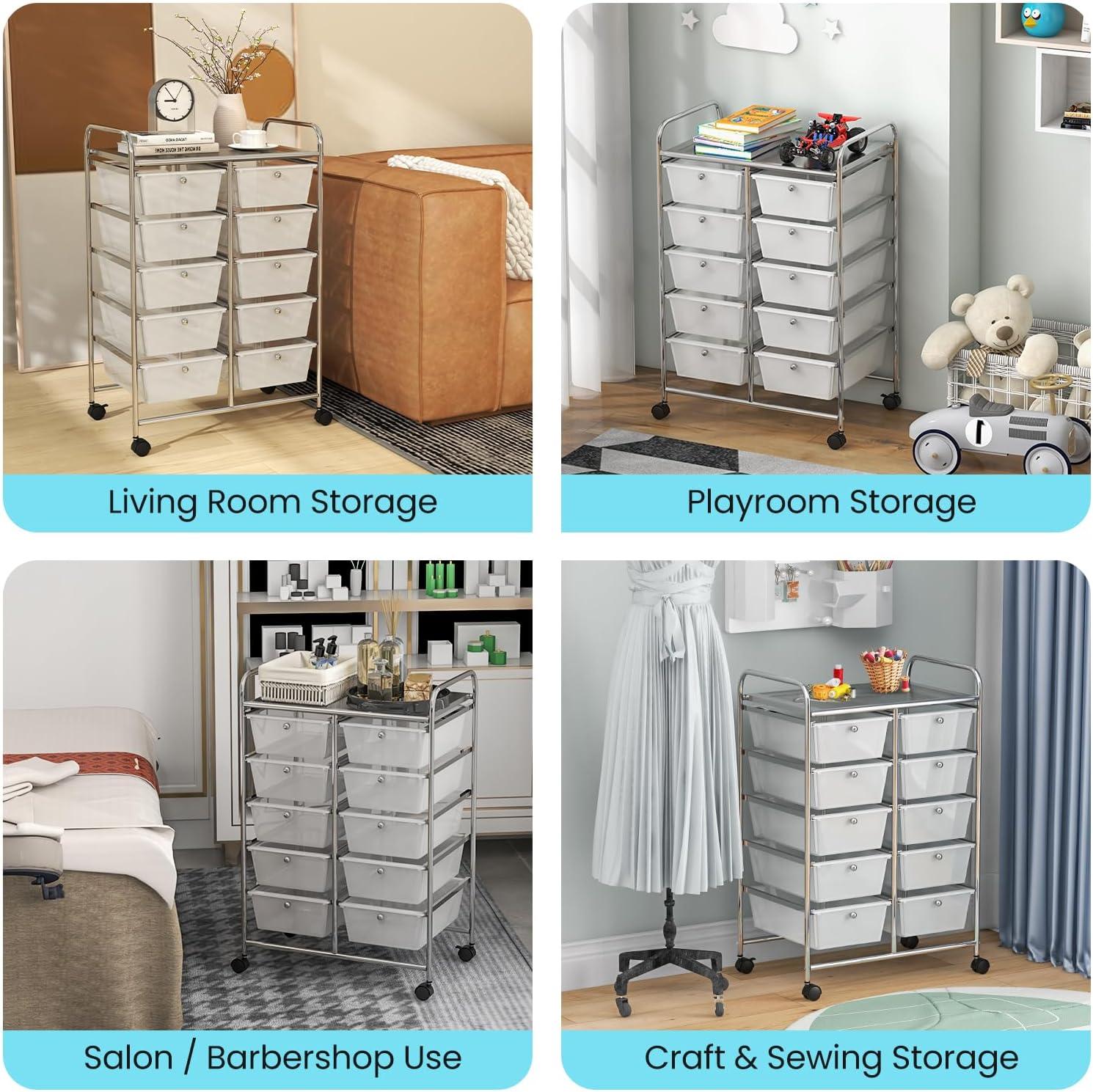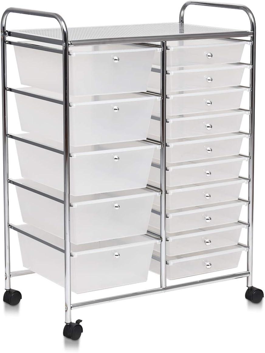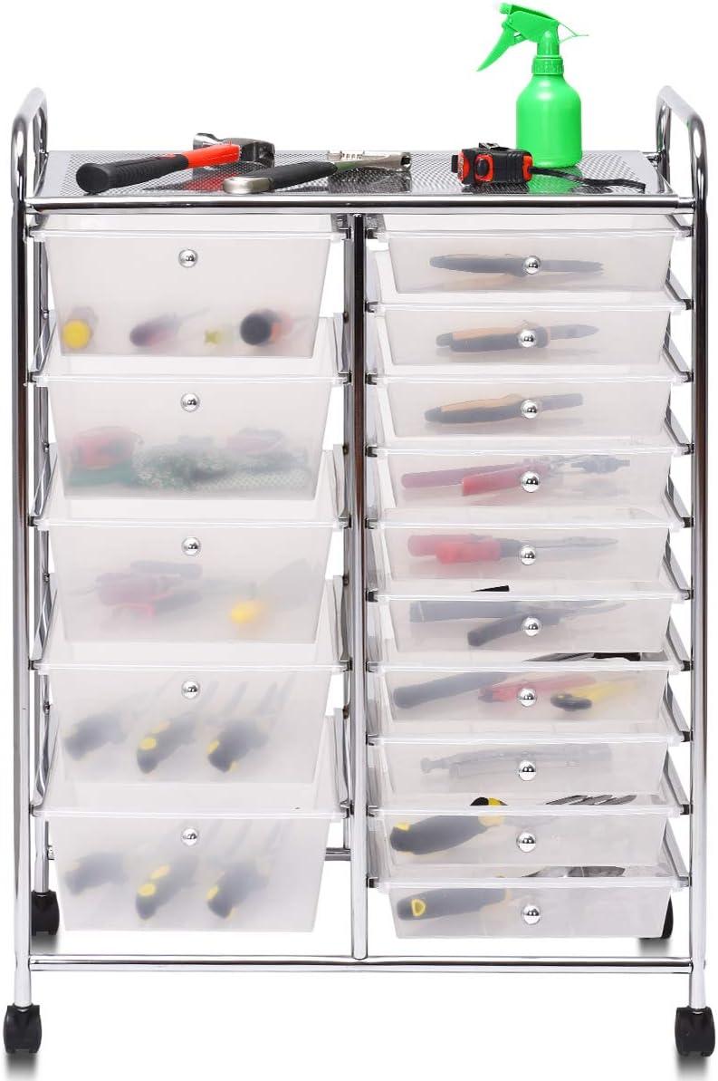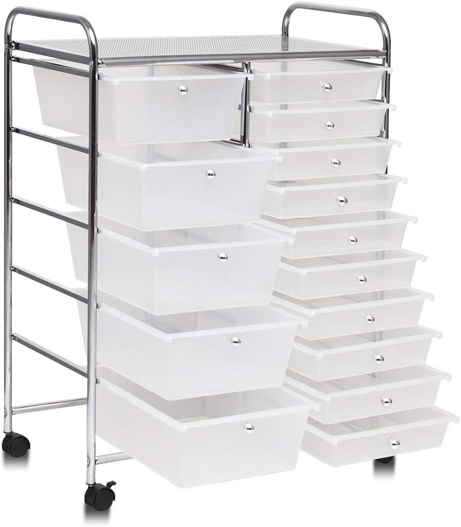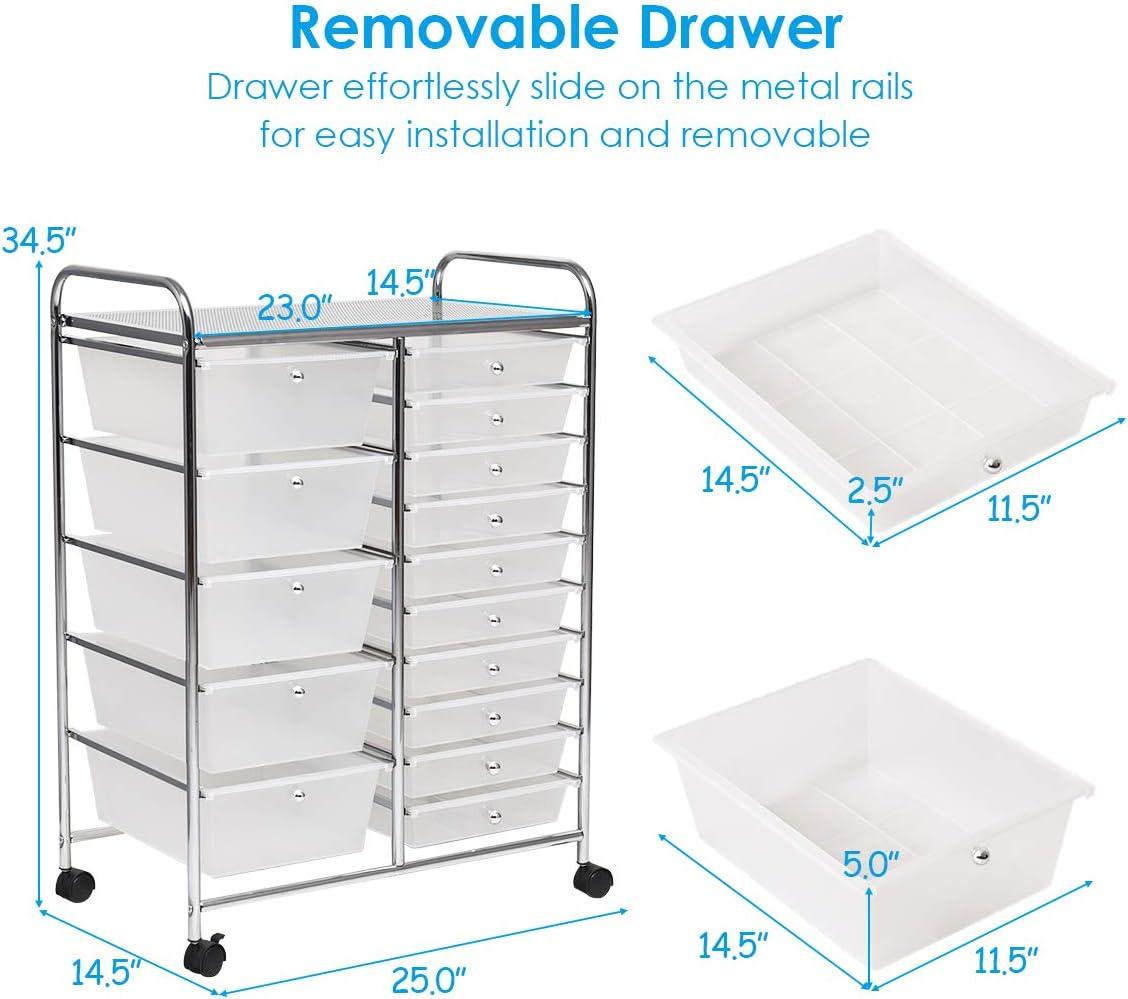 Get organized in style with our sleek and spacious rolling storage cart! Featuring 15 removable drawers, 5 of which are large and 10 are medium-sized, this cart offers plenty of storage options. The baking finish metal frame and durable PP drawers ensure long-lasting use, while the 4 universal casters (2 of which are lockable) make it easy to move around. With user-friendly features such as sleek handles and convenient knobs, this cart is perfect for living room storage, playroom storage, salon/barbershop use, or craft & sewing storage. Measuring 25″ x 14.5″ x 34.5″ (L x W x H), the utility cart saves floor space. Make clutter a thing of the past – order now!