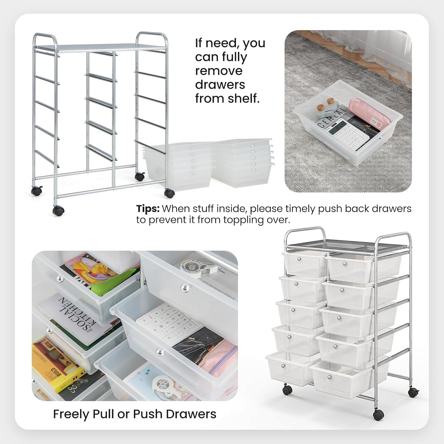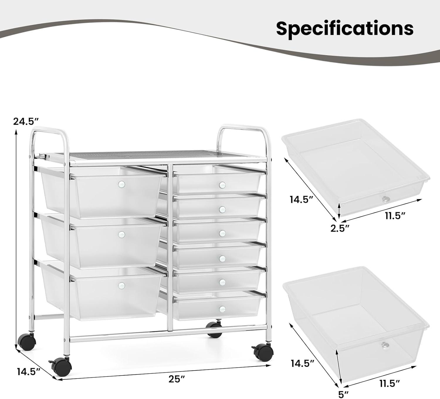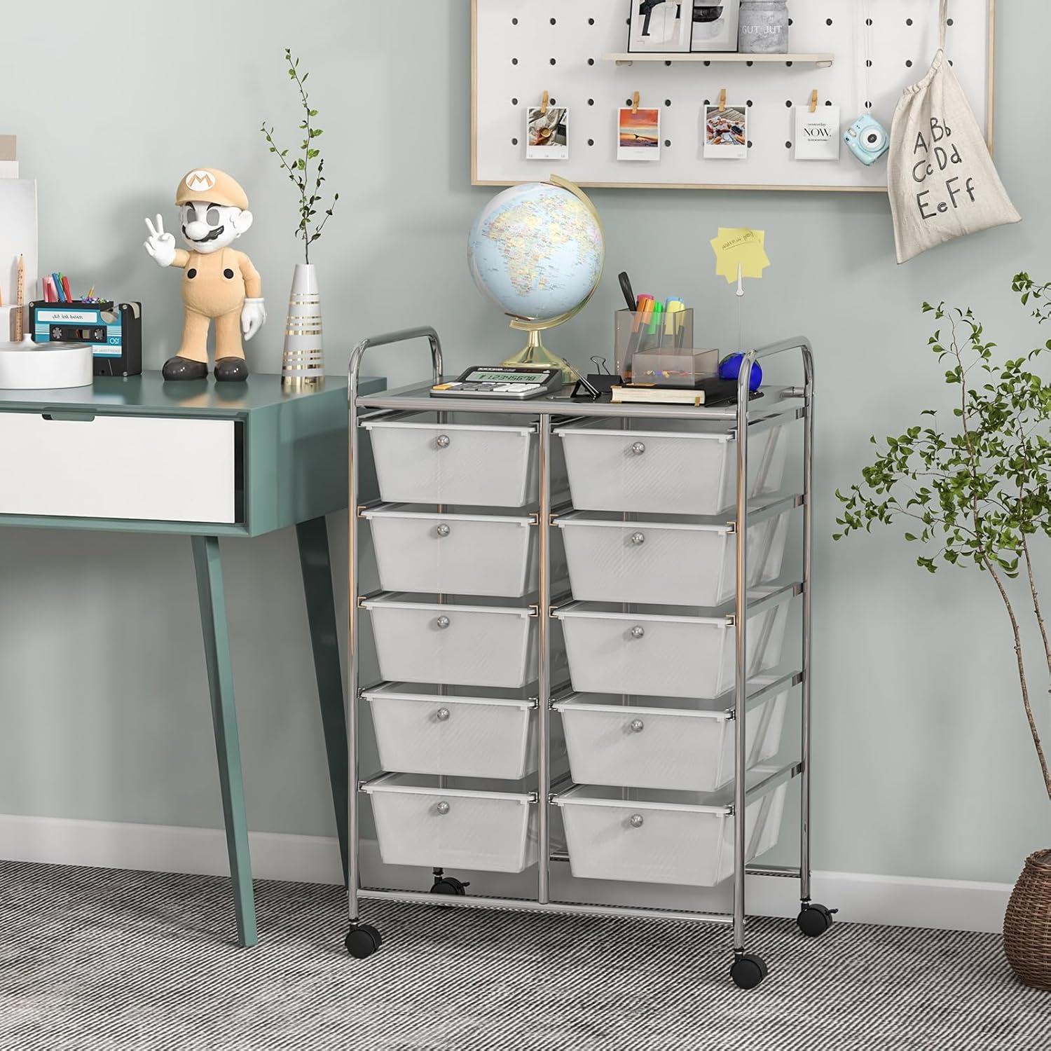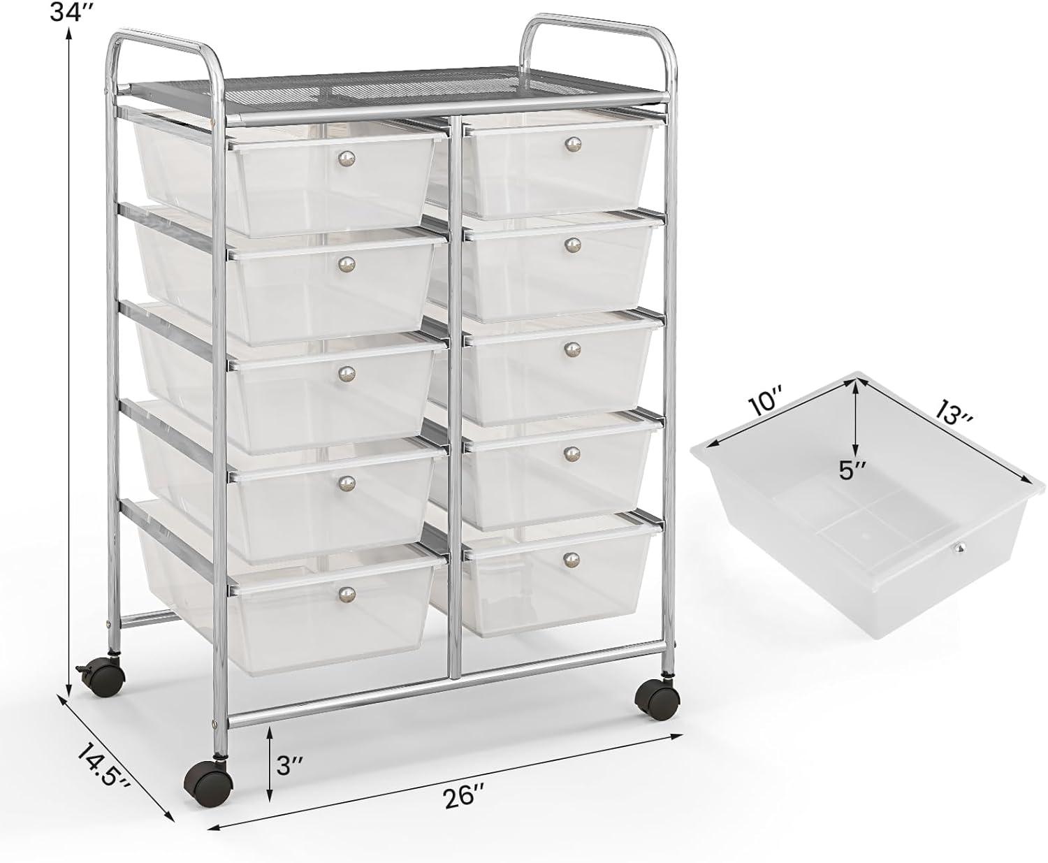 Get organized in style with our sleek and spacious rolling storage cart! Featuring 15 removable drawers, 5 of which are large and 10 are medium-sized, this cart offers plenty of storage options. The baking finish metal frame and durable PP drawers ensure long-lasting use, while the 4 universal casters (2 of which are lockable) make it easy to move around. With user-friendly features such as sleek handles and convenient knobs, this cart is perfect for living room storage, playroom storage, salon/barbershop use, or craft & sewing storage. Measuring 25″ x 14.5″ x 34.5″ (L x W x H), the utility cart saves floor space. Make clutter a thing of the past – order now!