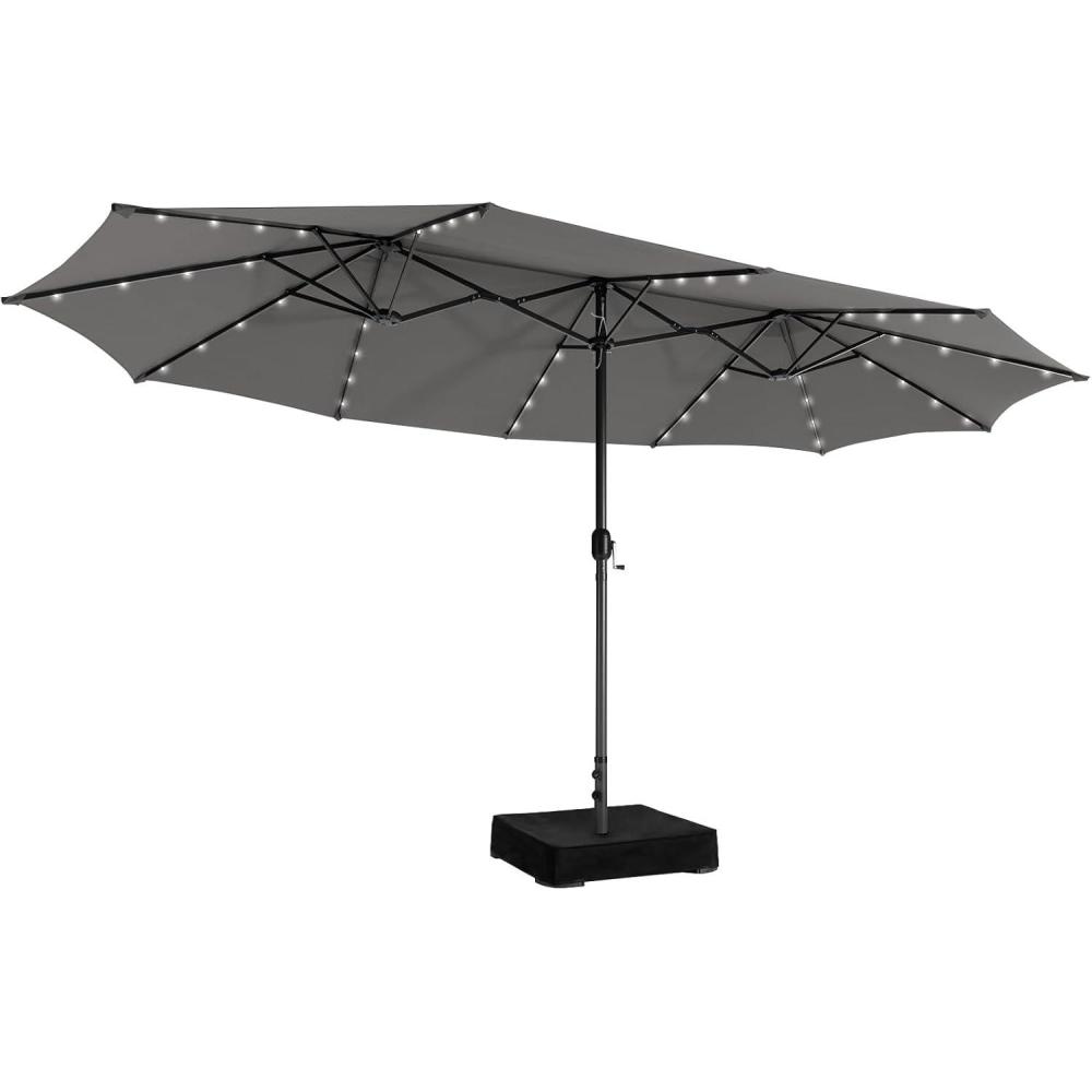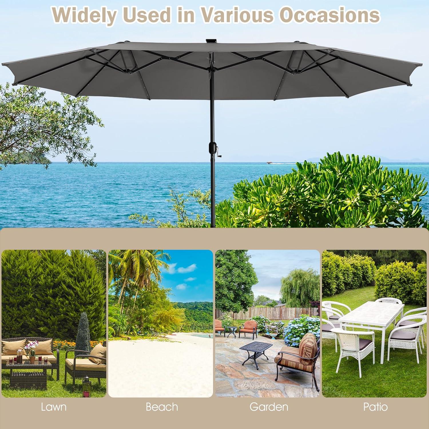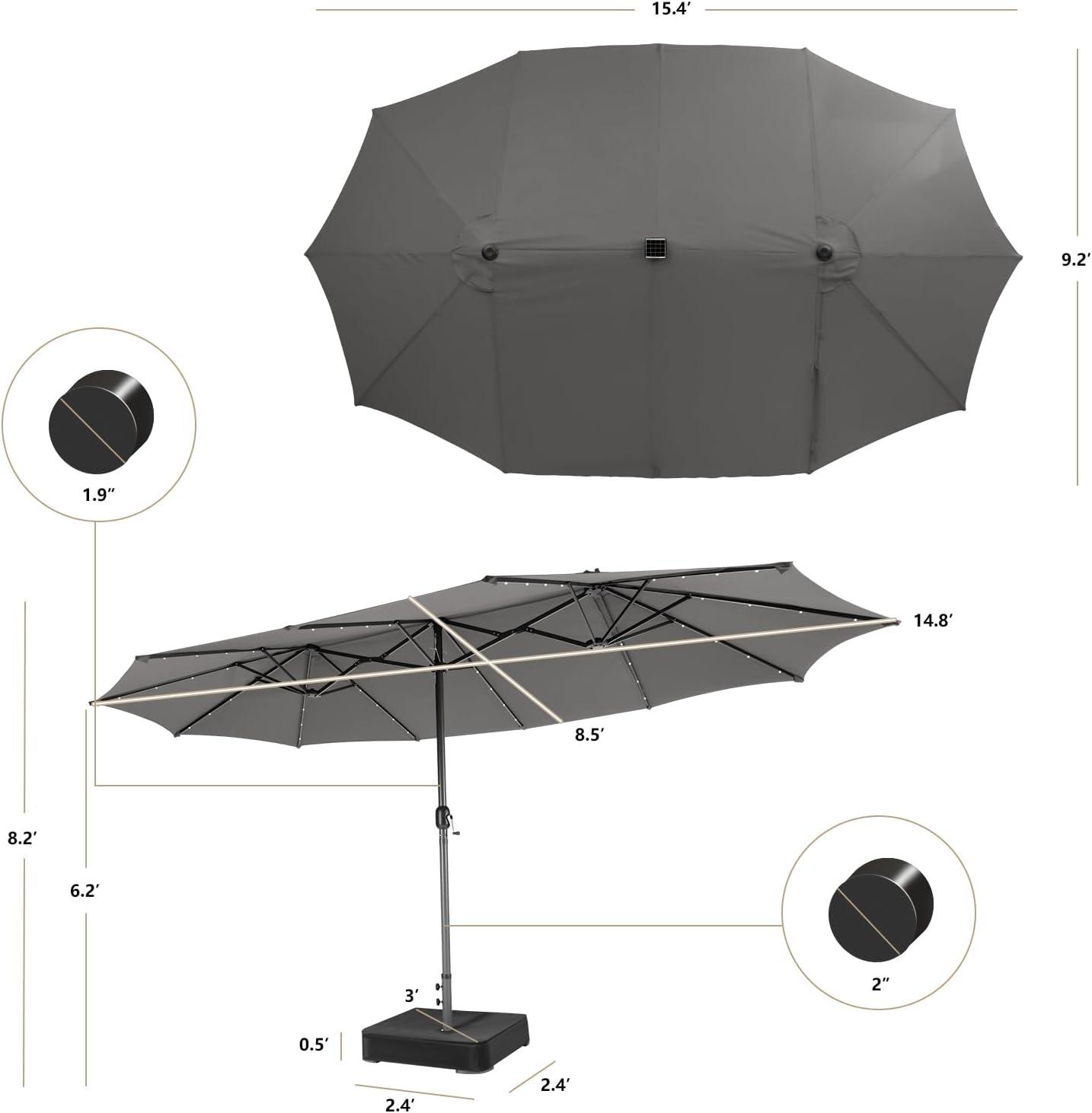 Giantex 15ft Large Outdoor Umbrella Double-Sided, 48 Solar Lights, Auto-Charging Solar Panel, Extra Large Patio Umbrella with Base and Crank, Outdoor Market Umbrellas for Poolside Garden(Gray)