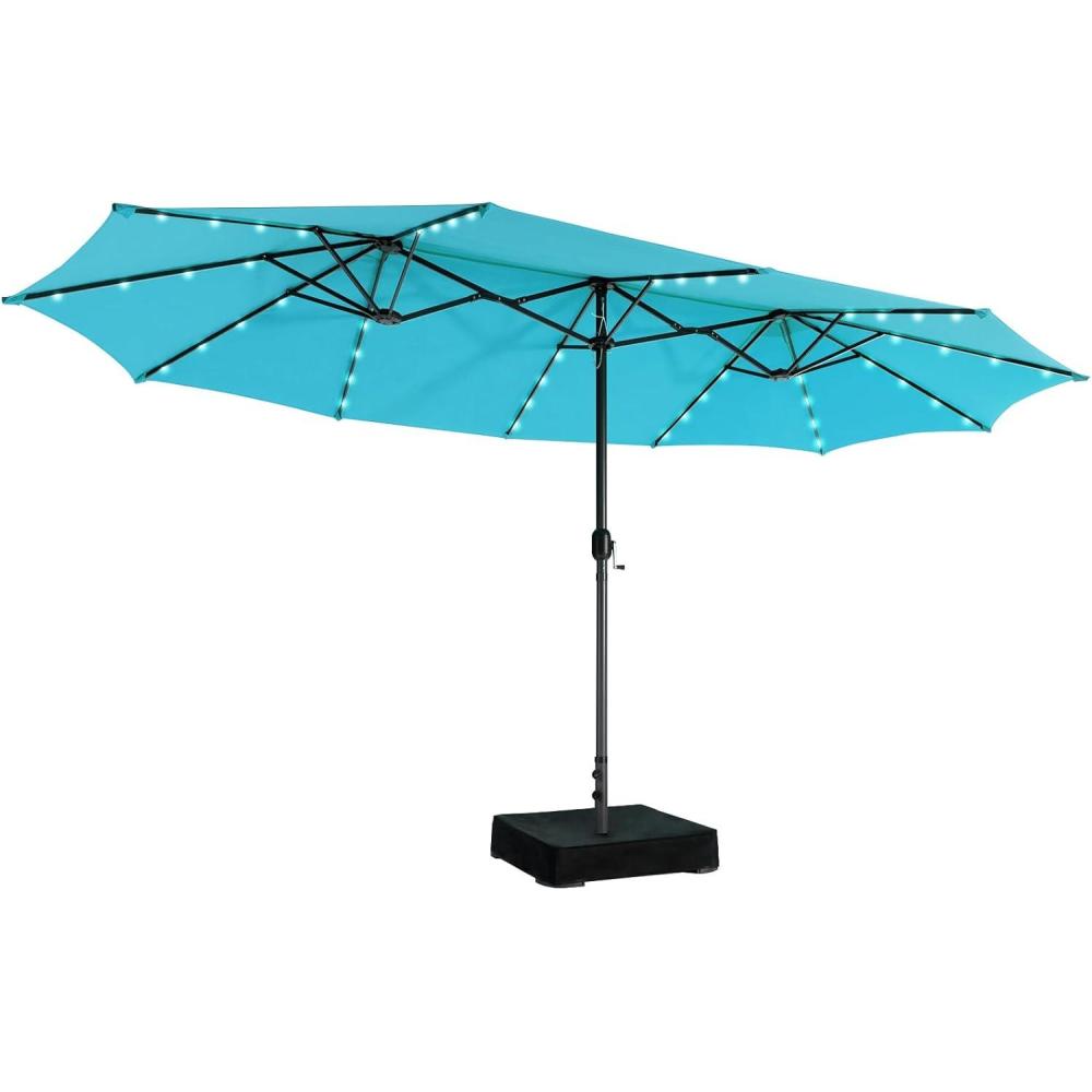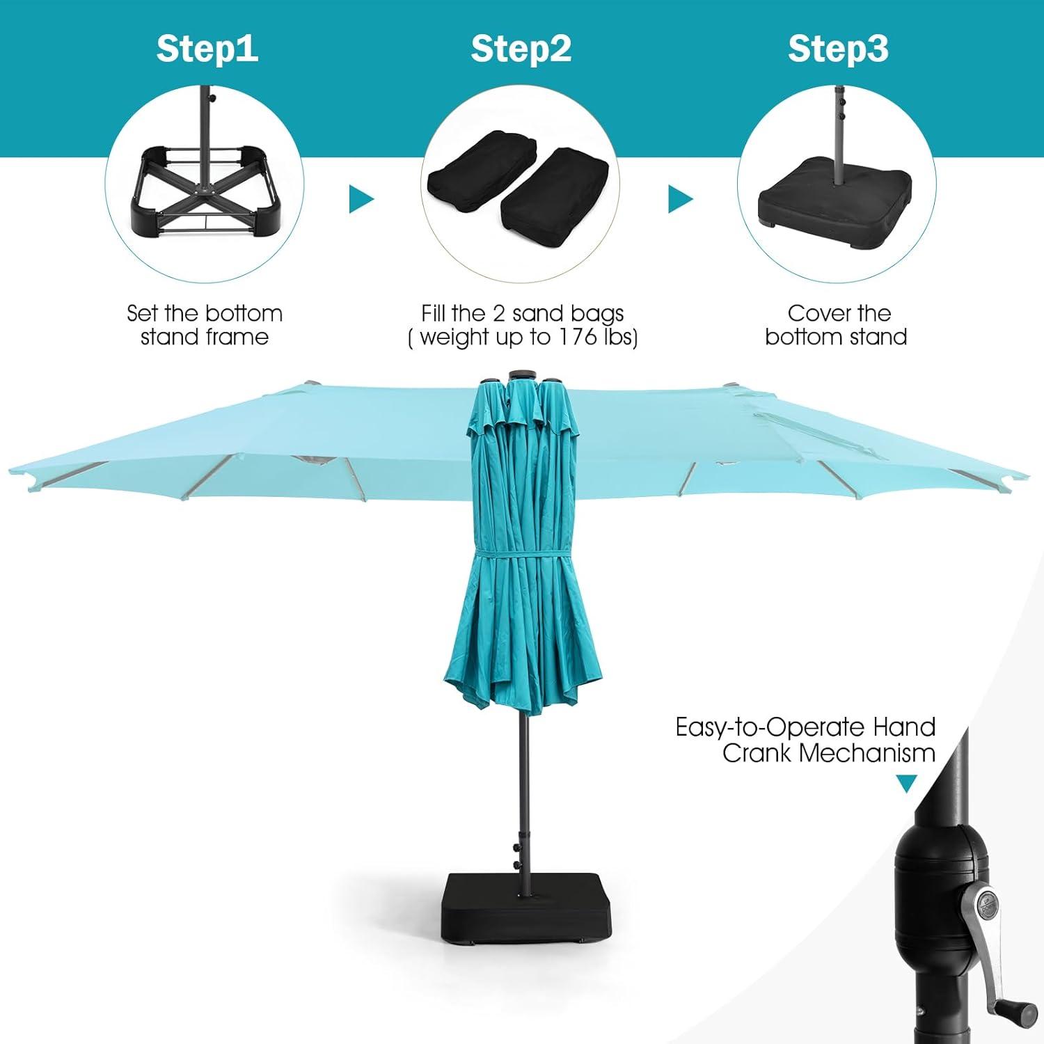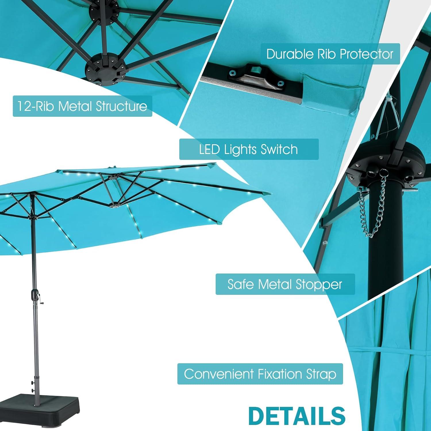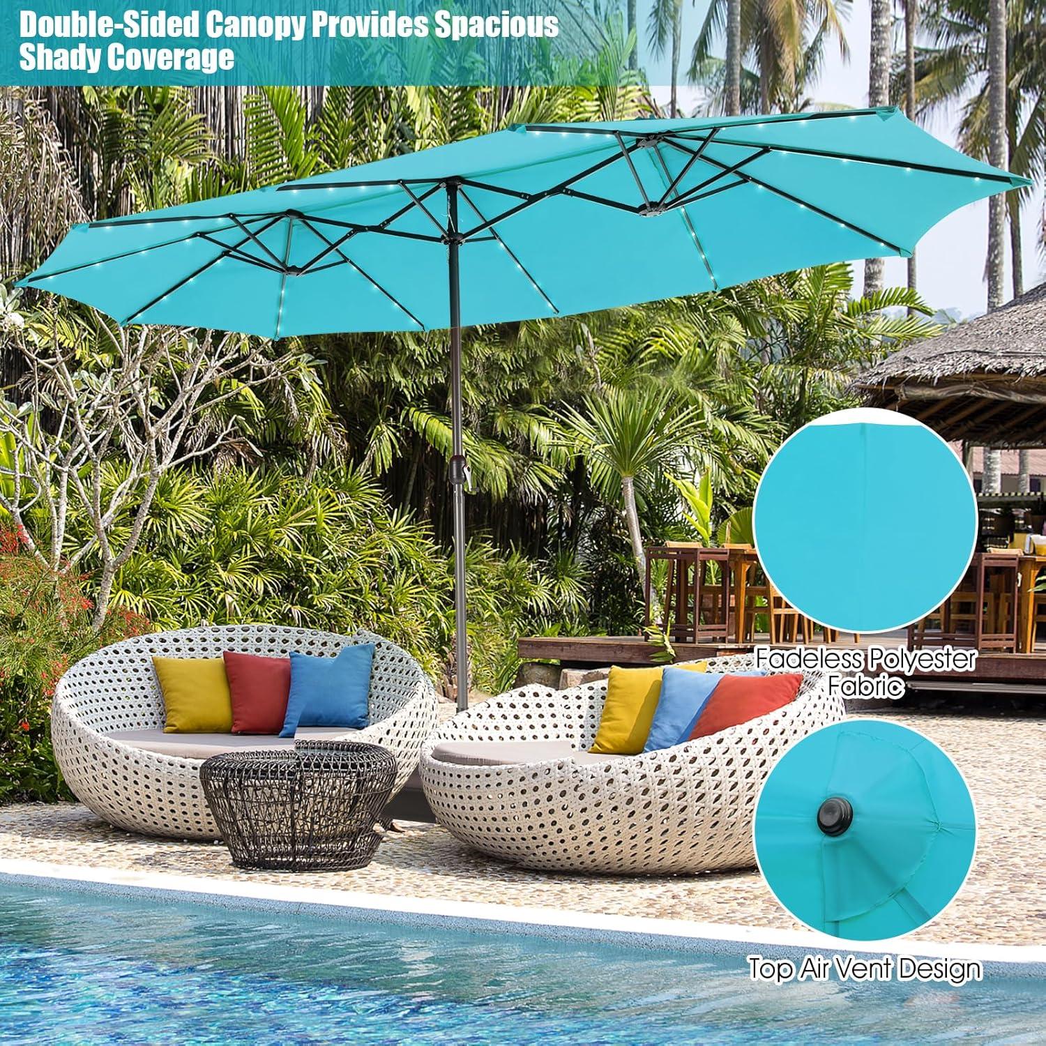 Giantex 15ft Large Outdoor Umbrella Double-Sided, 48 Solar Lights, Auto-Charging Solar Panel, Extra Large Patio Umbrella with Base and Crank, Outdoor Market Umbrellas for Poolside Garden(Turquoise)