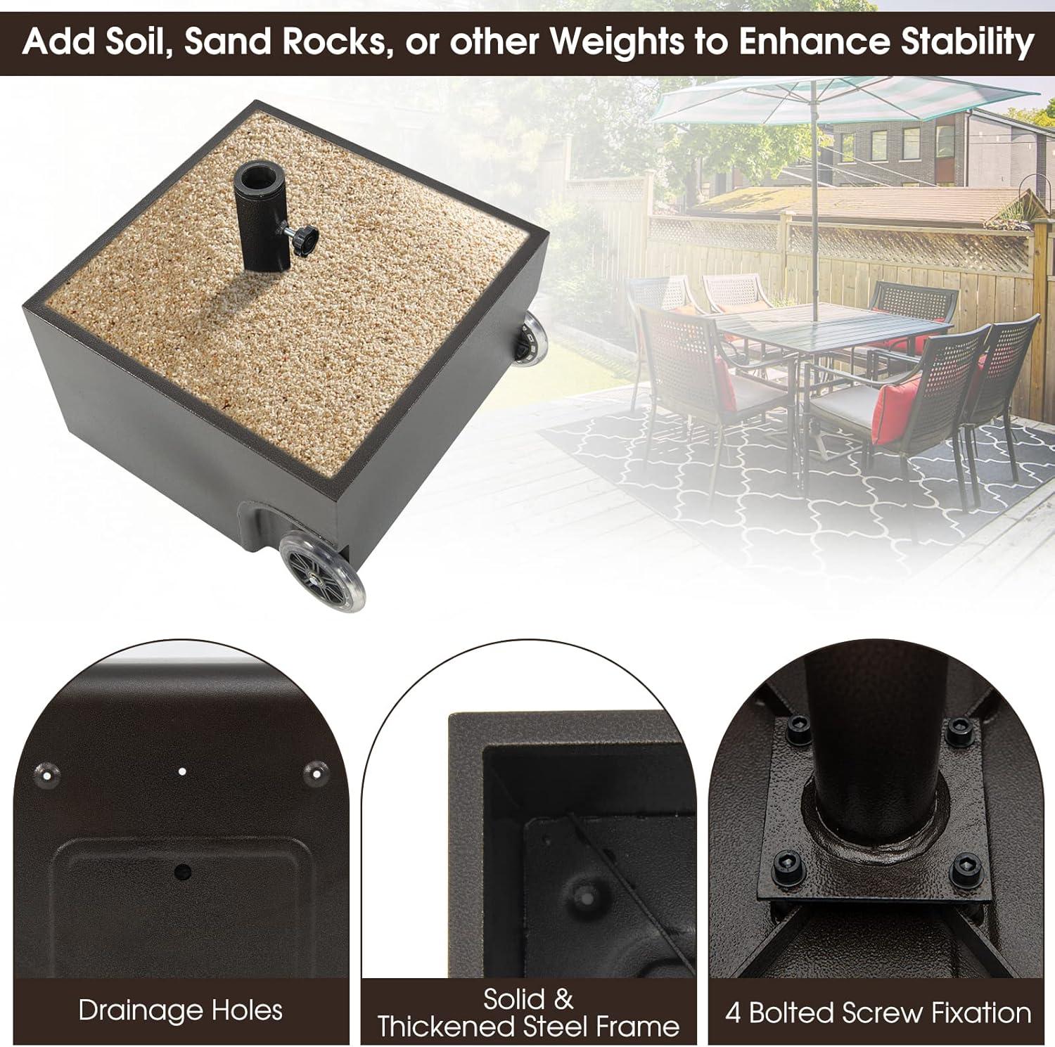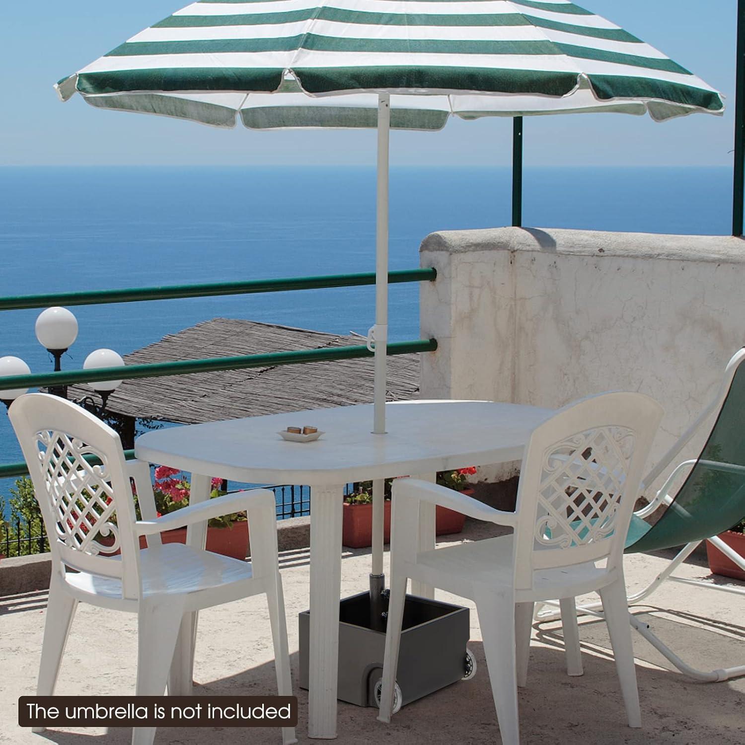 [Easy to Assemble]: The mobile umbrella base is quick and easy to set up, and all you need to do is putting the pole into the hole and using 4 bolted screws to fix it. Besides, we suggest adding soil, sand rocks, or other weights to enhance stability.