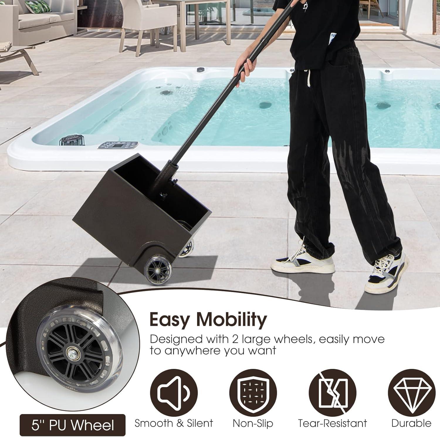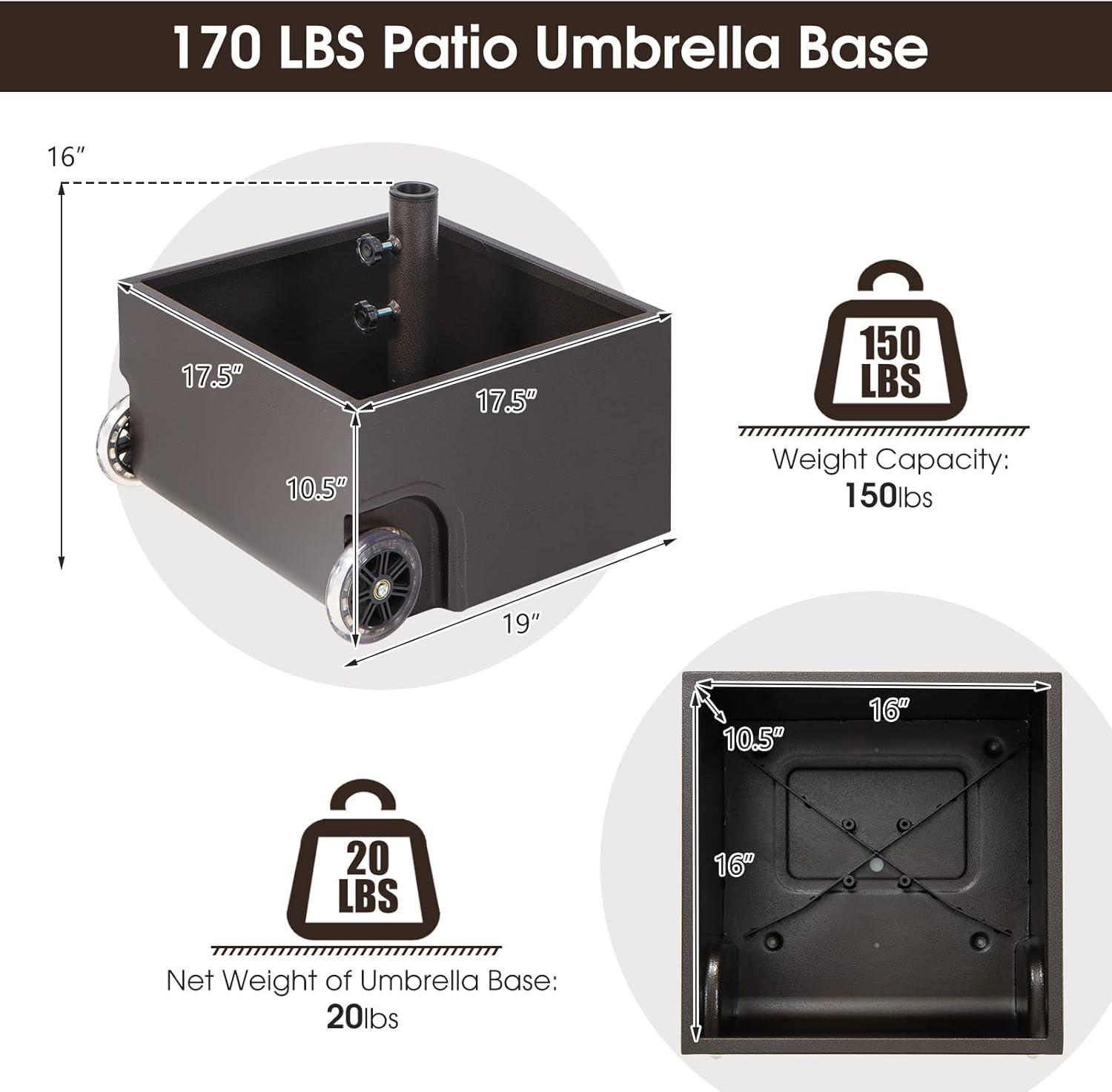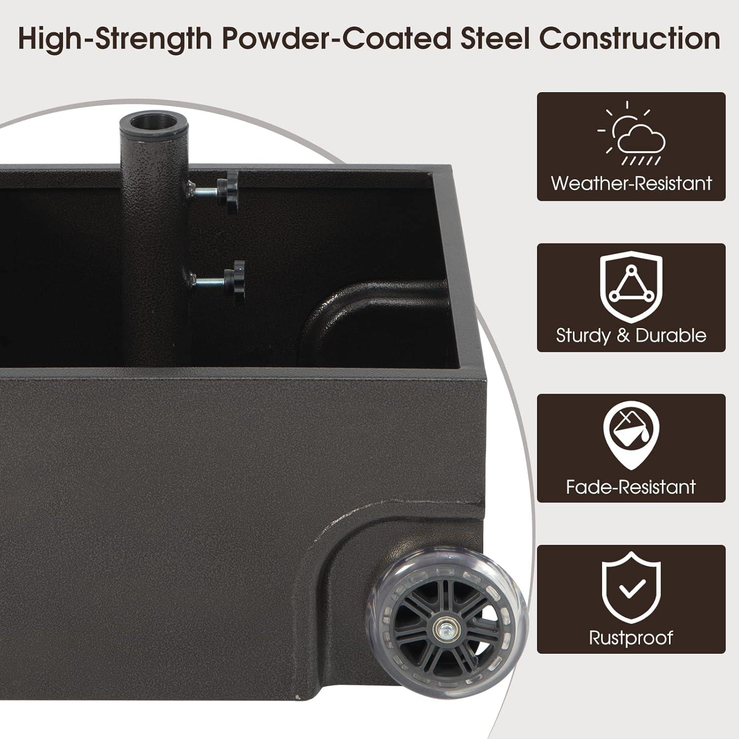 [Fillable Umbrella Base with Wheels]: The heavy duty umbrella stand can be weighted up to 170lbs when filled up. Equipped with 2 large wheels, the rolling umbrella stand can be easily moved anywhere you want. And the wheels are made of PU, which is tear-resistant and non-slip, ensuring a smooth and silent slide.