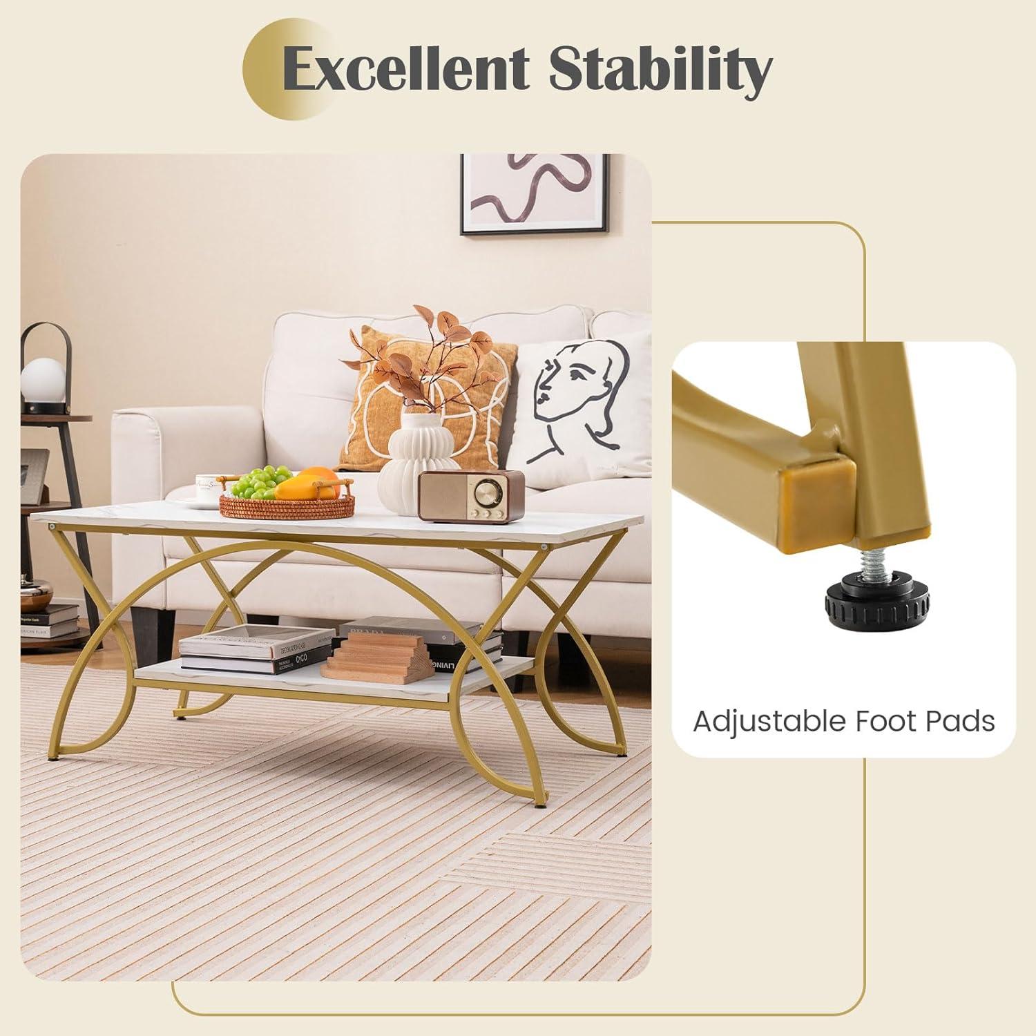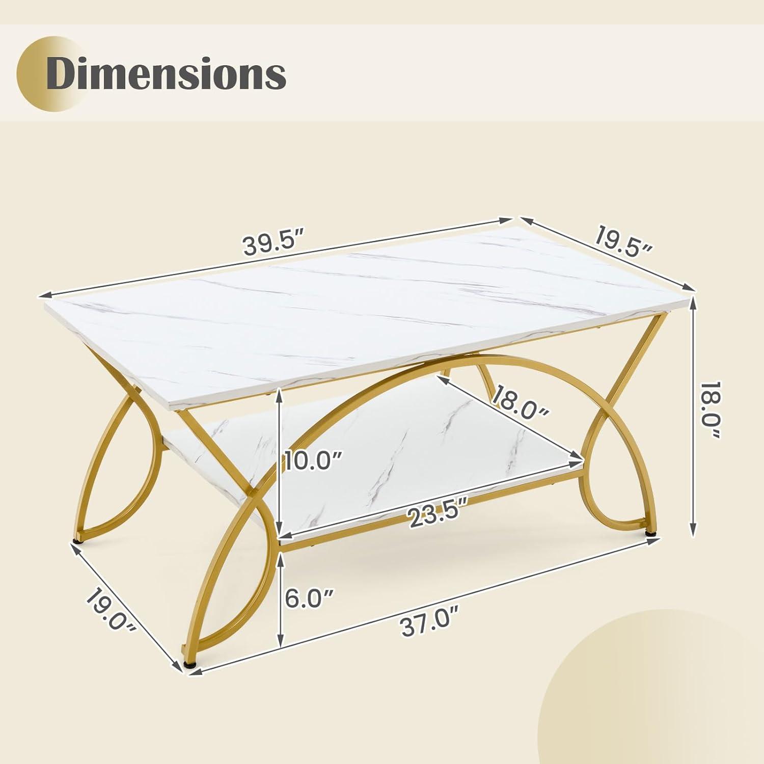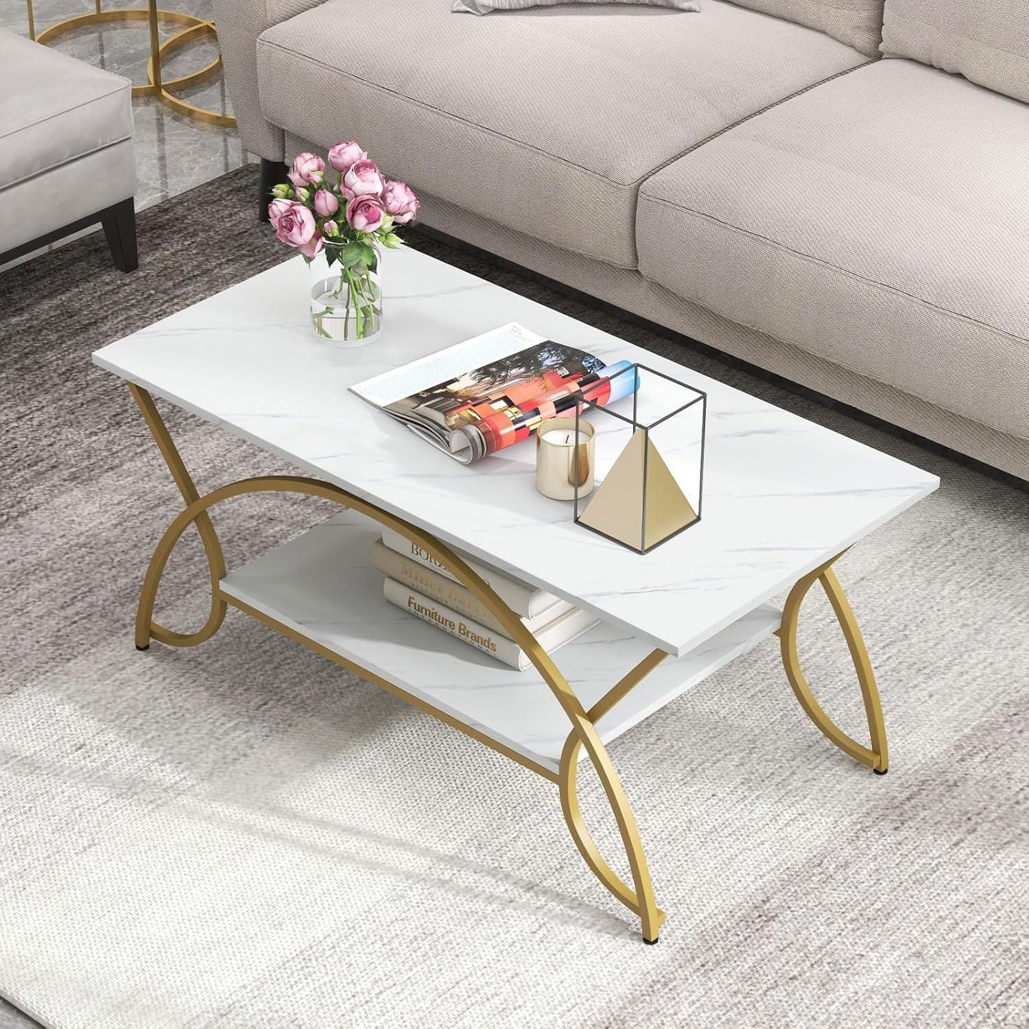 Giantex 2-Tier Rectangular Coffee Table, Wood Grain Table with Open Storage Shelf, Black Finished Metal Frame, Industrial Center Table for Living Room, Reception Room (Coffee)(White+gold)