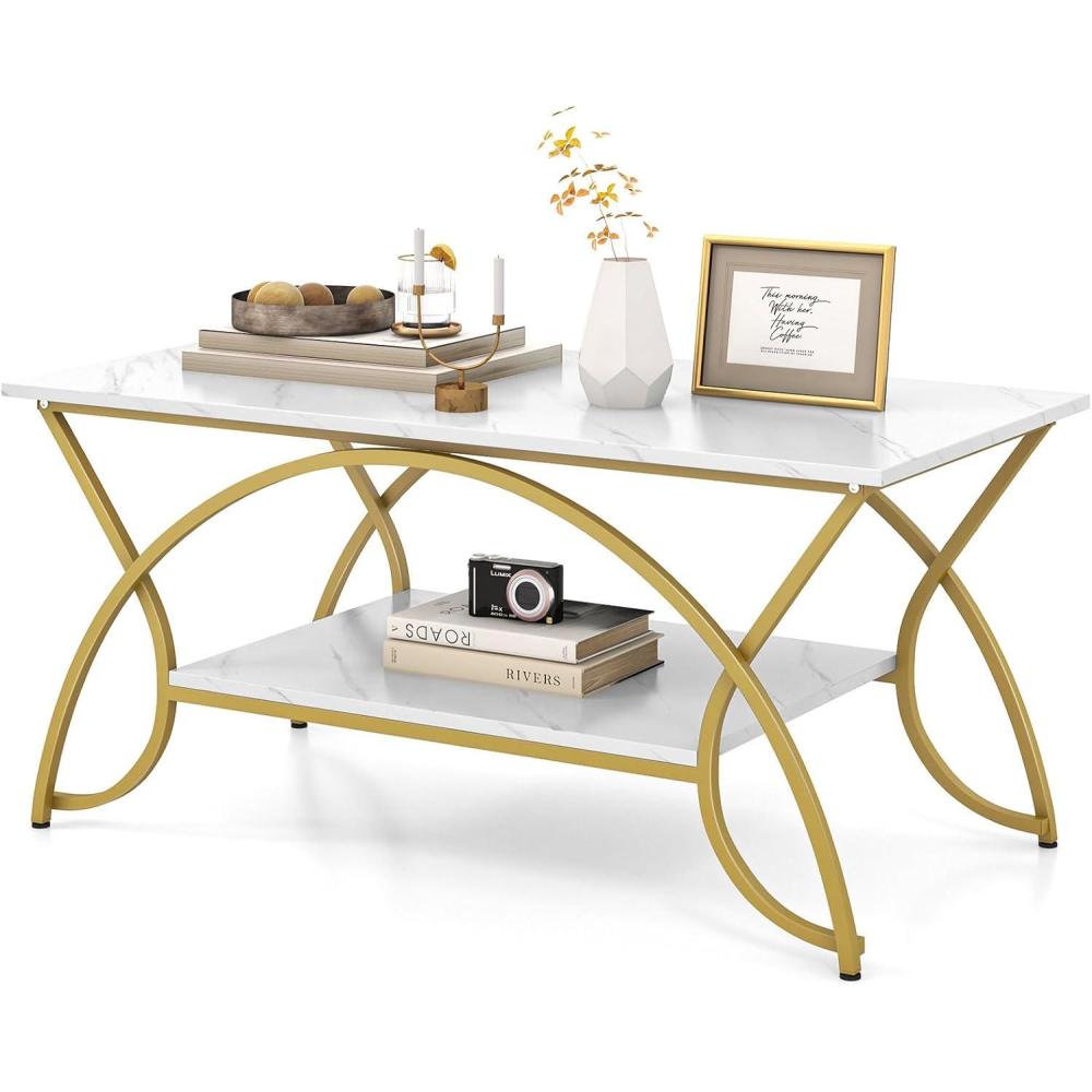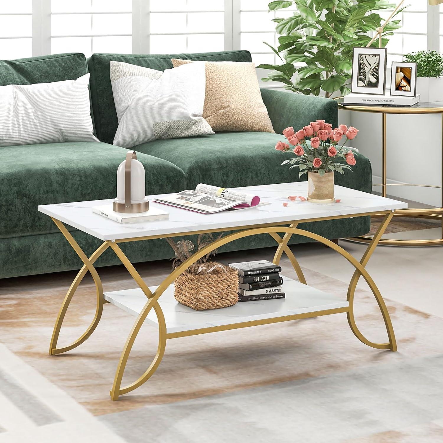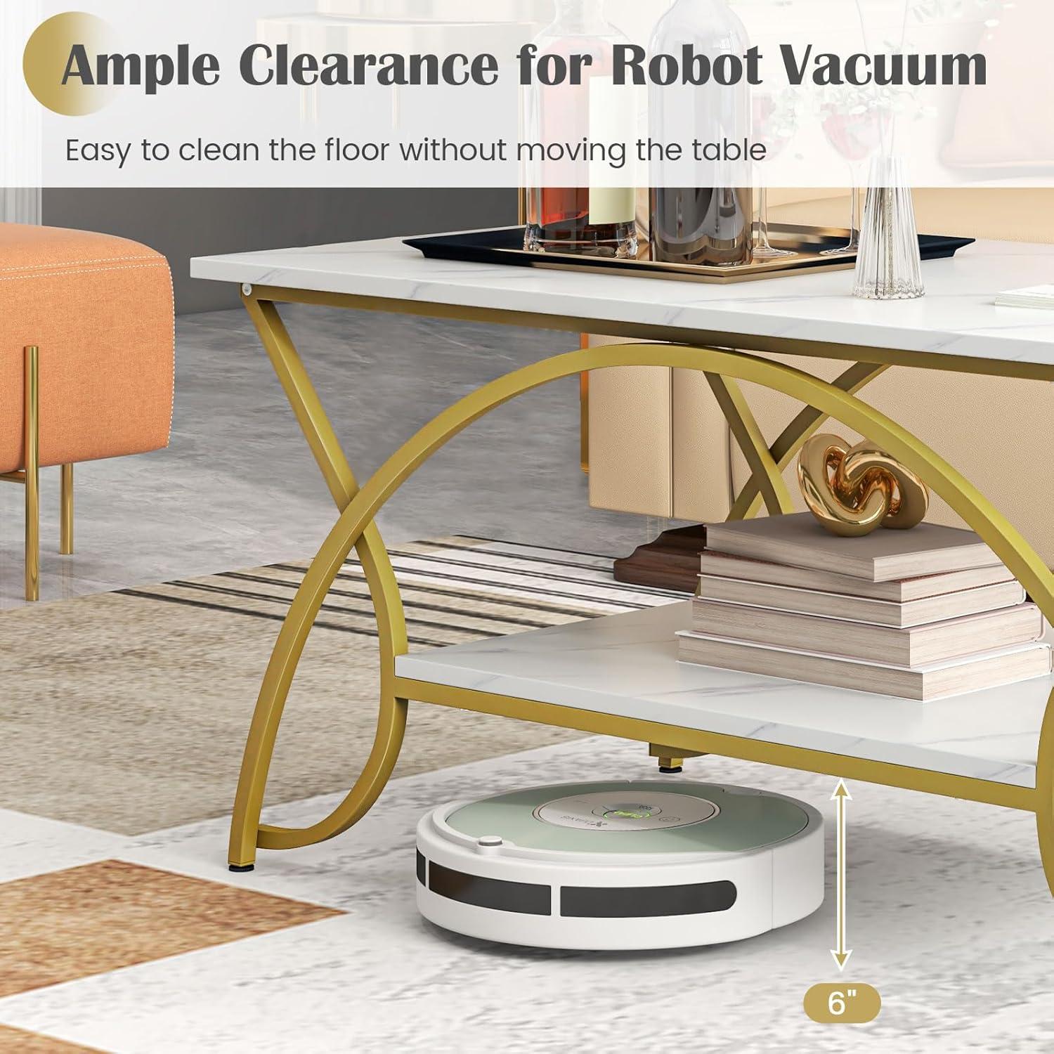 Giantex 2-Tier Rectangular Coffee Table, Wood Grain Table with Open Storage Shelf, Black Finished Metal Frame, Industrial Center Table for Living Room, Reception Room (Coffee)(White+gold)