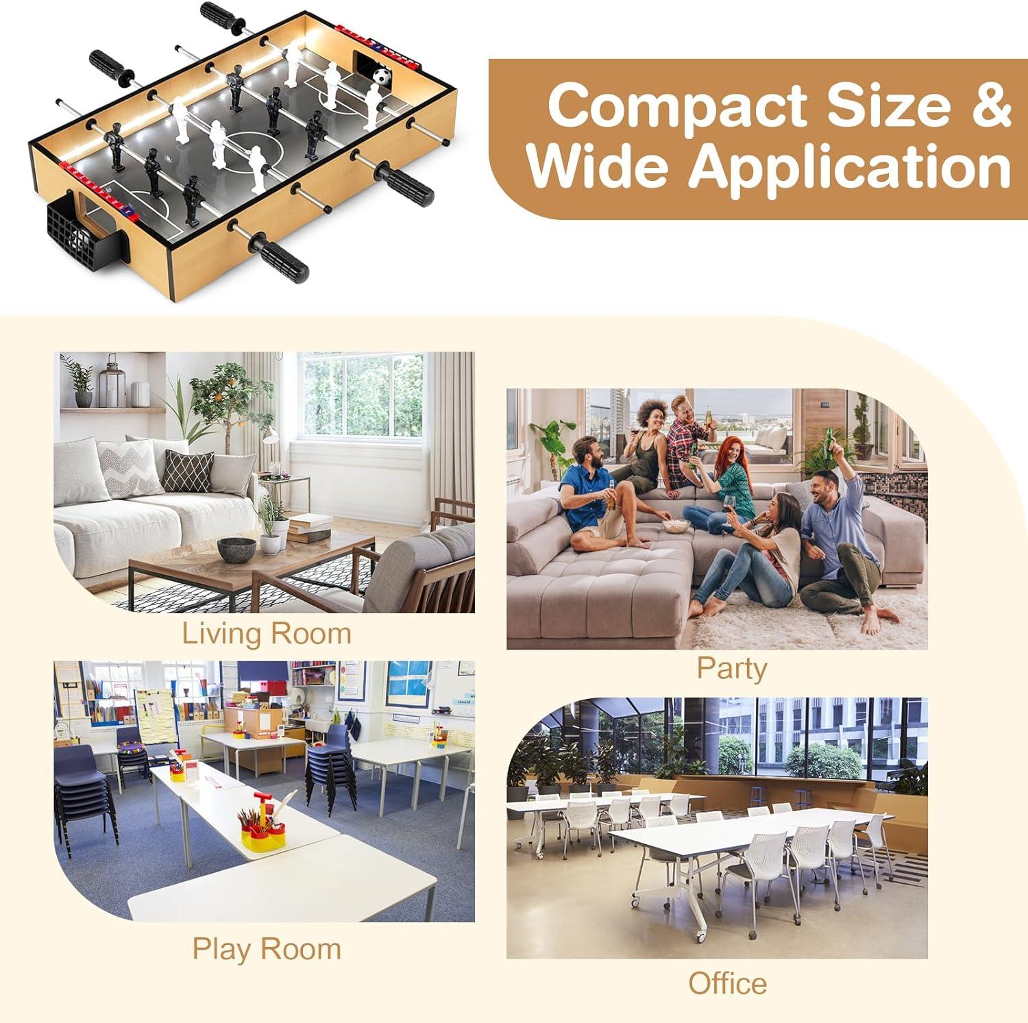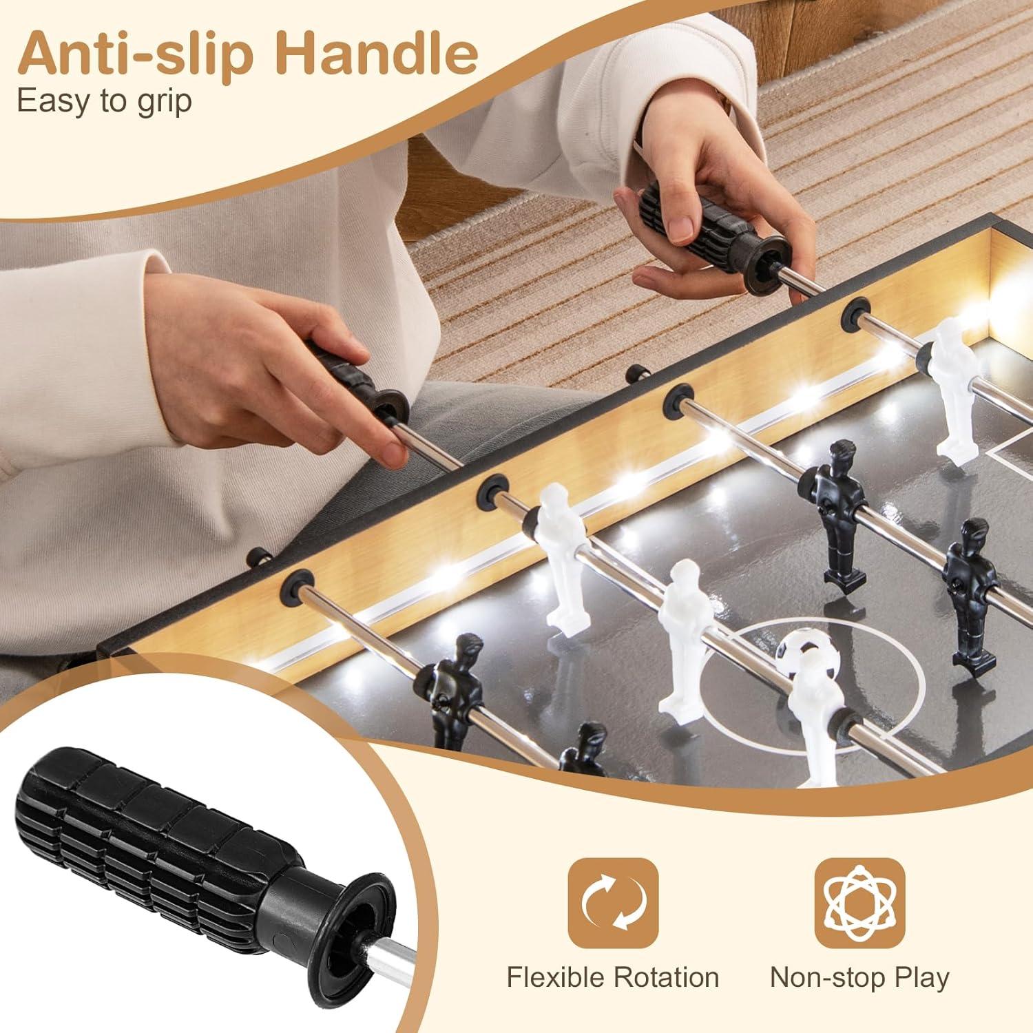 This football game table integrates dazzling LED lights to illuminate play, making each match more exciting. Featuring realistically designed players, 2 balls and anti-slip handles, the foosball table ensures enjoyable and controlled gameplay for everyone. The compact and lightweight design makes it suitable for varying spaces, such as the living room, play room, party, office and more. This foosball table serves as an inviting centerpiece for gatherings, creating memories and fostering friendly competition among kids and adults alike. Invite your friends and family to join in the fun!