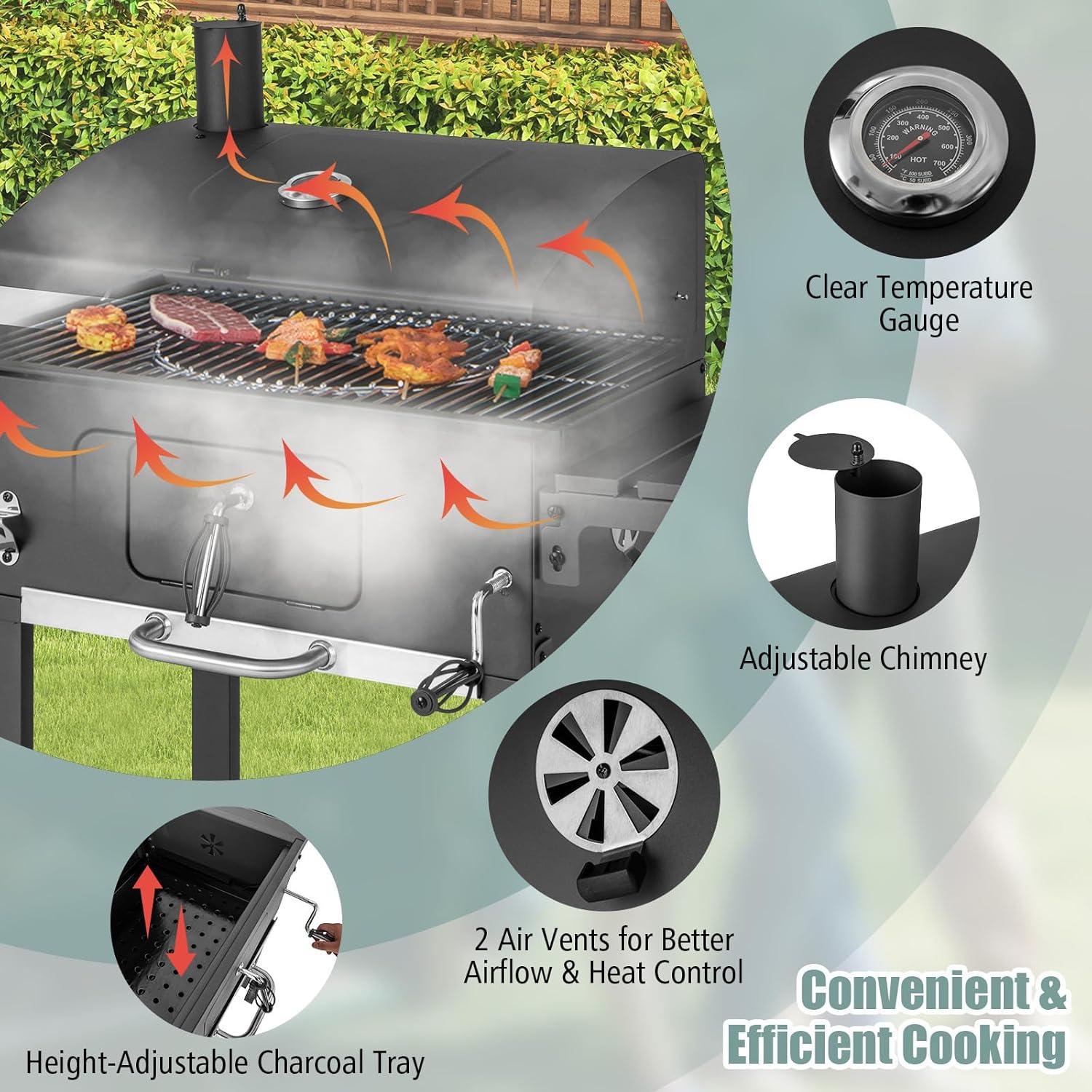 【Convenient & Efficient】: This BBQ grill features an adjustable chimney, height-adjustable charcoal tray, and 2 air vents for optimal airflow and heat control. Additionally, the lid-mounted temperature gauge allows for easy monitoring of the inside temperature.