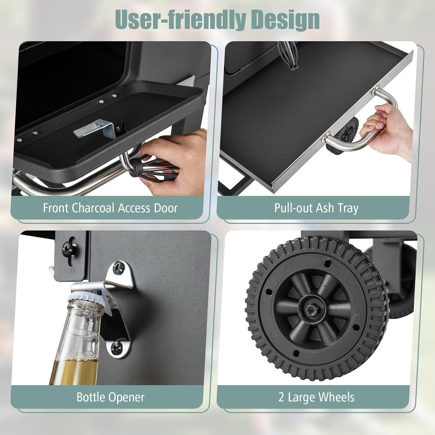 【User-friendly Design】: This barbecue charcoal grill is designed with a front charcoal access door featuring an anti-scalding handle, making it easy and safe to add charcoal while cooking. Additionally, it is equipped with a convenient bottle opener for added functionality.