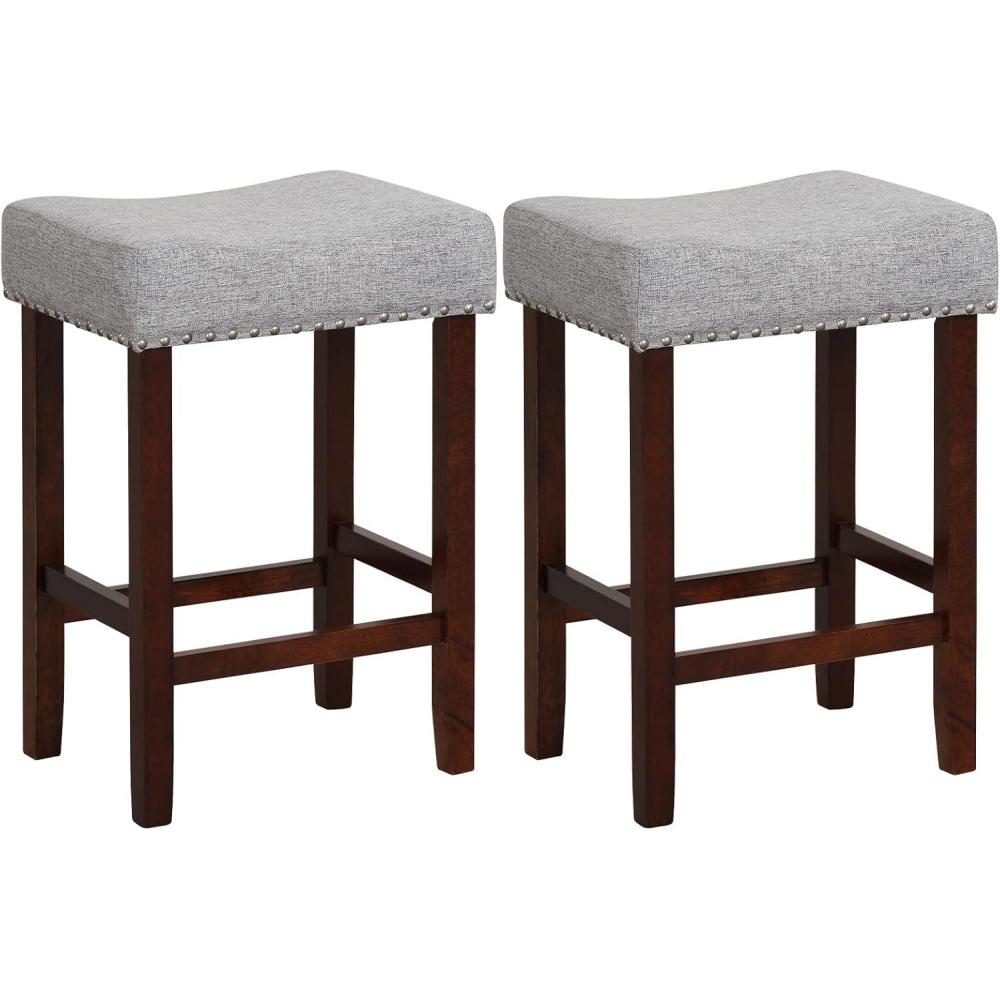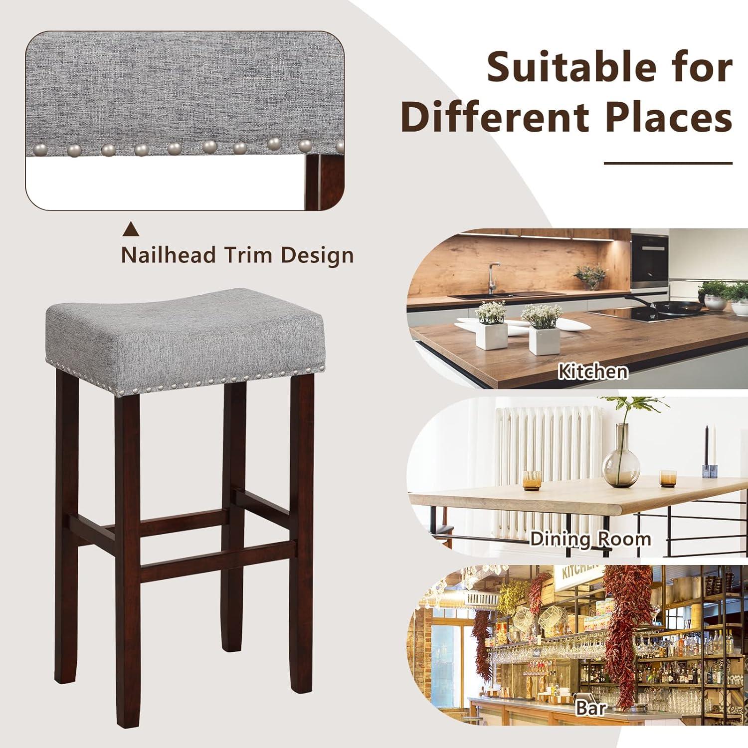 Giantex 25" Counter Height Bar Stools Set of 2 - Backless Saddle Barstools with Nailhead Linen Foam Seat, Max Load 330 Lbs Wood Bar Stools with Foot Rest for Kitchen Island, Khaki(Grey)