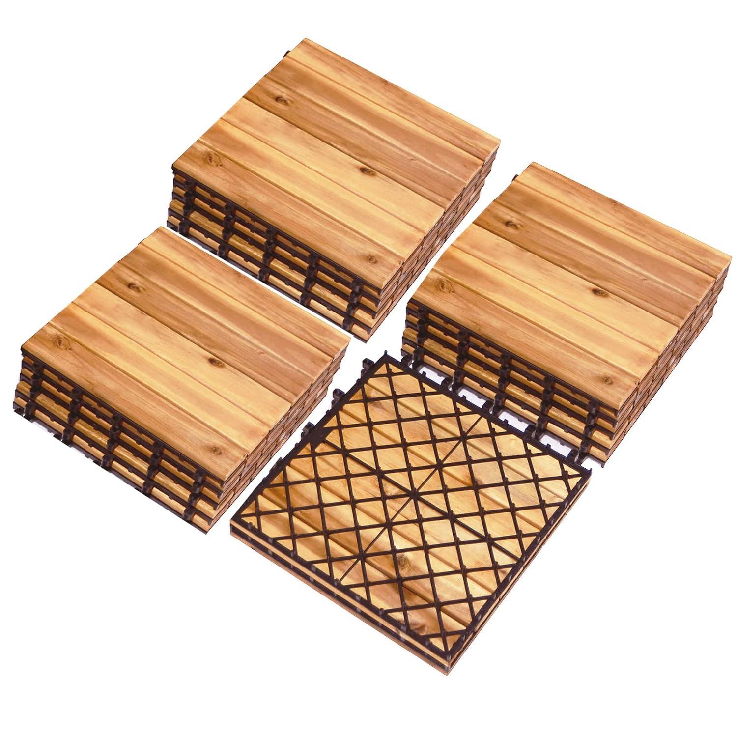 【Freely DIY Your Floor】: Unlike the traditional fixed floor tiles, this wood interlocking floor tiles can be freely spliced as you wish, updating the deck layouts for an optimal new look to get the mood strikes. Exquisite acacia wood texture transmit natural and fresh flavor, aiming to build a relaxing area for enjoying peace of mind. (Notice: Because of different product batches, the color of 27 PCS Interlocking Patio Deck Tiles maybe a little different from 10pcs and 20pcs).