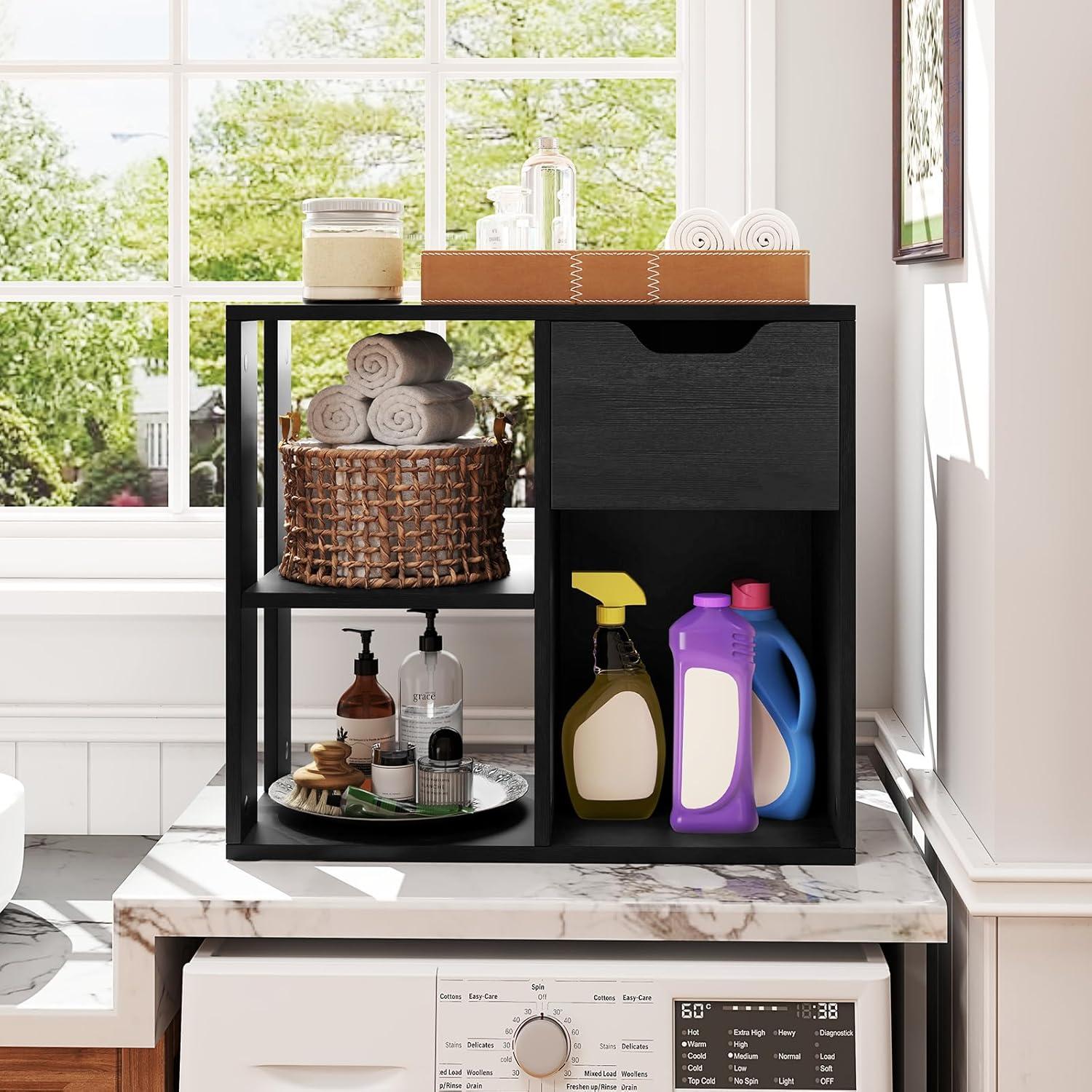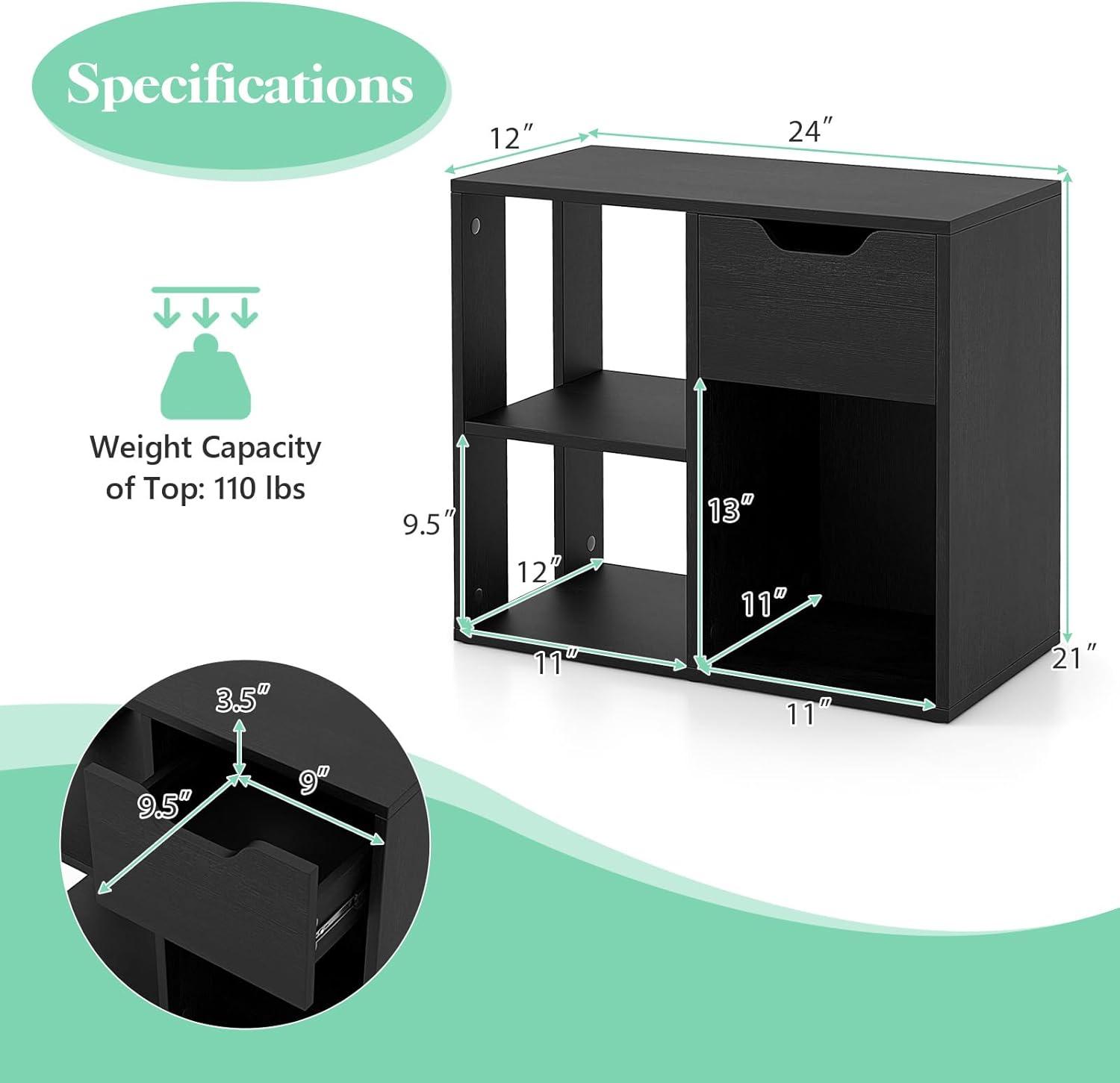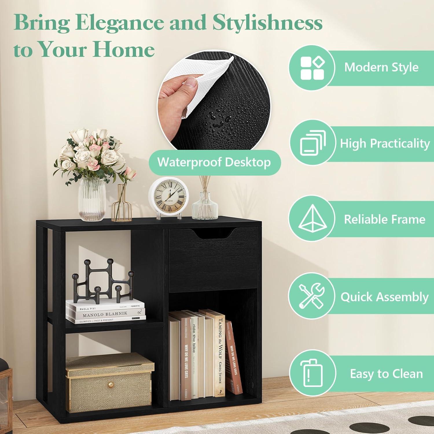Giantex 3 Cube Bookcase with Drawer, 2 Tier Bookshelf for Small Spaces, Modern Freestanding Display Rack with Open Shelves, Book Case, Wood Cube Storage Organizer Bedroom Living Room, Black(Black)