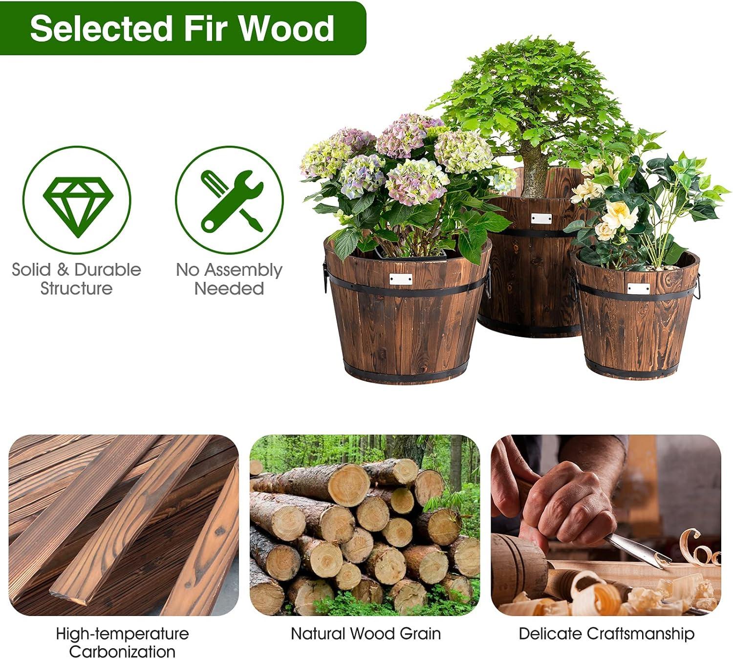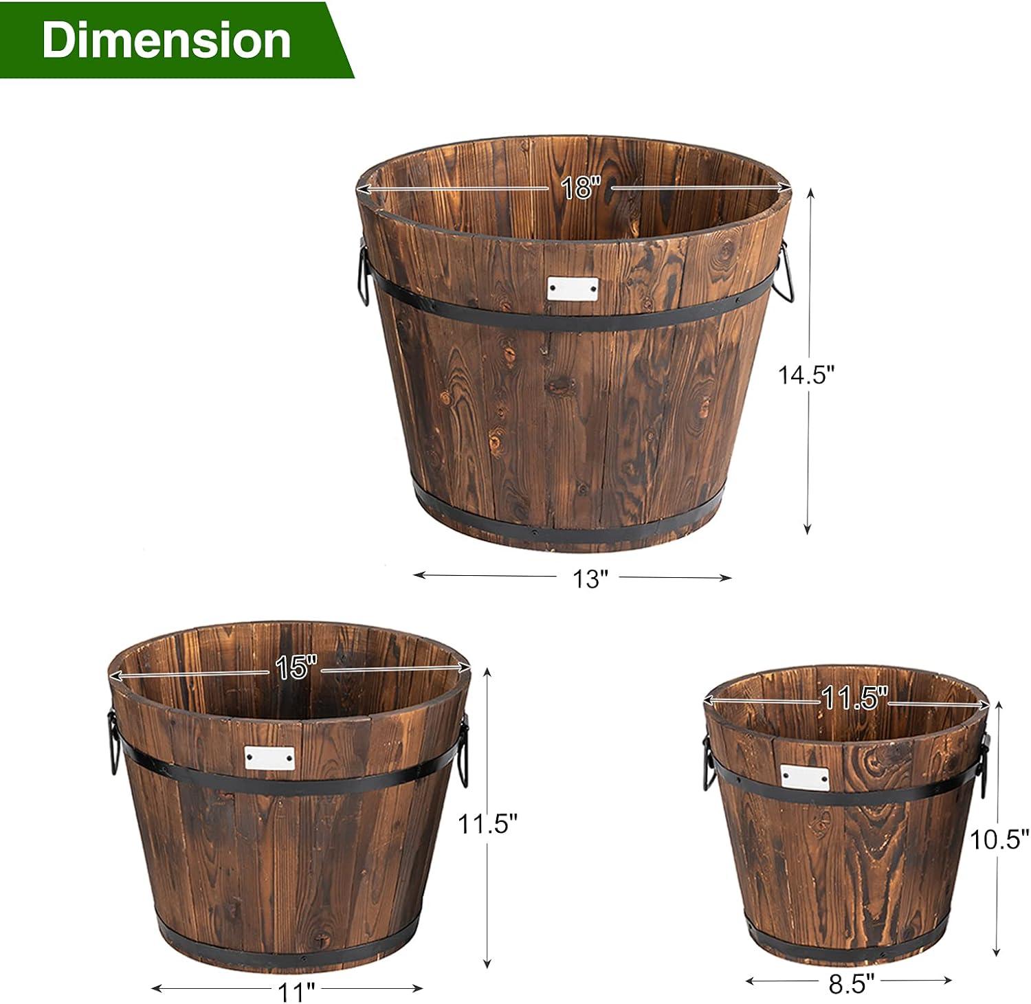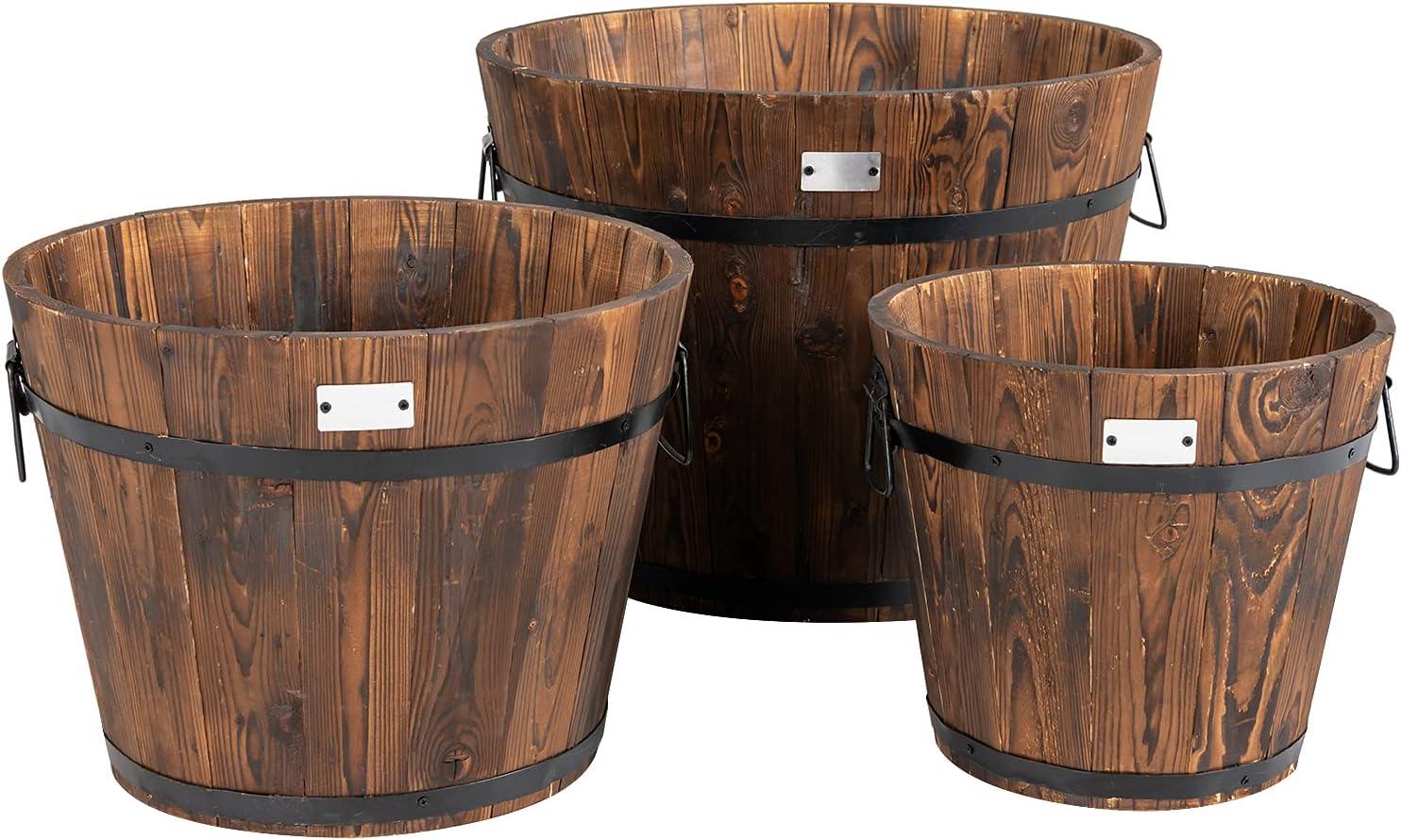 Giantex 3 Pieces Barrel Planter, Wood Bucket Raised Beds for Plants Herbs Veggies, Indoor Outdoor Decorative Planter Box with Drainage Holes 3 Sizes