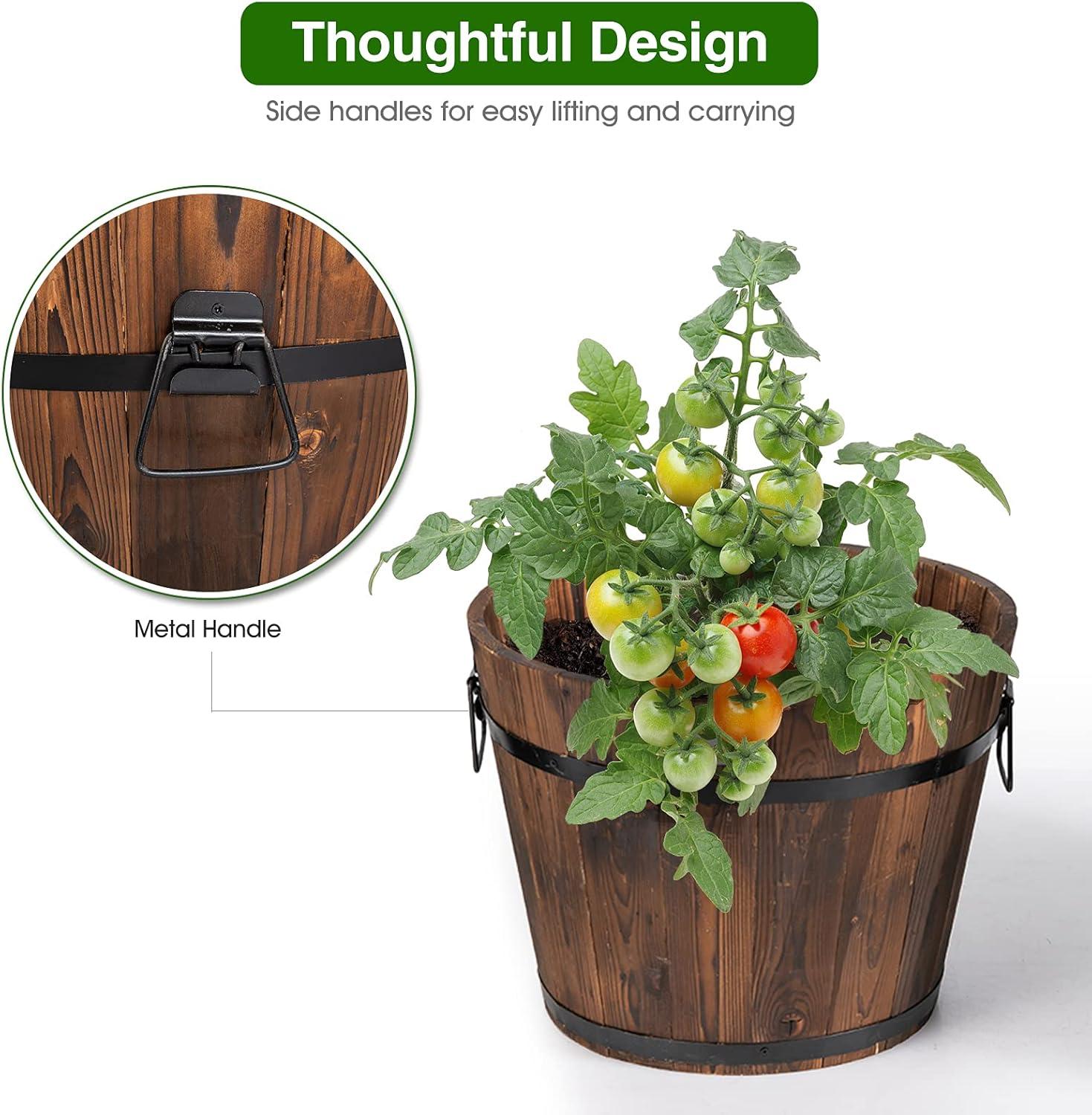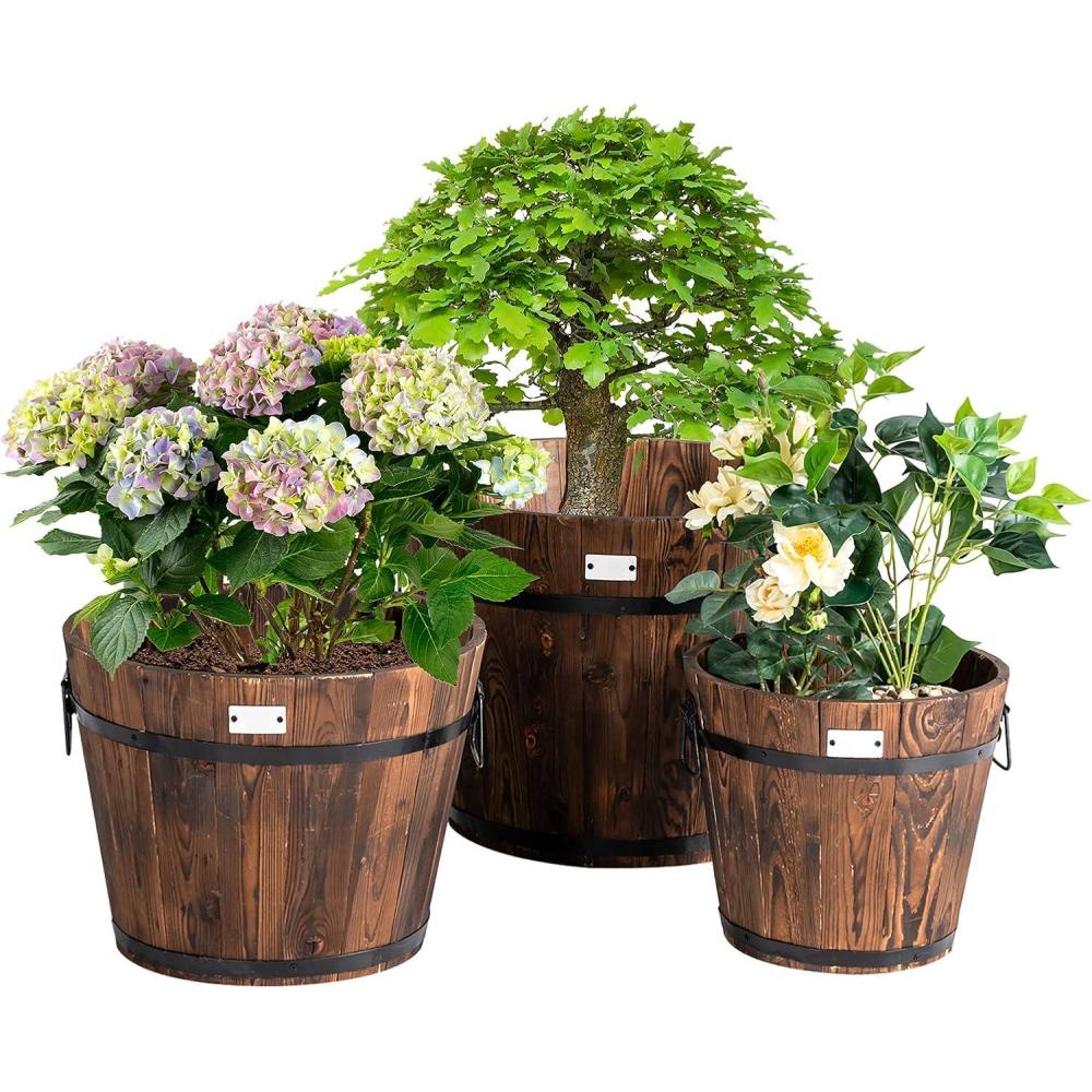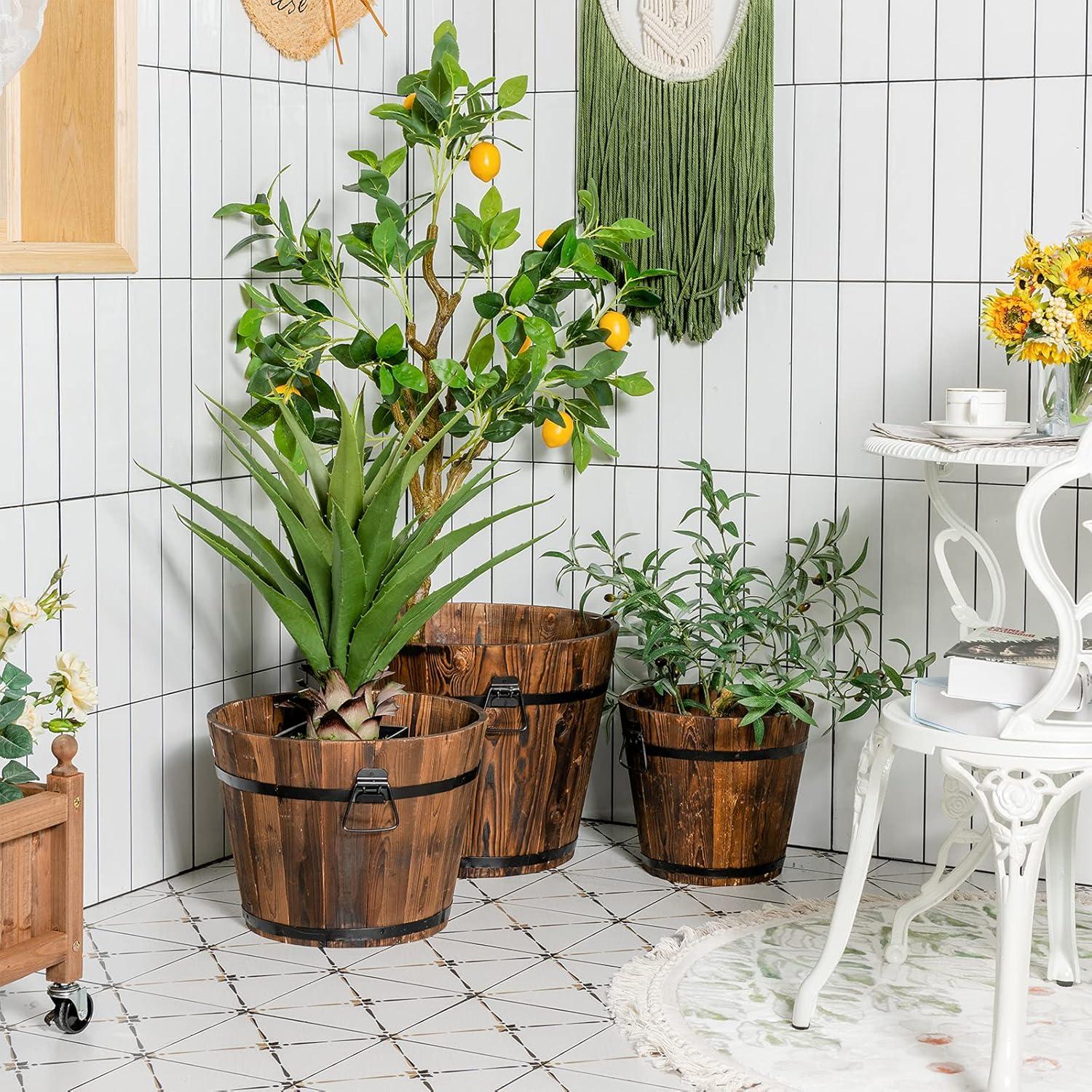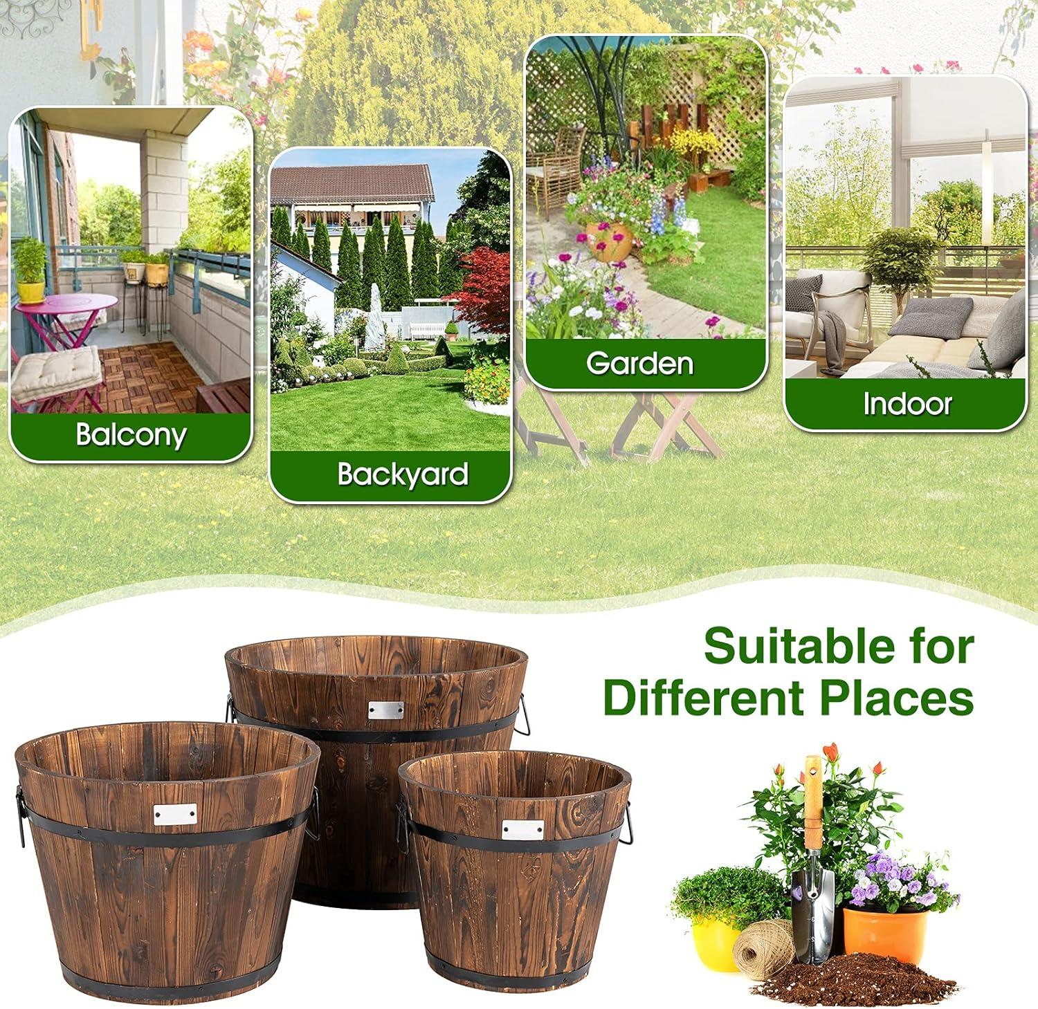 Giantex 3 Pieces Barrel Planter, Wood Bucket Raised Beds for Plants Herbs Veggies, Indoor Outdoor Decorative Planter Box with Drainage Holes 3 Sizes