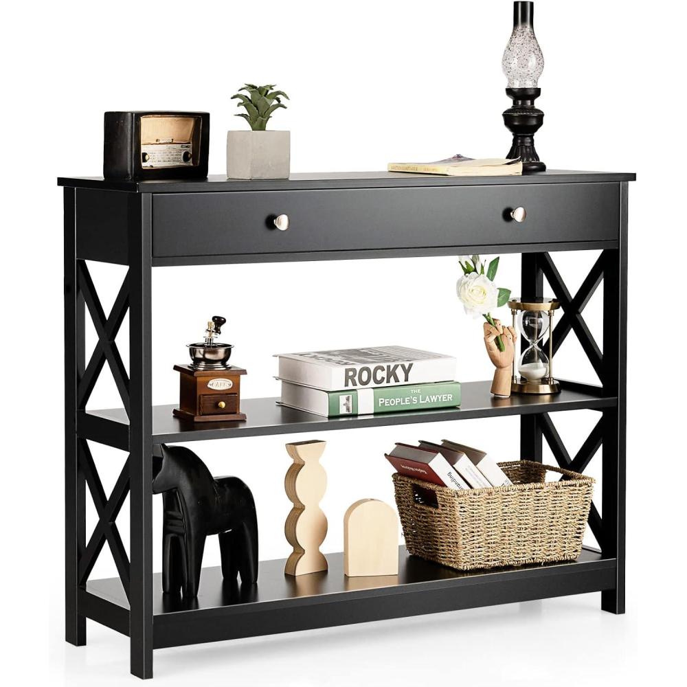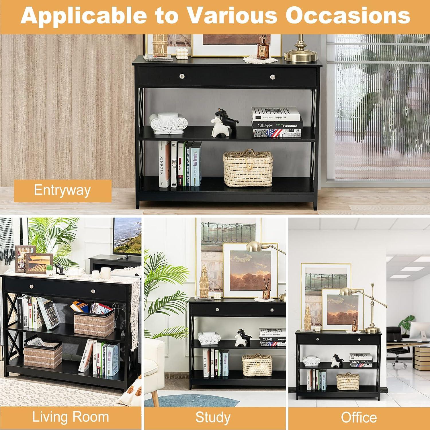 Giantex 3-Tier Console Table with Drawers, Narrow Entryway Table w/Storage Shelves, X-Design Sofa Side Tables for Hallway, Modern Entry Tables for Foyer Living Room Bedroom (Black)(Black)