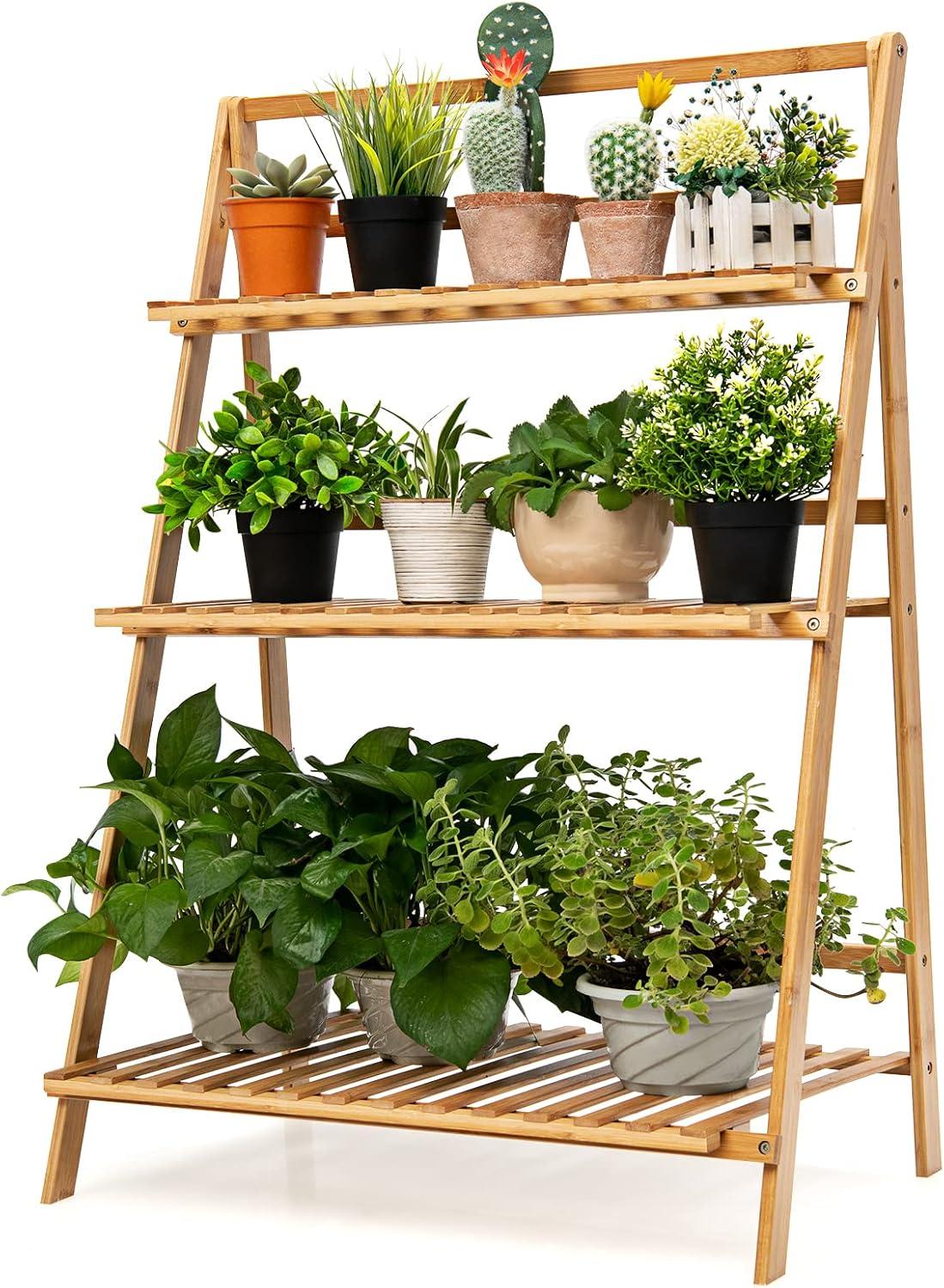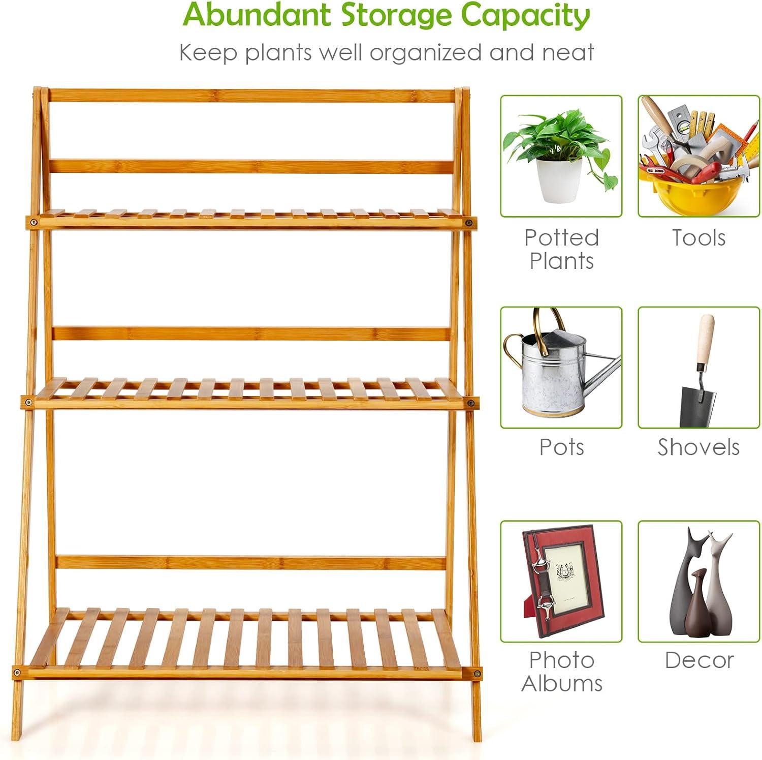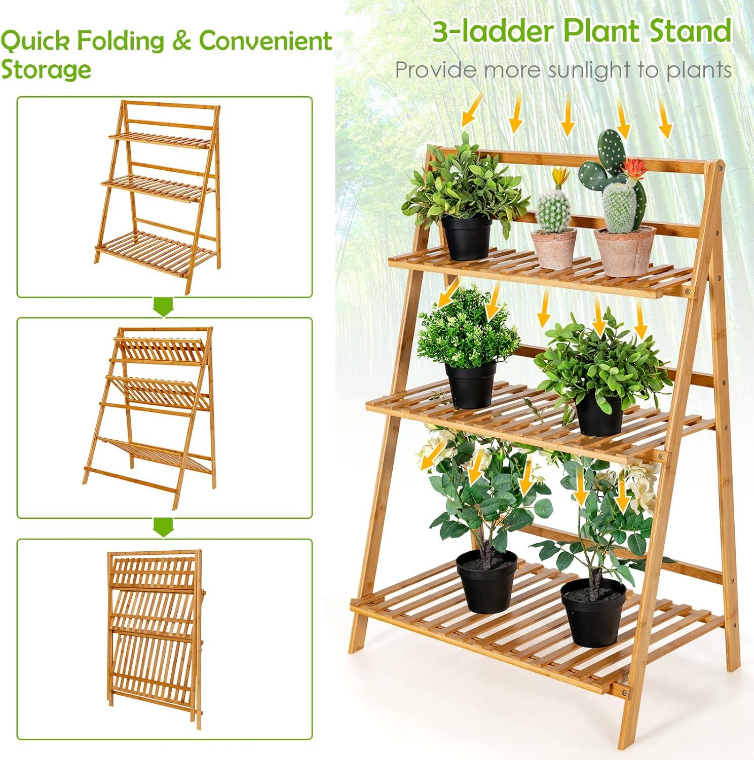 Giantex 3 Tier Folding Storage Shelf, Bamboo Ladder Plant Stand, Multiple Flower Pot Holder Succulent Display Rack, Foldable Shelving Unit for Balcony Garden Living Room Indoor Outdoor