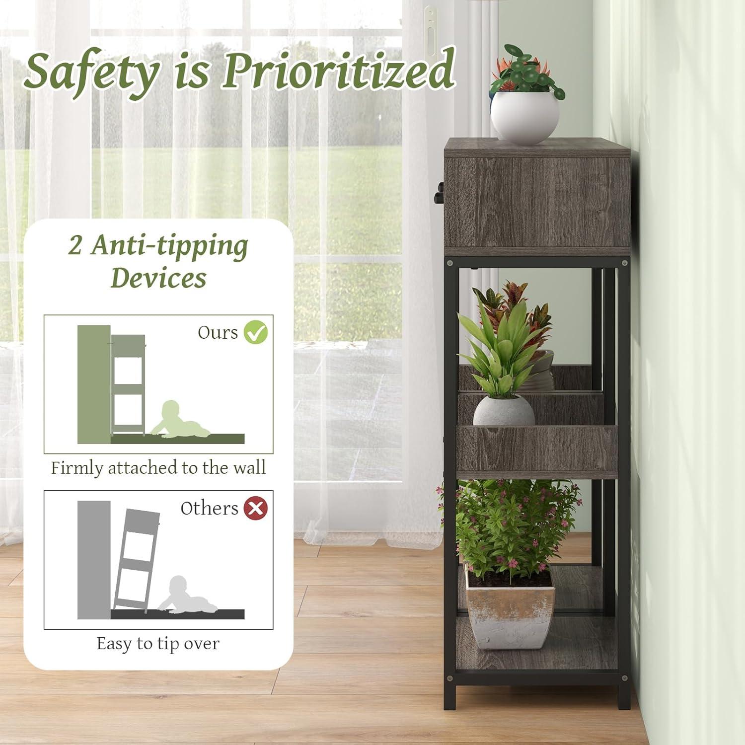 Boasting 3 open shelves, the corner plant stand offers a chic solution to showcase your beloved potted plants. The included drawer adds functionality, serving as a tidy spot for storing essential gardening tools or treasured decorations. Therefore, the versatile piece can double as a display shelf. Equipped with 2 anti-tipping devices, you can secure the stand to the wall for enhanced safety. Featuring powder-coated metal frame and non-slip pads, the versatile 3-tier plant shelf guarantees unwavering steadiness while safeguarding your floors from scratches. Adorned with a striking simulated wood grain finish, the plant table is a space-saving option for any balcony, living room or apartment setting.